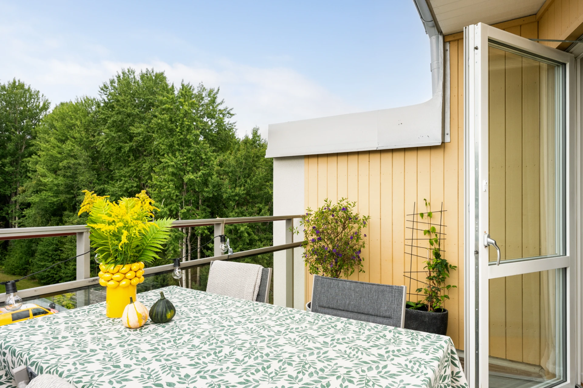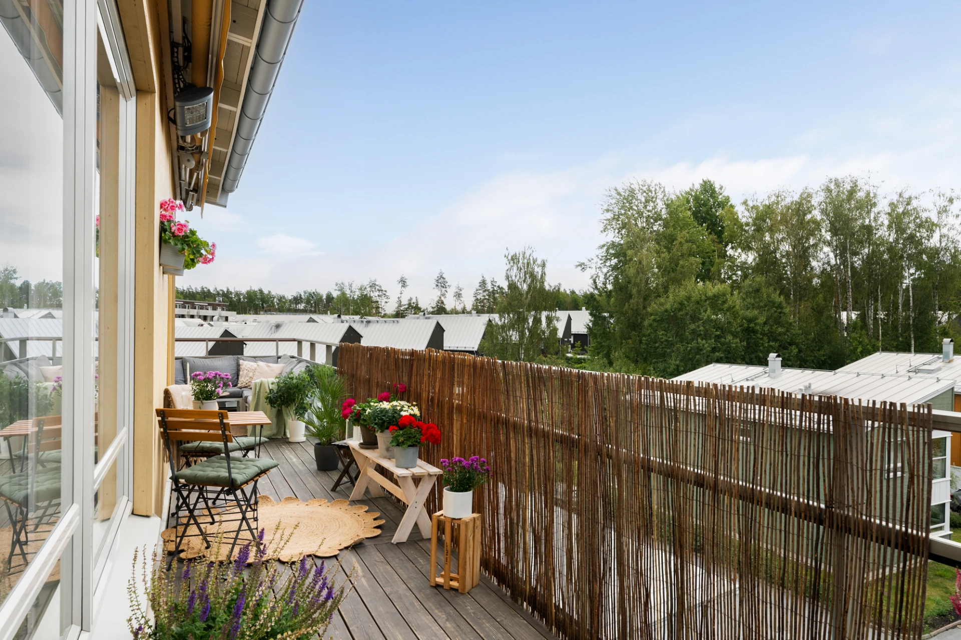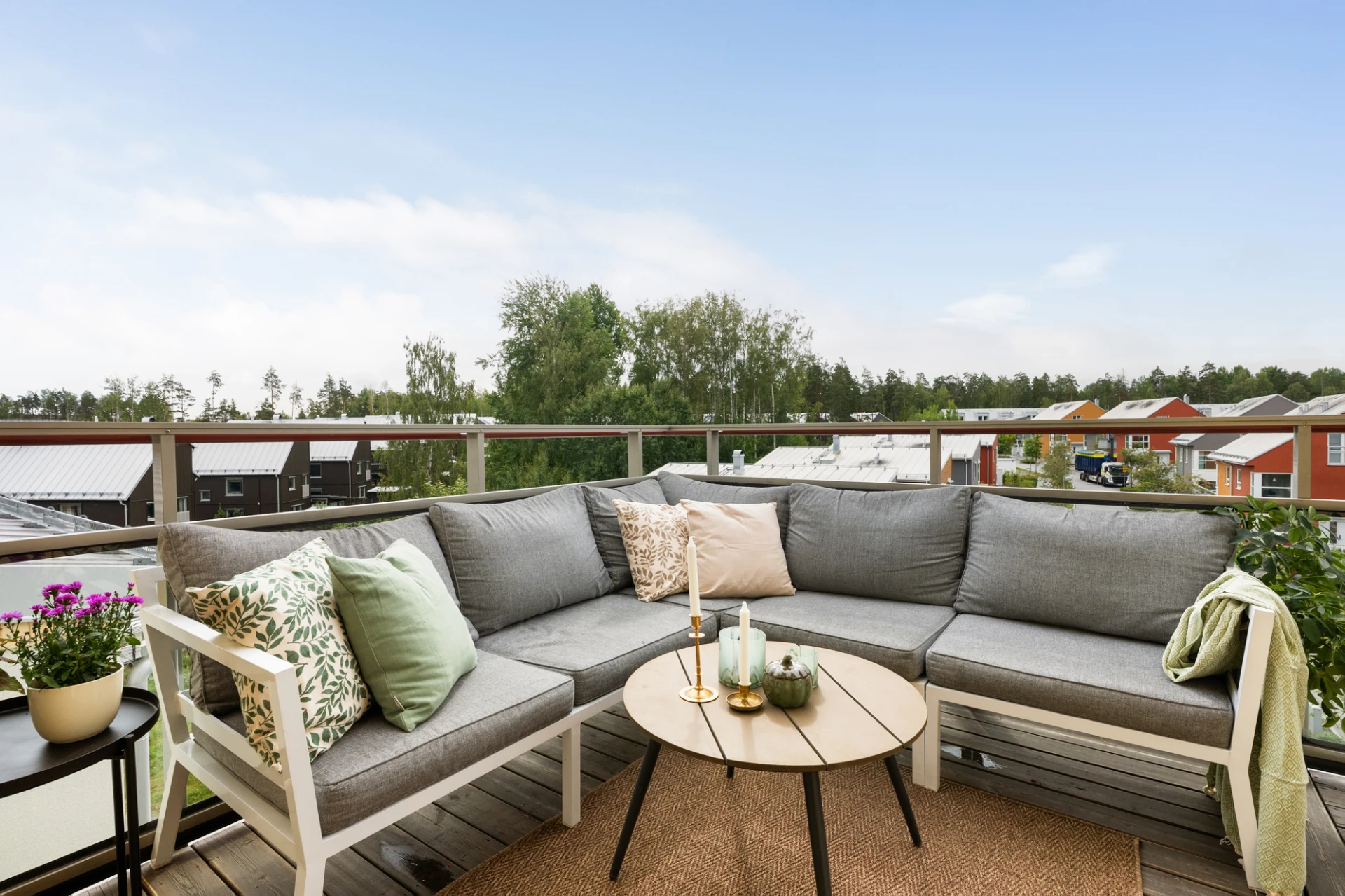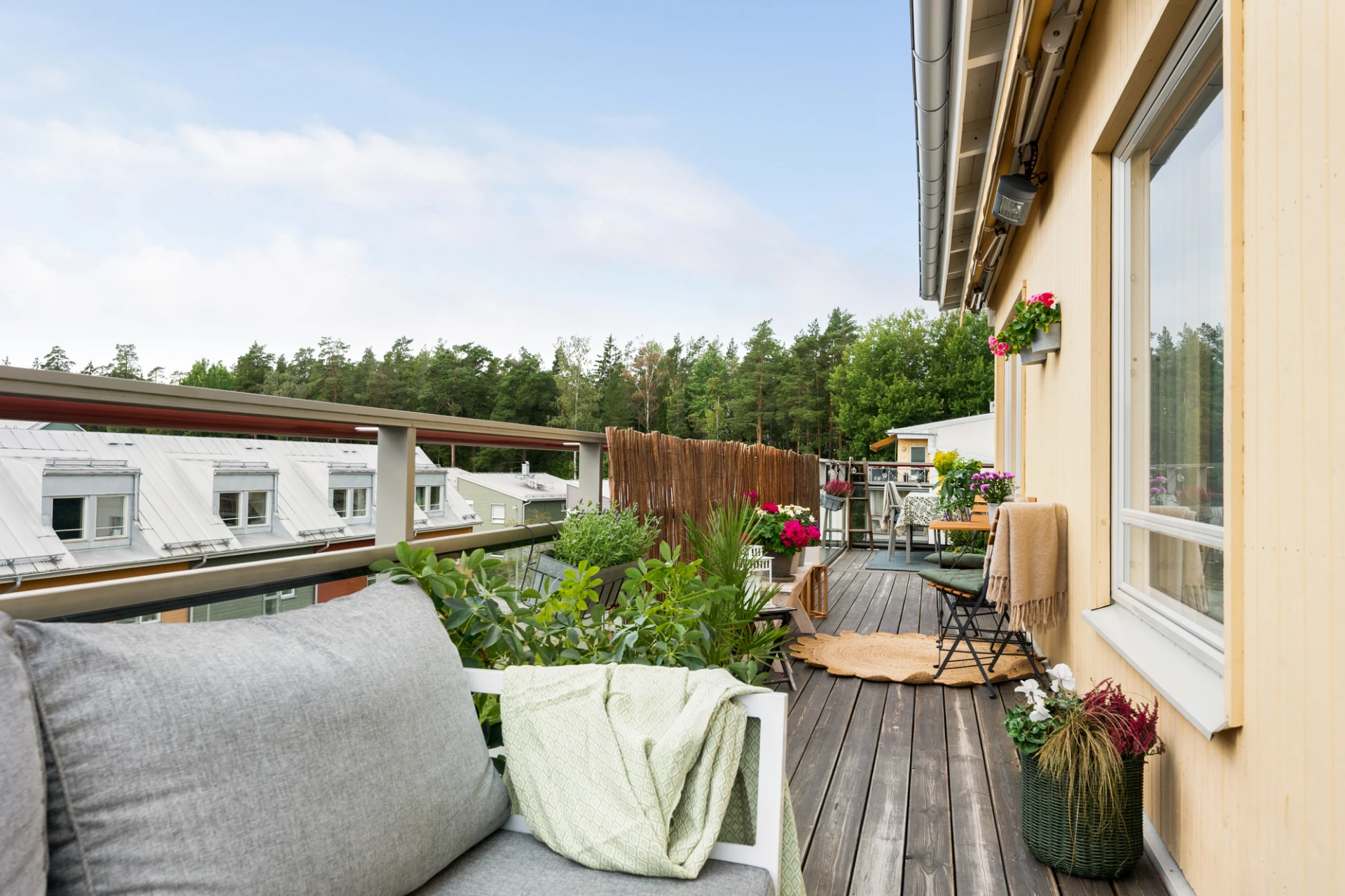 Den generösa takterrassen om 25 kvm är unik i sitt slag. Ett högt och fritt läge med bästa solmöjligheter. Här ryms både matplatsmöbel, grill och stor loungemöbel. En markis (nytt markistyg sep 2025) som ger solskydd under de hetaste sommardagarna.