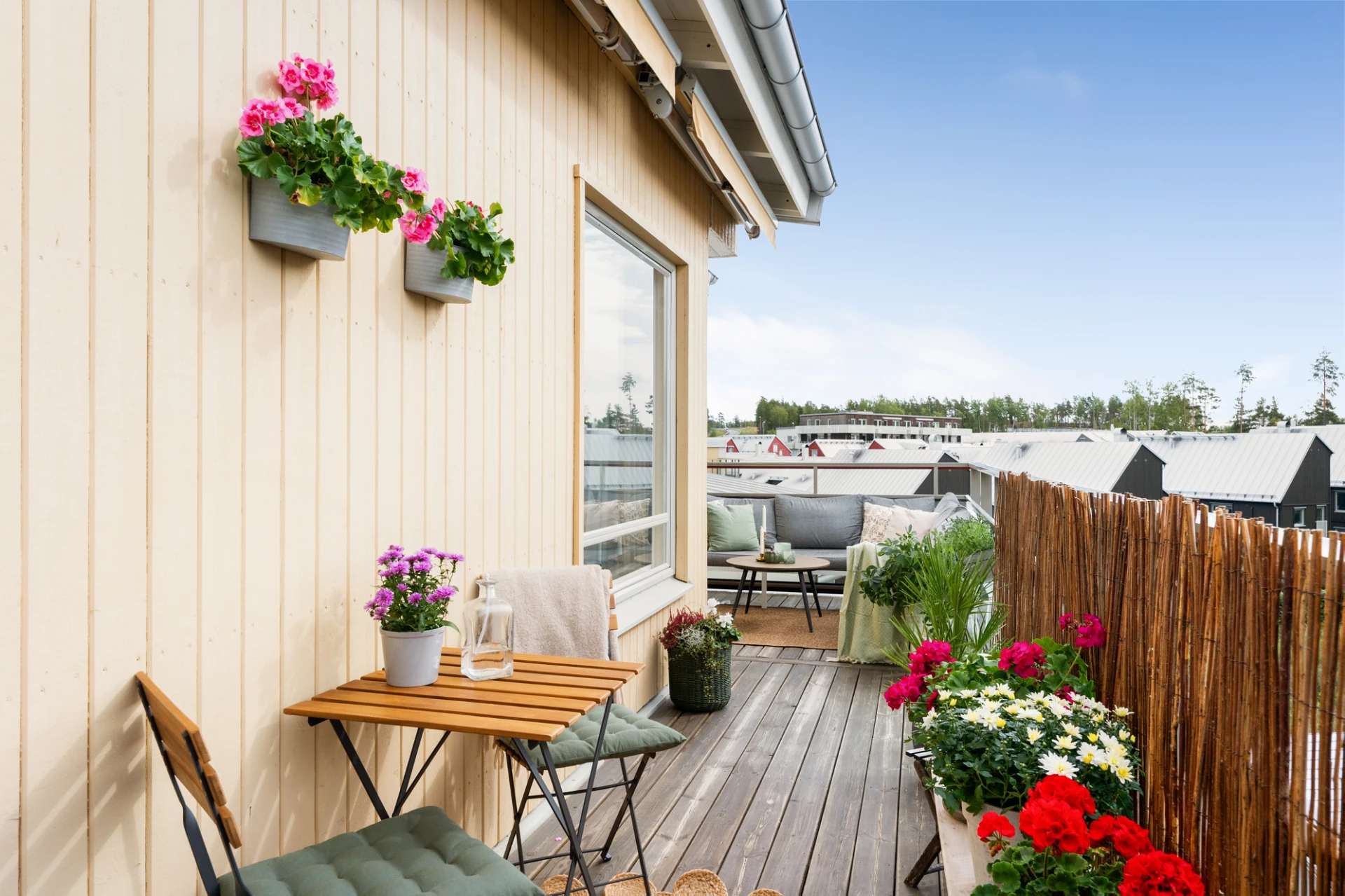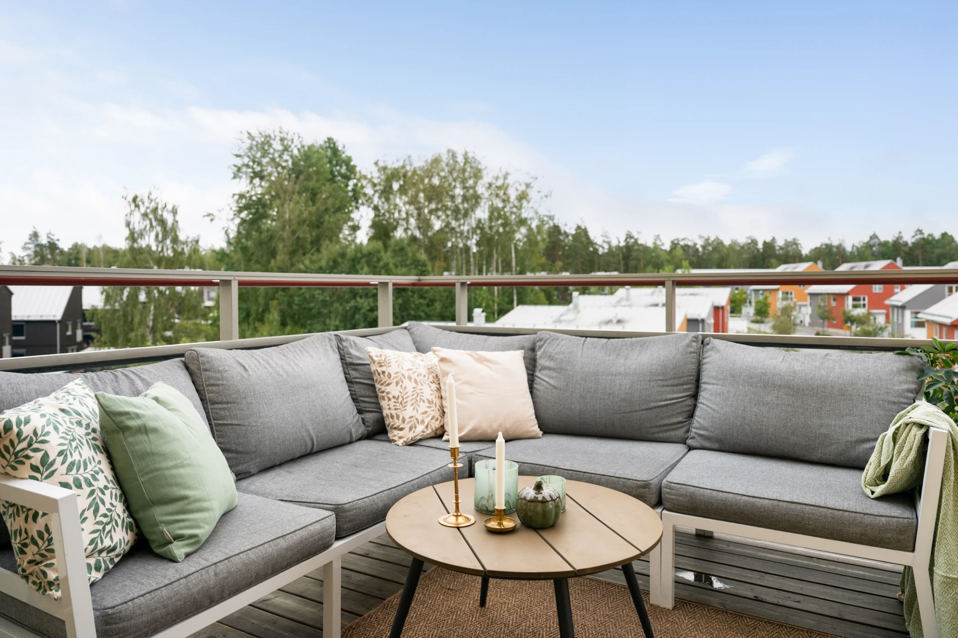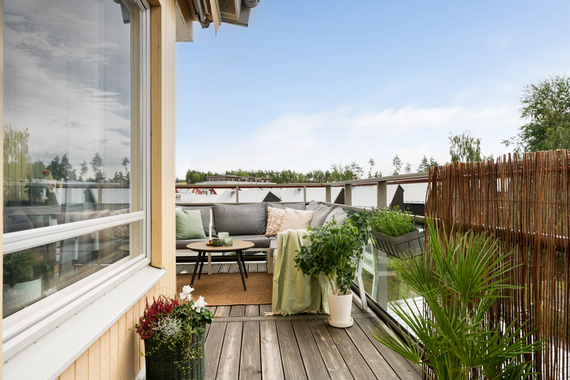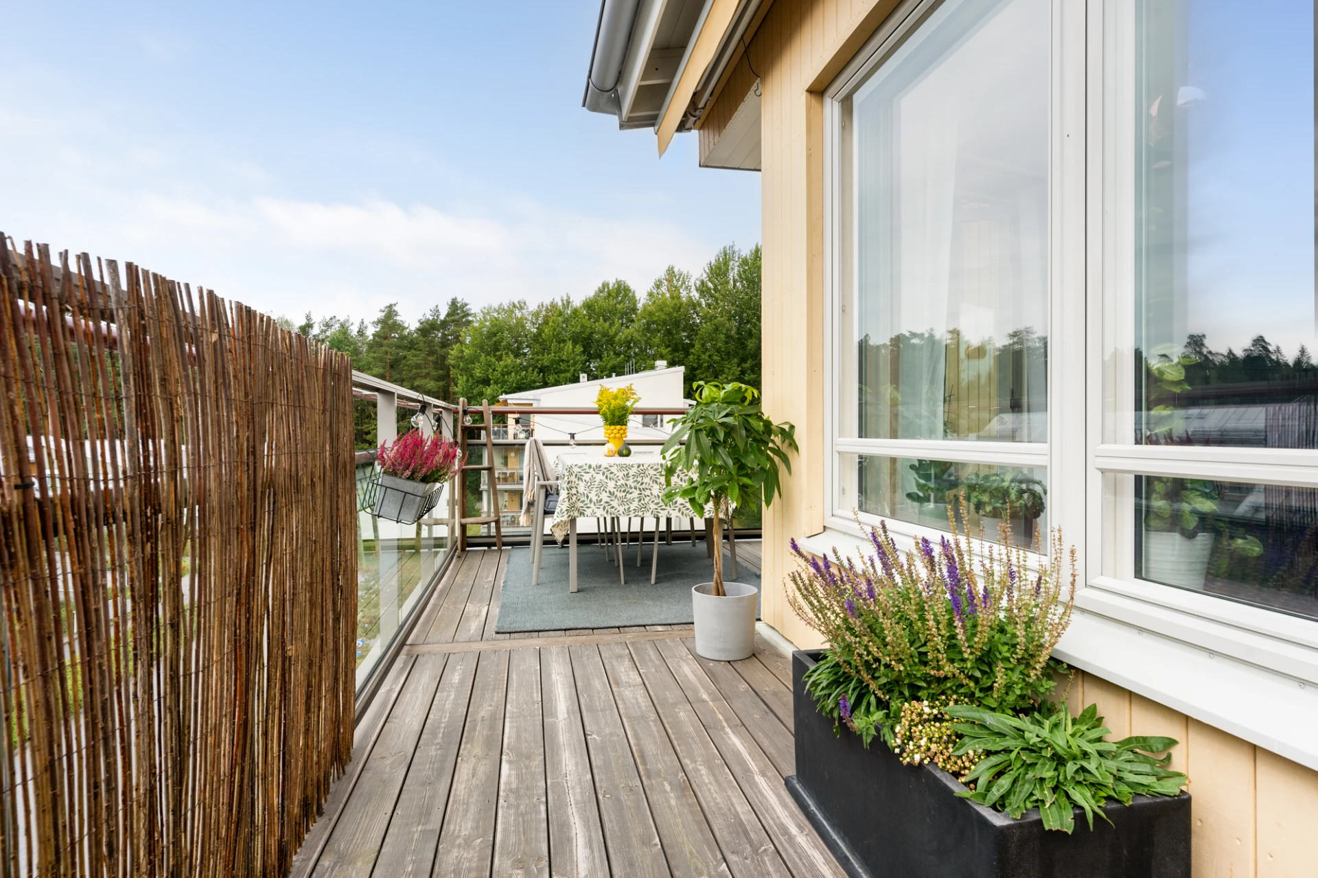 Den generösa takterrassen om 25 kvm är unik i sitt slag. Ett högt och fritt läge med bästa solmöjligheter. Här ryms både matplatsmöbel, grill och stor loungemöbel. En markis (nytt markistyg sep 2025) som ger solskydd under de hetaste sommardagarna.