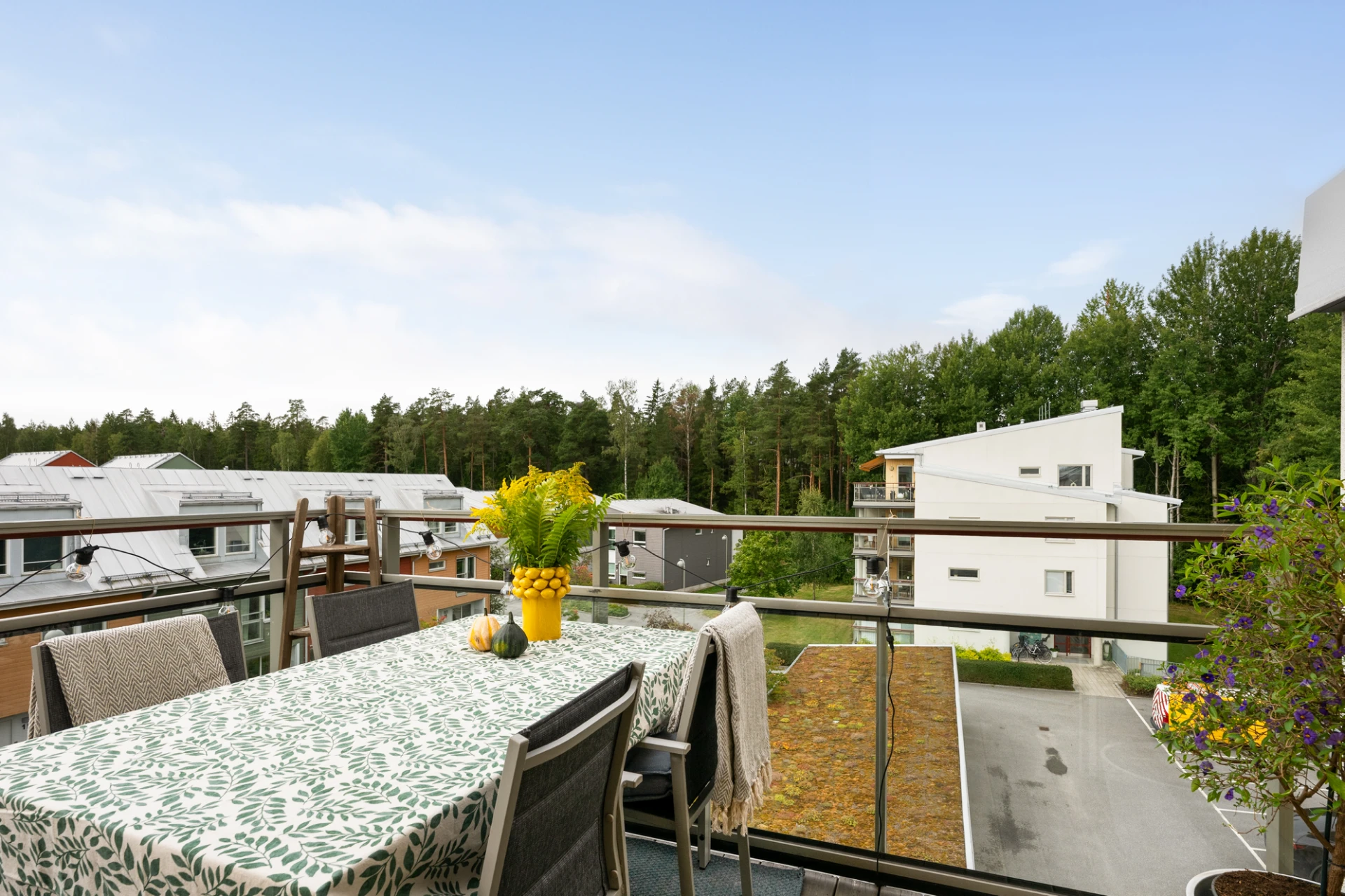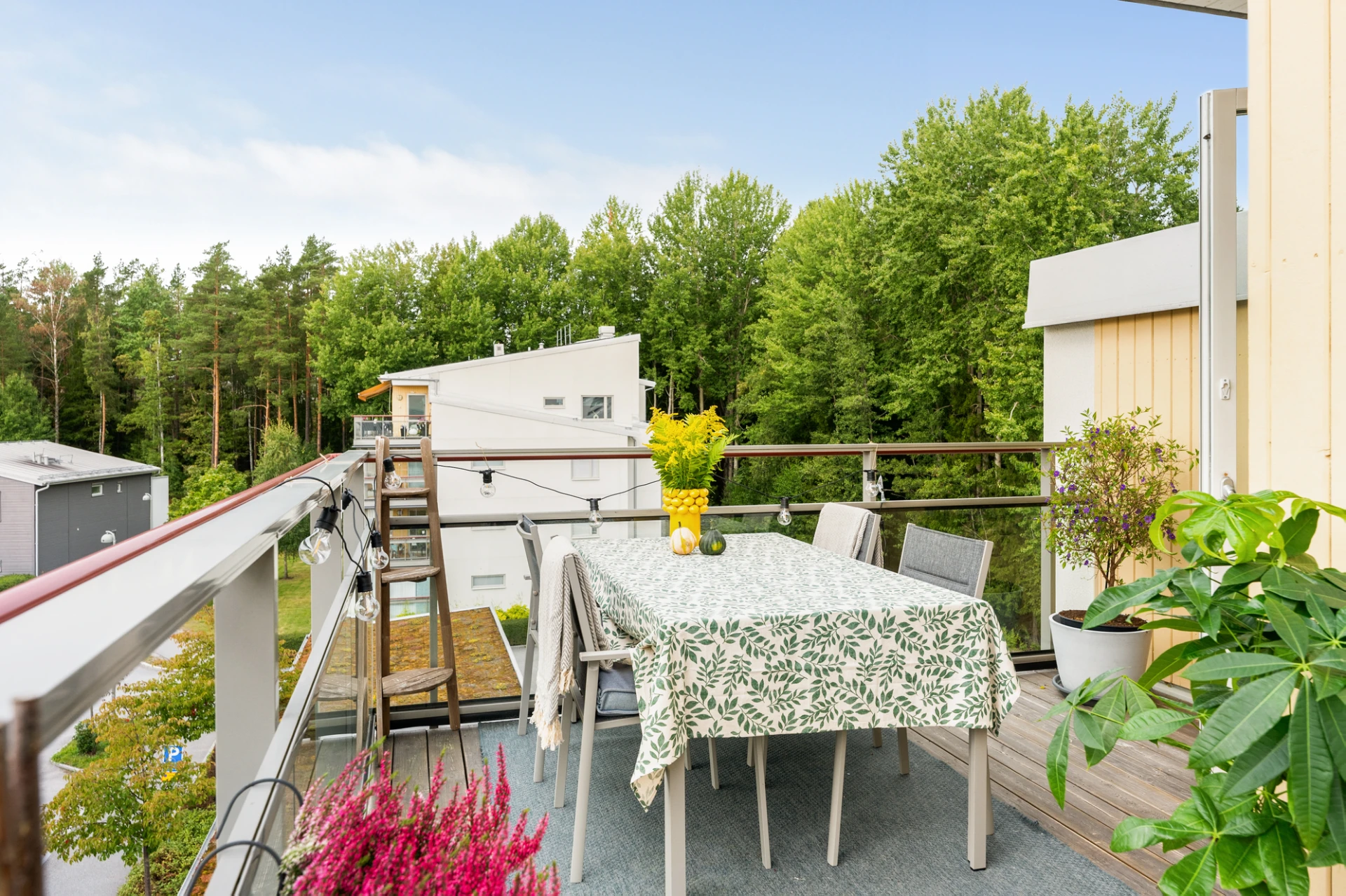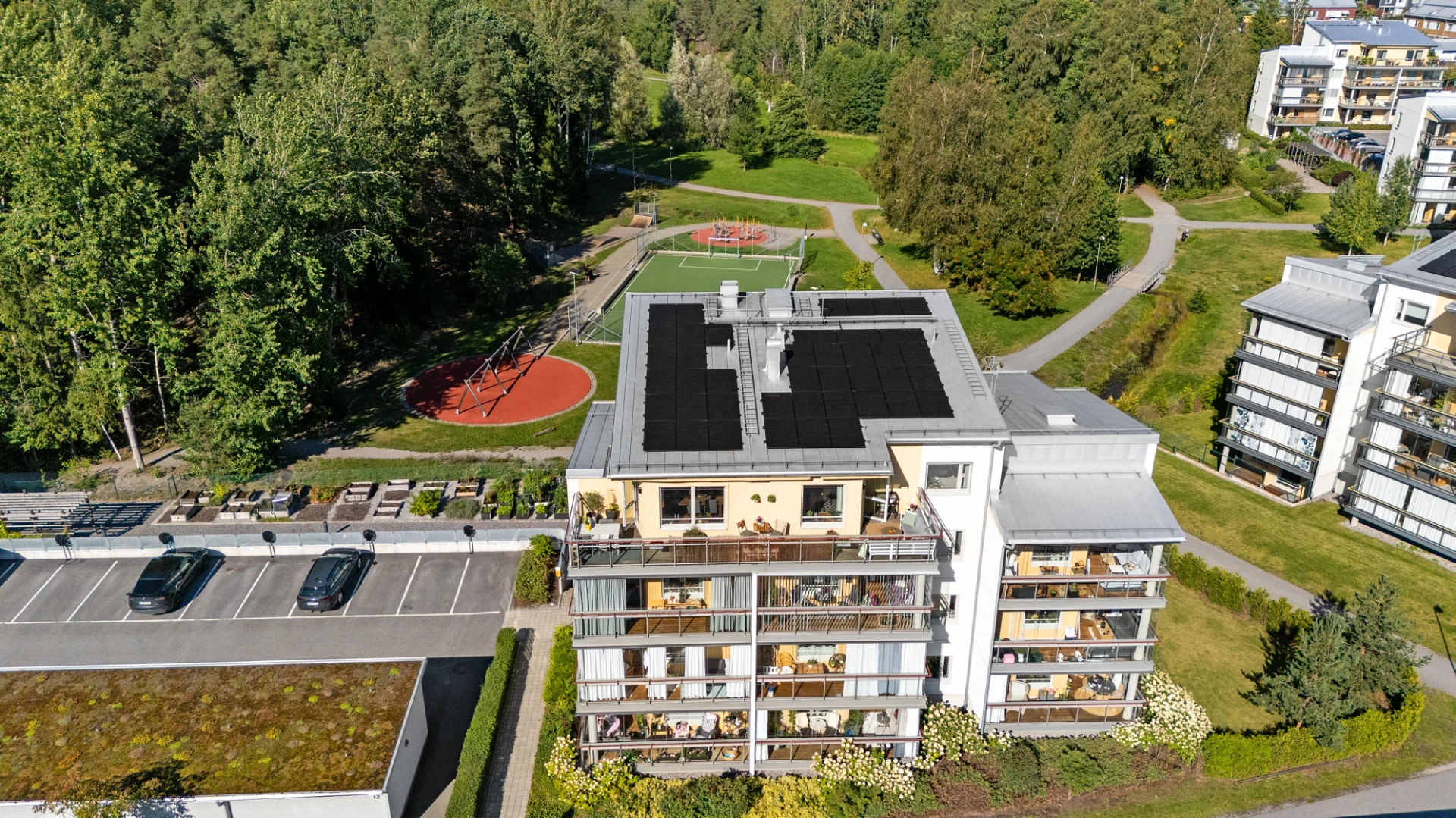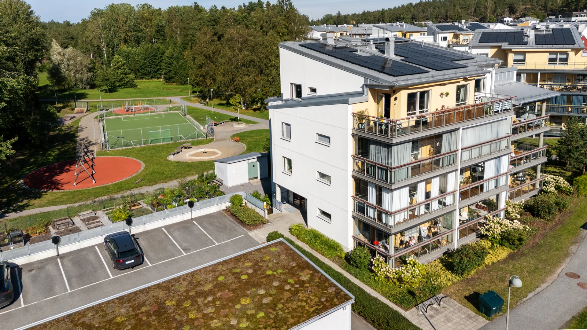 Den generösa takterrassen om 25 kvm är unik i sitt slag. Ett högt och fritt läge med bästa solmöjligheter. Här ryms både matplatsmöbel, grill och stor loungemöbel. En markis (nytt markistyg sep 2025) som ger solskydd under de hetaste sommardagarna.