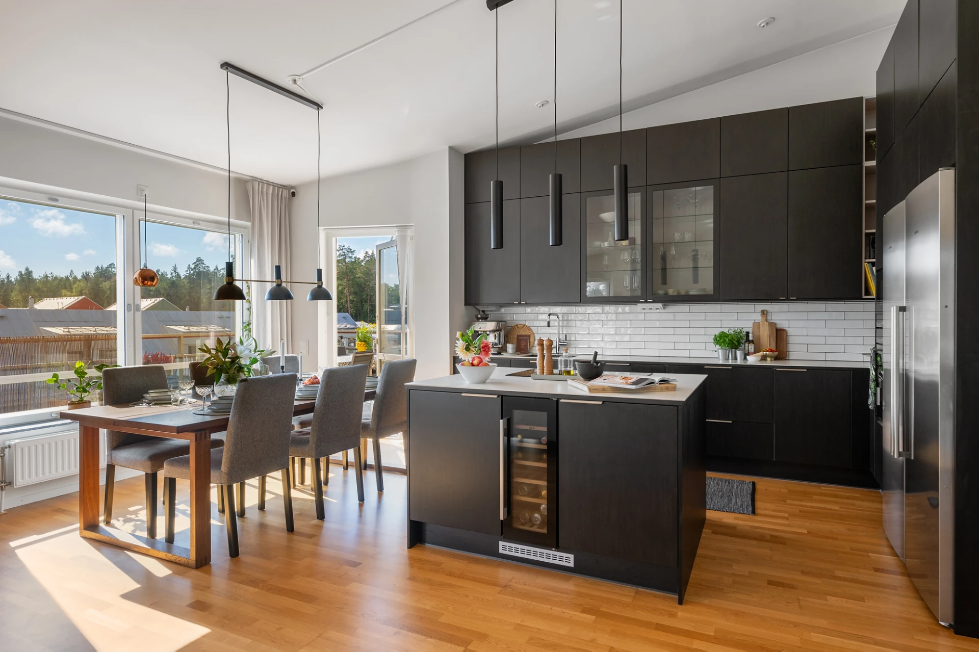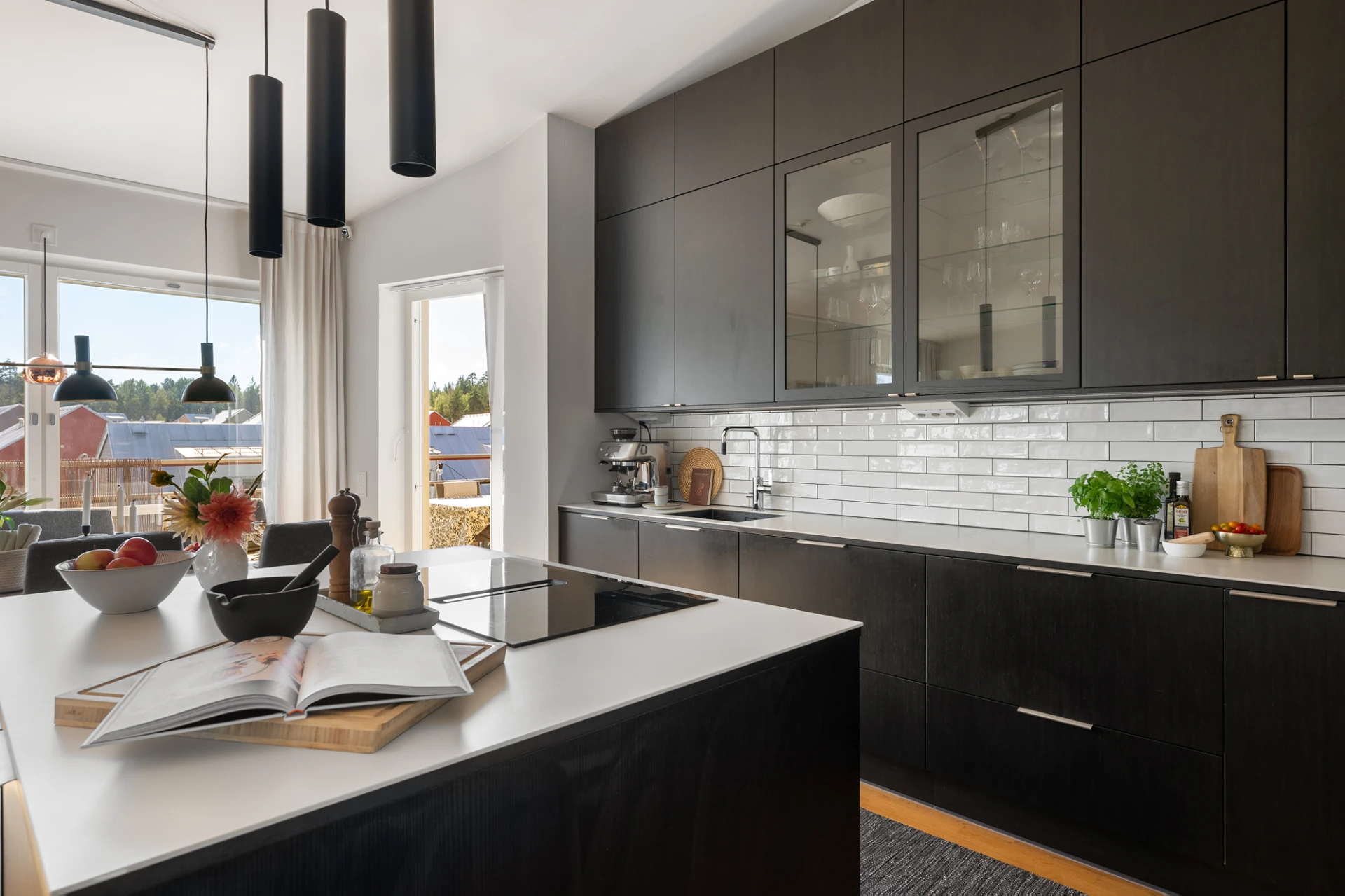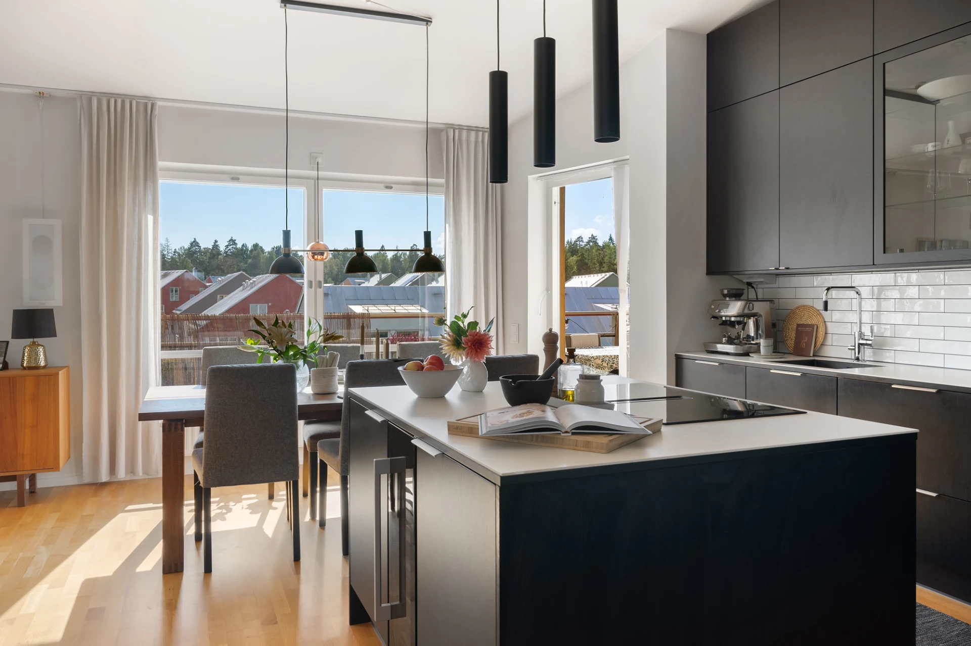 Exklusivt svart kök från Puustelli (2022) med tidlös design och påkostade materialval. Den stilfulla köksön med induktionshäll och inbyggd fläkt, elegant kompositstenskiva samt praktisk vinkyl blir hemmets naturliga mittpunkt - lika perfekt för matlagning som för social samvaro. Här finns gott om arbetsytor och smart förvaring. Köket är fullt utrustat med vitvaror från Siemens, däribland integrerad diskmaskin, ugn och mikro i praktisk arbetshöjd samt kyl och frys i fullhöjd.