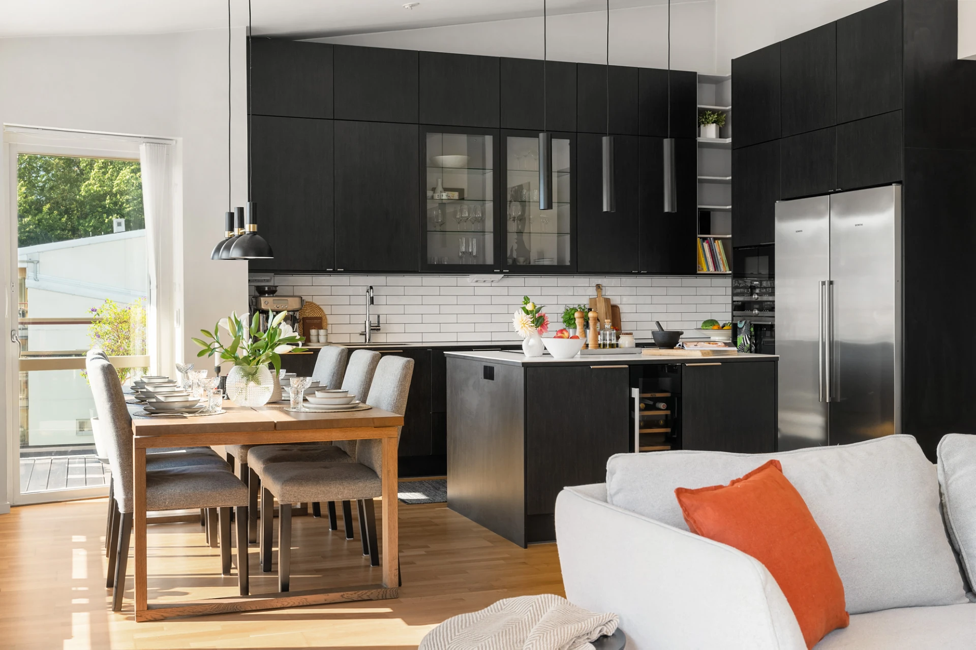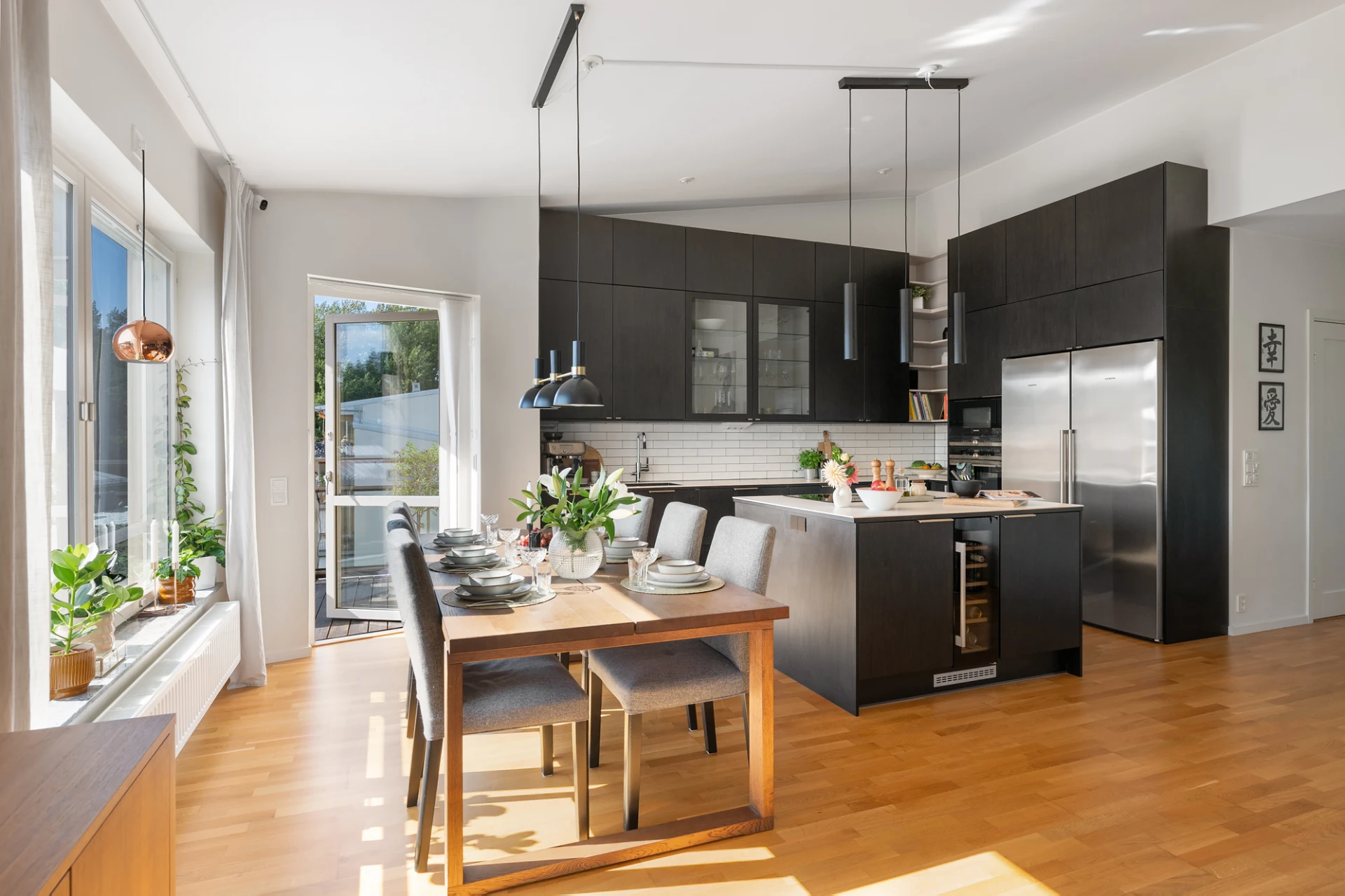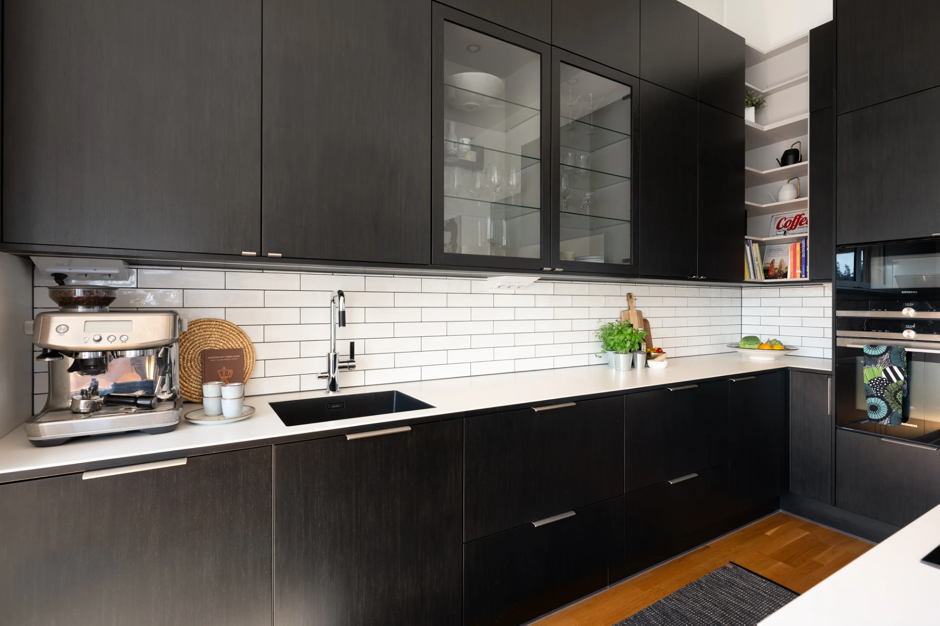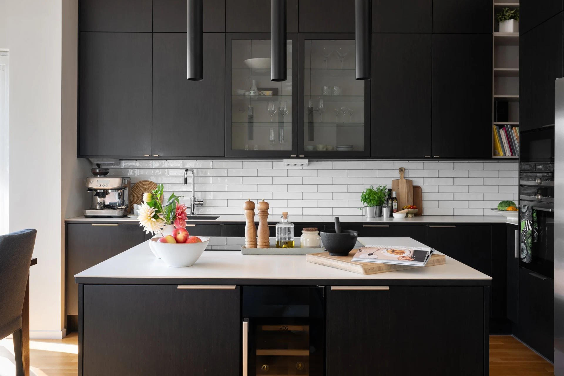 Exklusivt svart kök från Puustelli (2022) med tidlös design och påkostade materialval. Den stilfulla köksön med induktionshäll och inbyggd fläkt, elegant kompositstenskiva samt praktisk vinkyl blir hemmets naturliga mittpunkt - lika perfekt för matlagning som för social samvaro. Här finns gott om arbetsytor och smart förvaring. Köket är fullt utrustat med vitvaror från Siemens, däribland integrerad diskmaskin, ugn och mikro i praktisk arbetshöjd samt kyl och frys i fullhöjd.