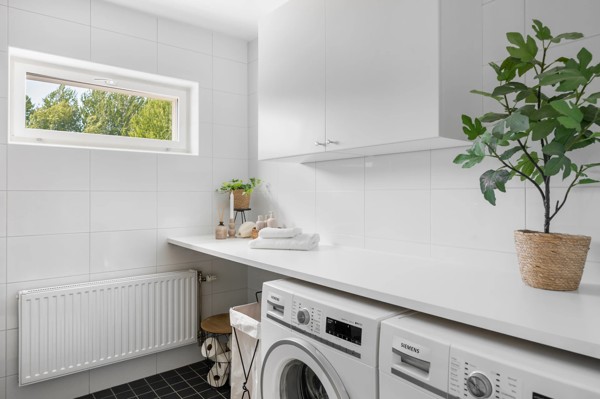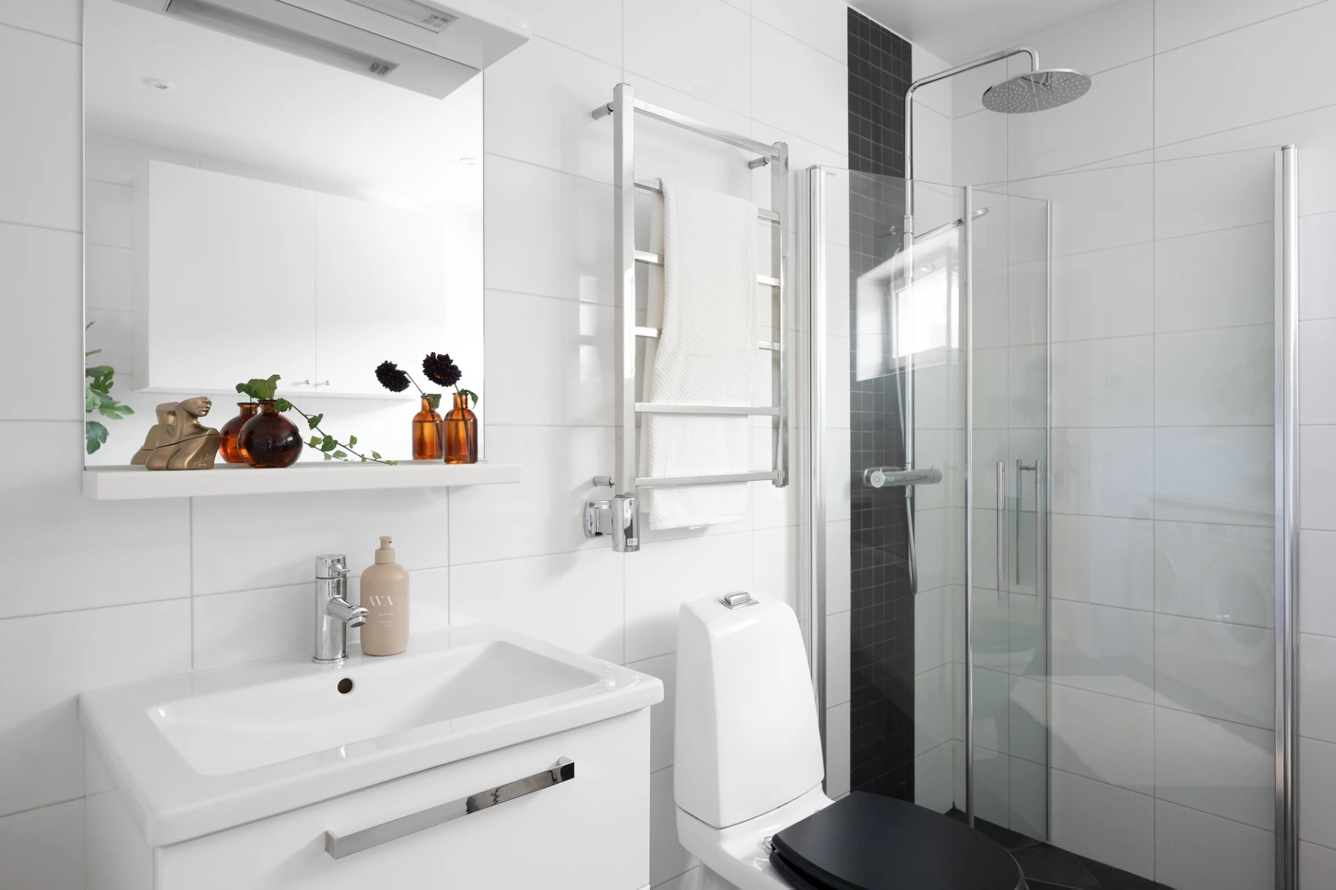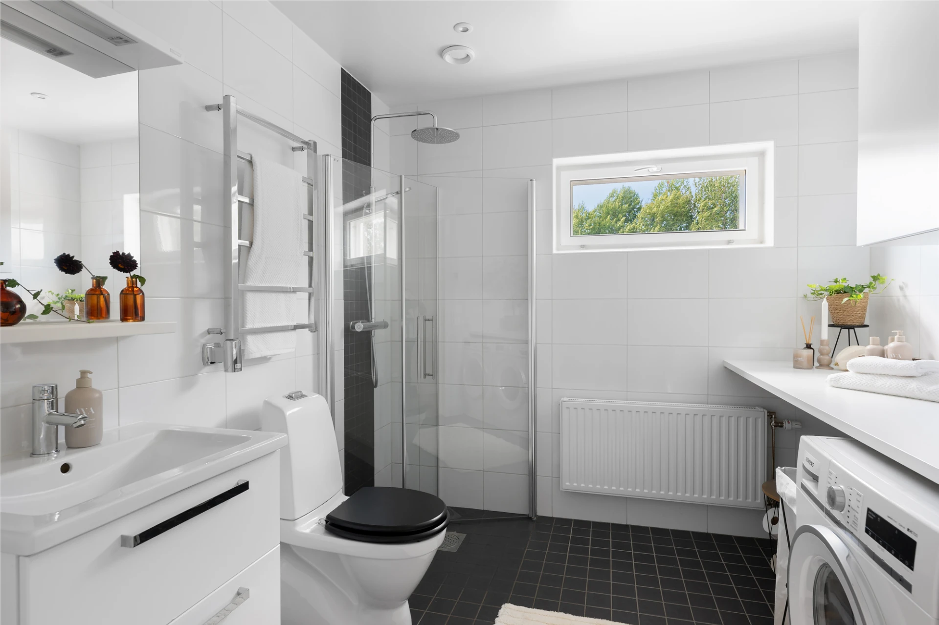 I anslutning till sovrum 1 finns separat dusch med wc. Här står även tvättmaskin och torktumlare (2025) placerad under praktisk arbetsbänk. Helkaklade väggar i vitt och grått klinkergolv. Tvättställ ovan kommod med matchande spegel, wc samt dusch bakom glasdörrar. Väggskåp för extra förvaring. Ett högt sittande fönster ger ett naturligt ljusinsläpp utan att ge insyn.