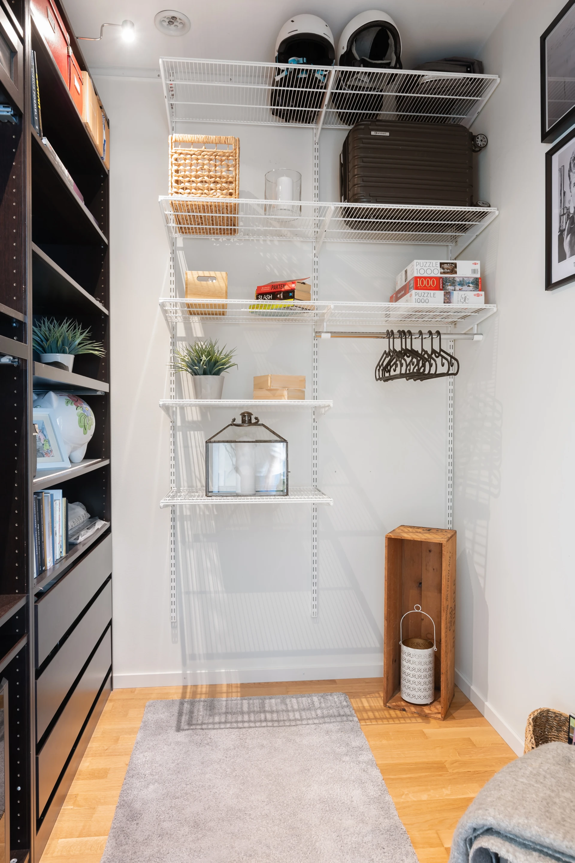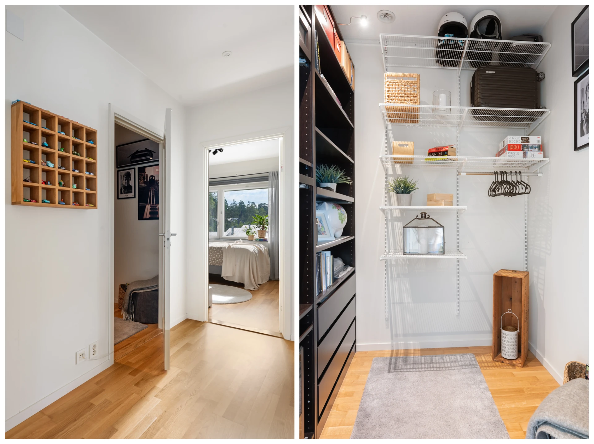 Intill hallen ligger en rymlig klädkammare med gott om plats förvaring. Detta nyttjas idag som arbetsrum.