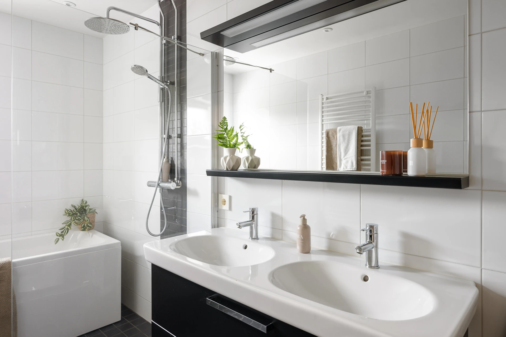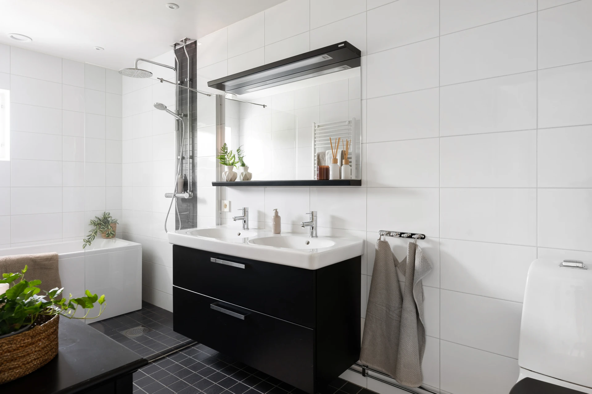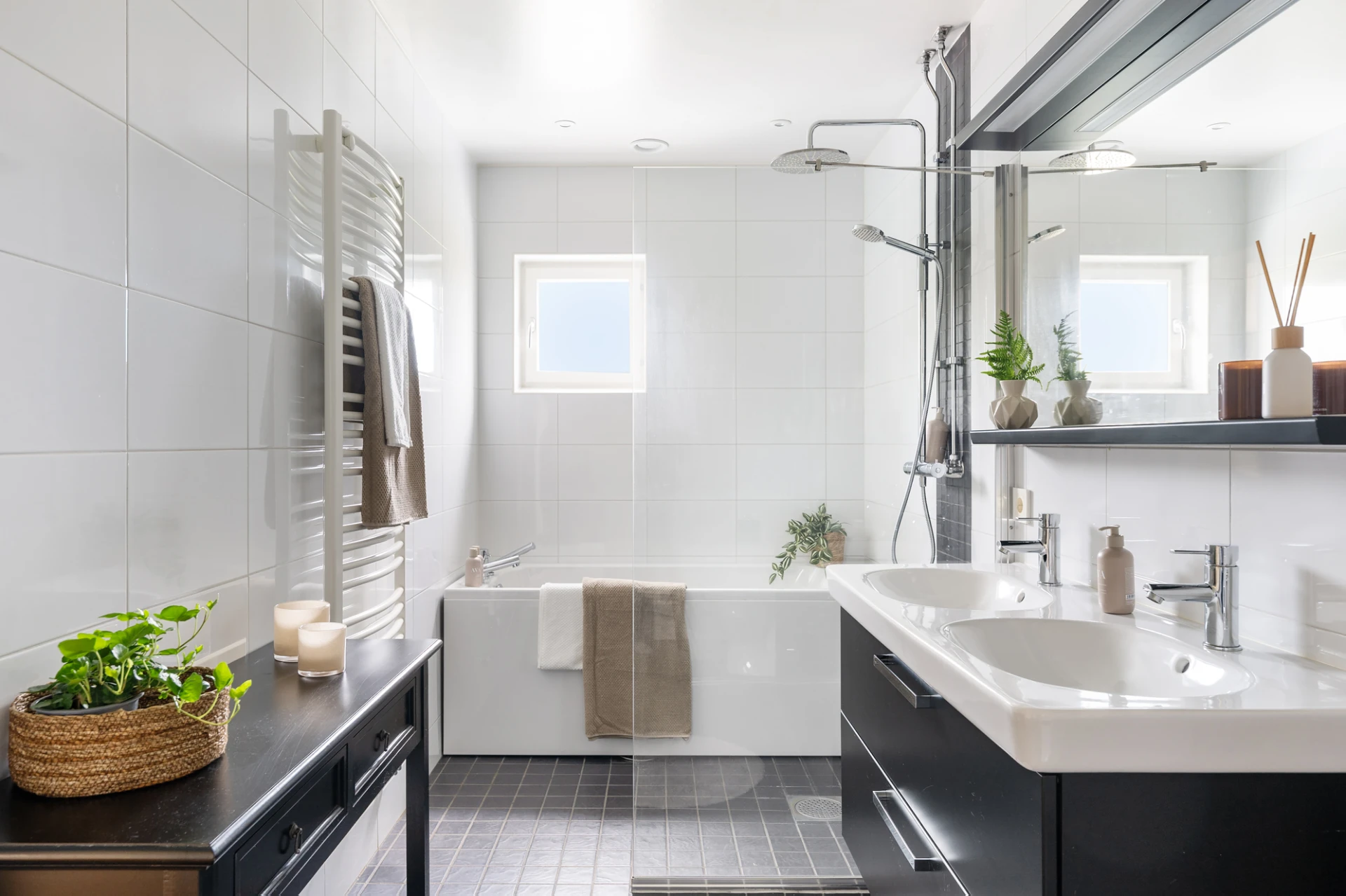 Ett lyxigt och stilfullt badrum med både badkar och dusch bakom glasvägg. Extra bred kommod med dubbla tvättställ. Wc samt en stilfull handdukstork. Del av badrummet har vitkaklade väggar och grått klinkergolv. Infällda spotlights i taket.