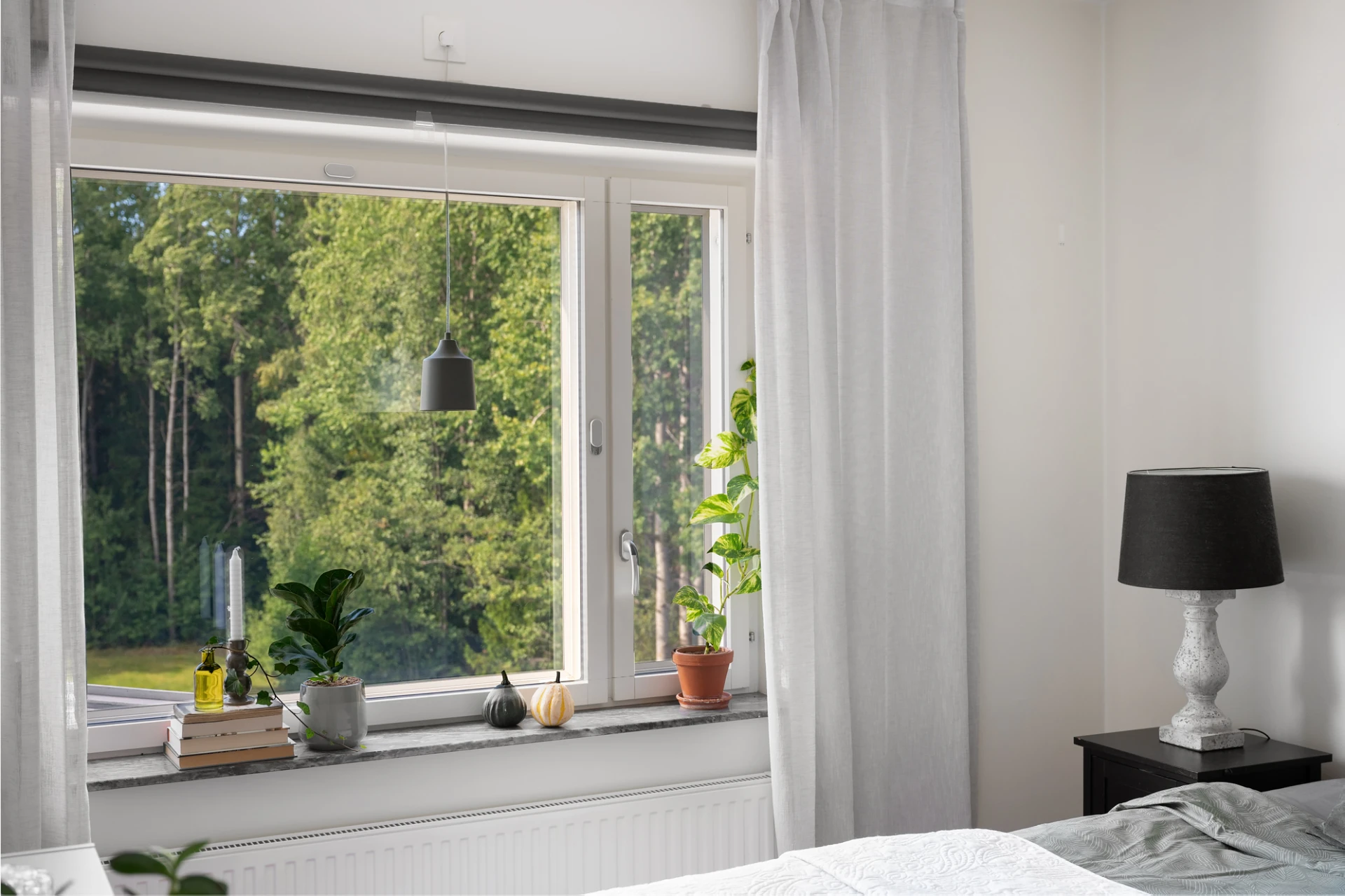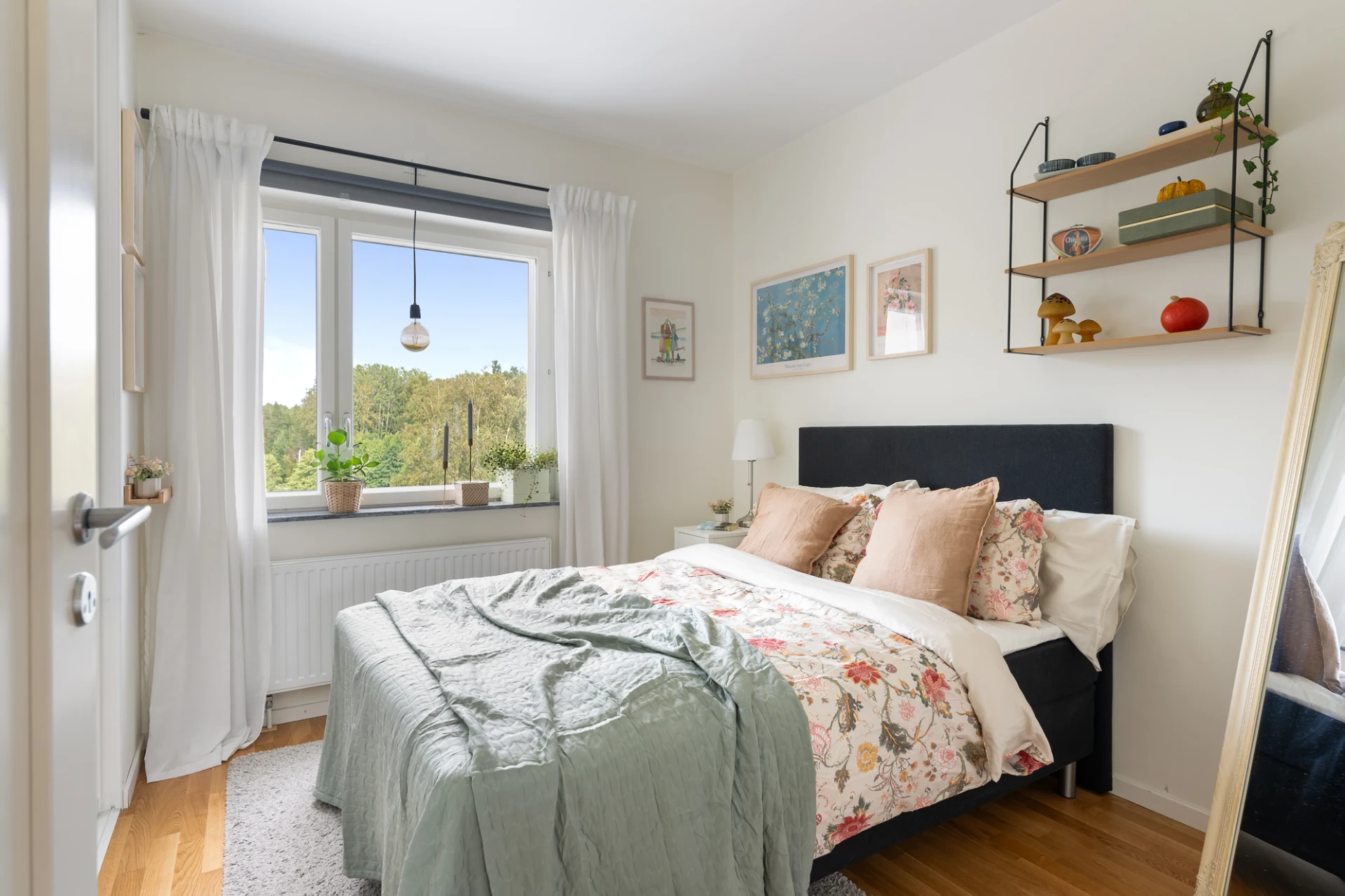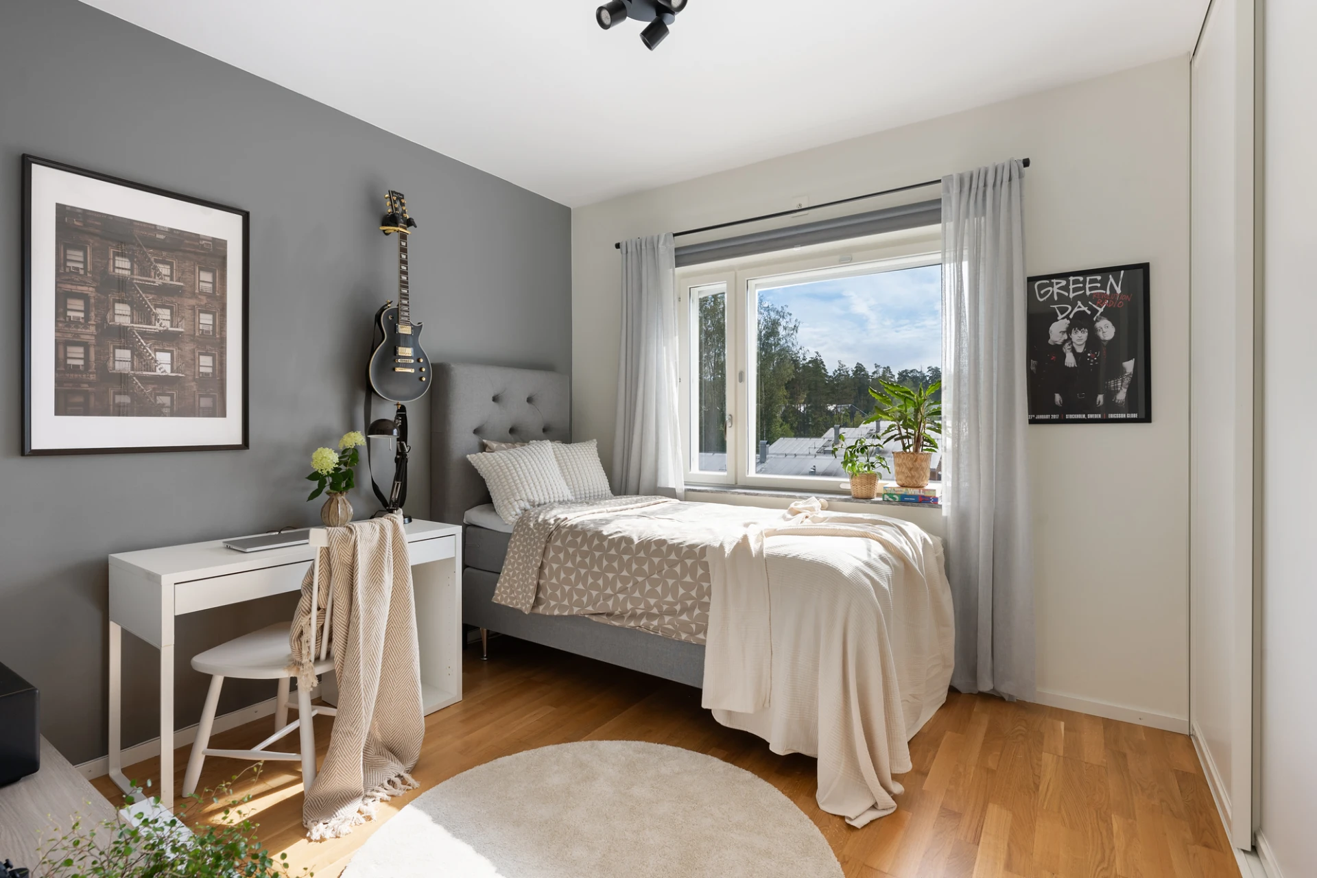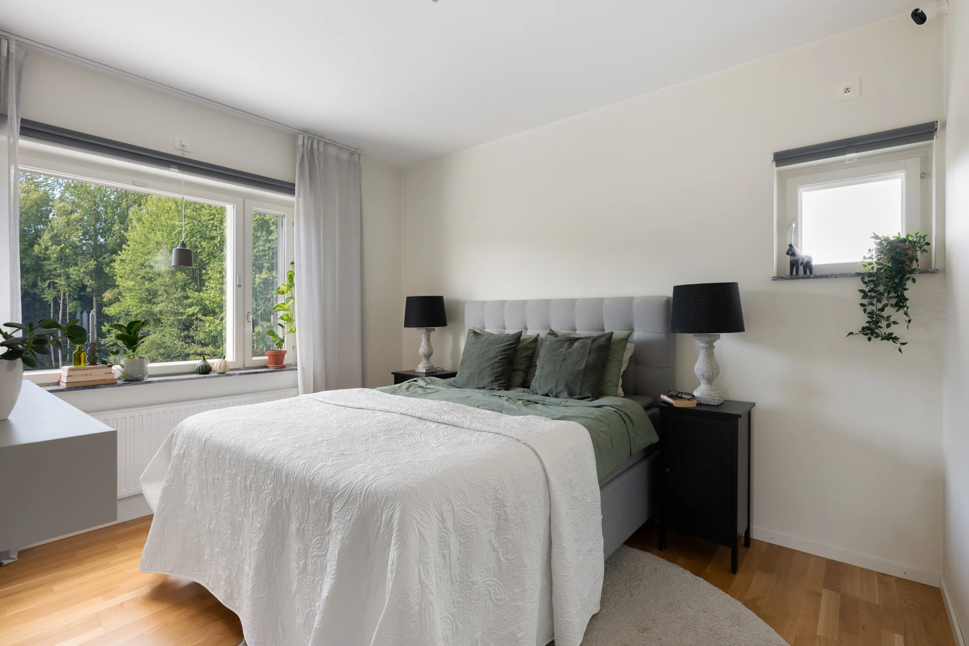 Master bedroom ligger i ena delen av bostaden. Ett rymligt rum med plats för dubbelsäng och stora platsbyggda garderober med skjutdörrar. Fönster i två väderstreck i ett helt insynsskyddat läge. Målade väggar och den fina ekparketten på golvet.