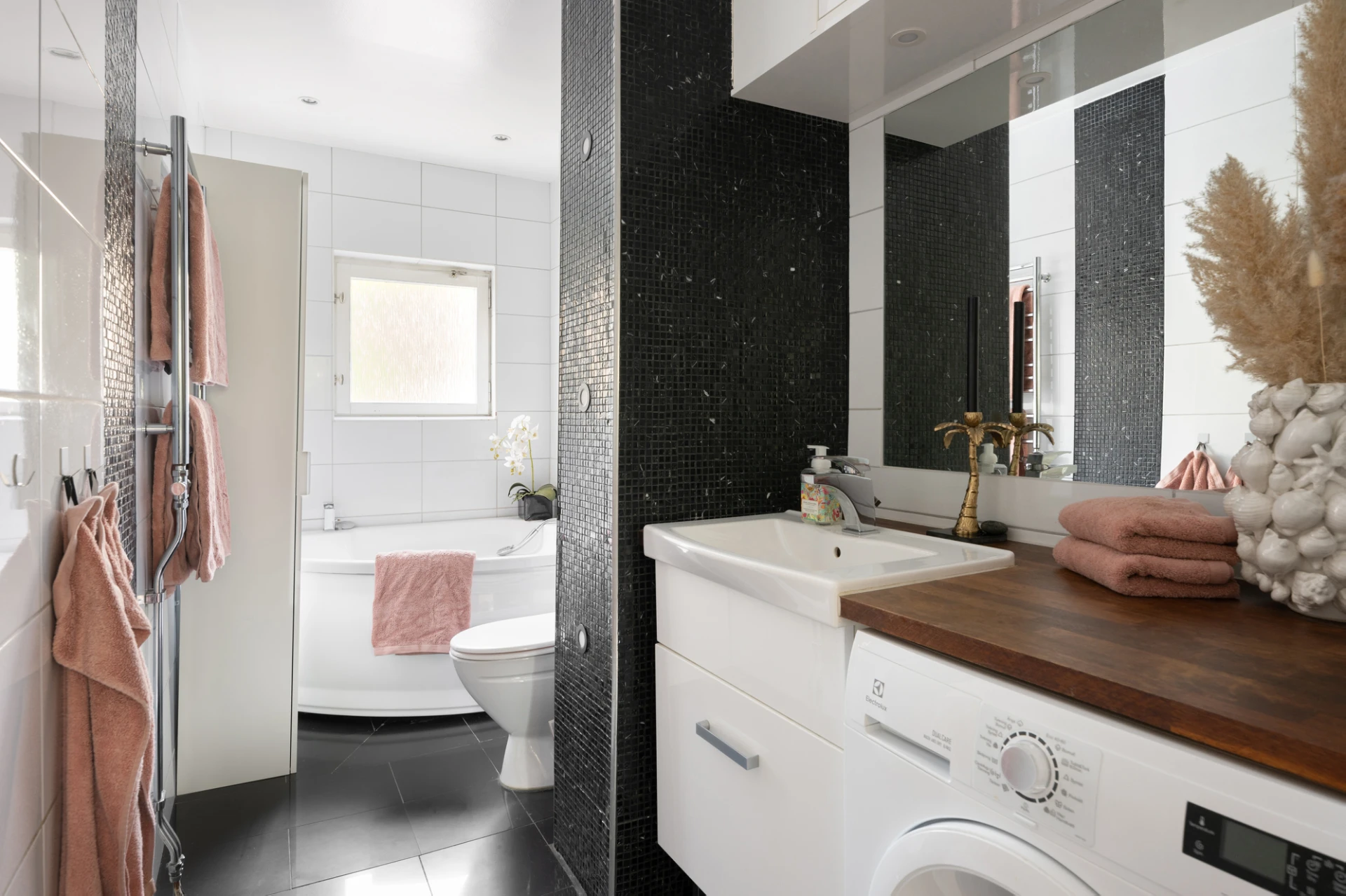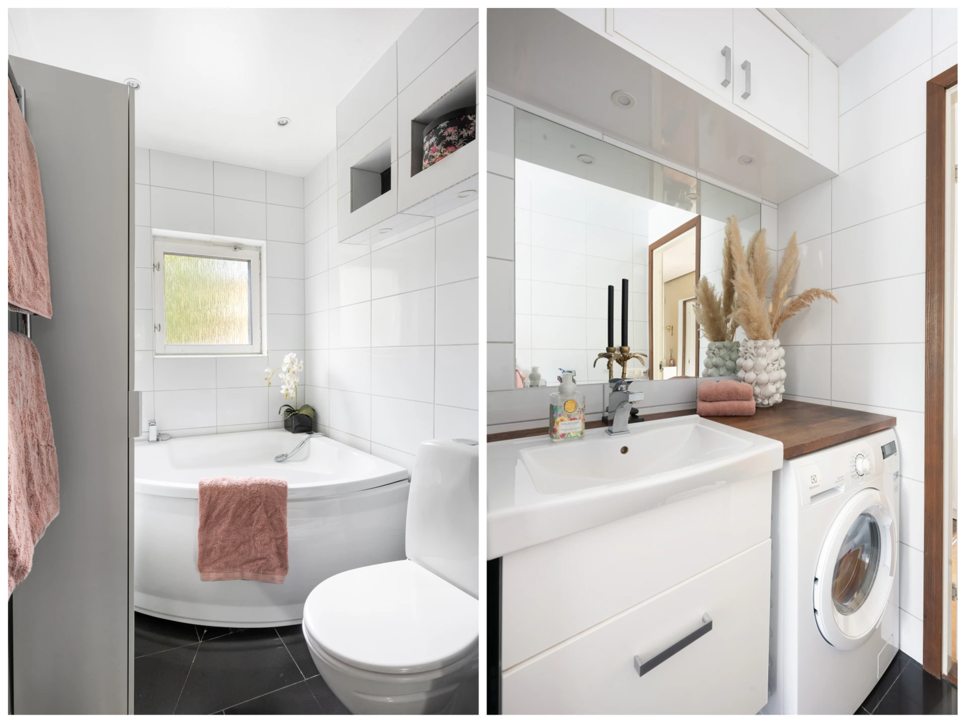 Helkaklade väggar samt golv. Badkar, tvättställ, wc samt kombitvättmaskin.