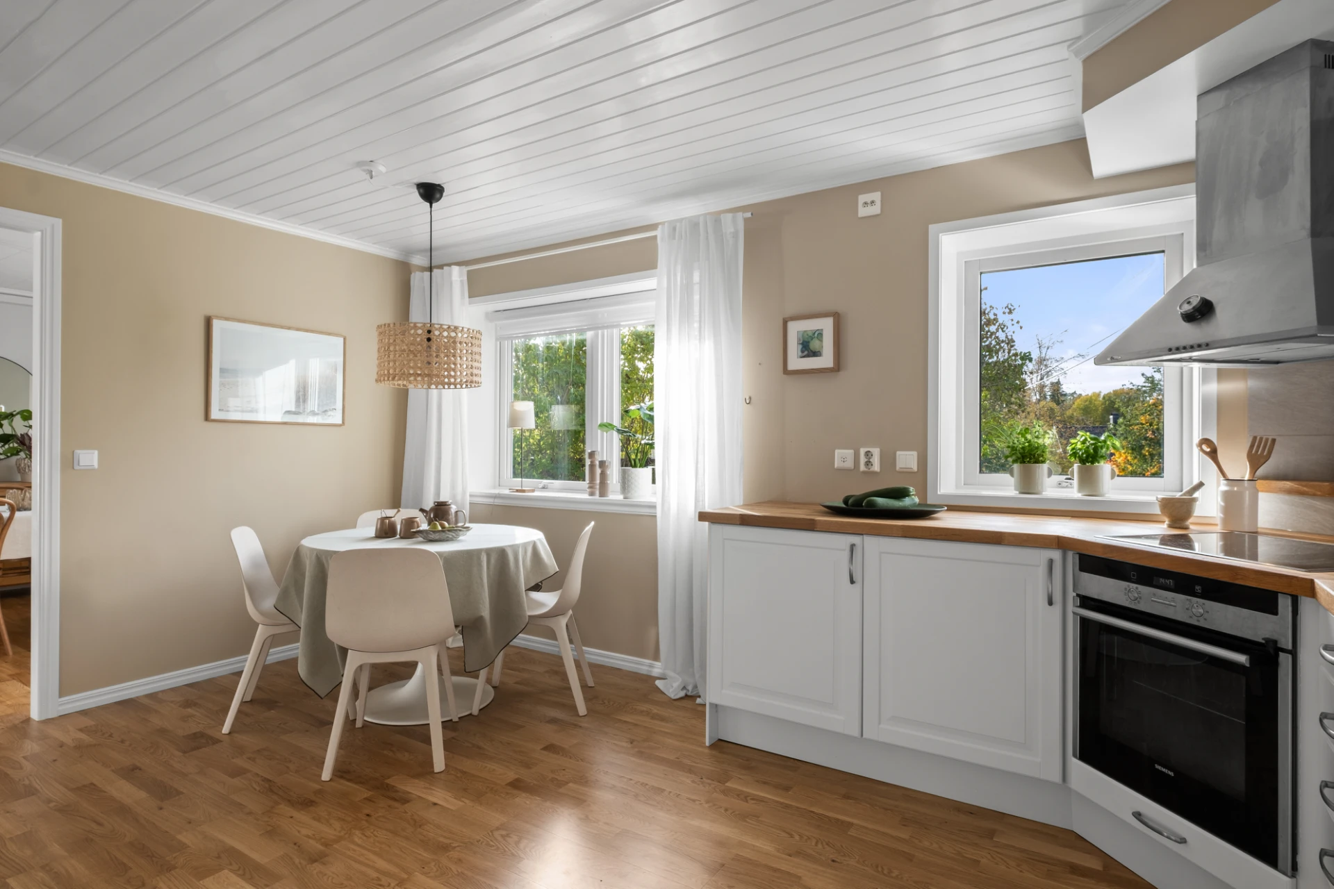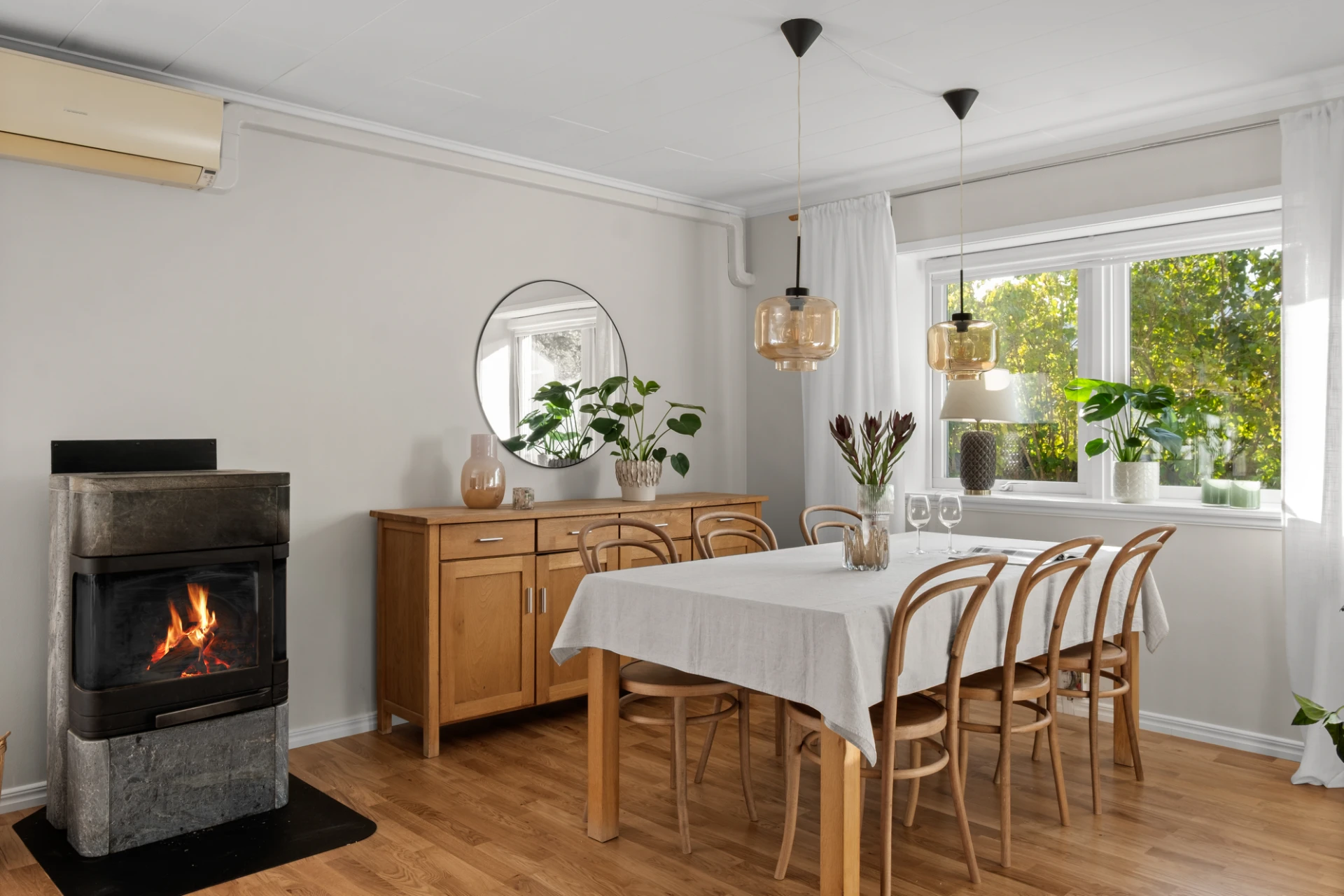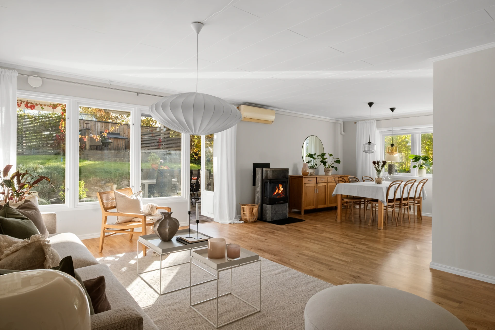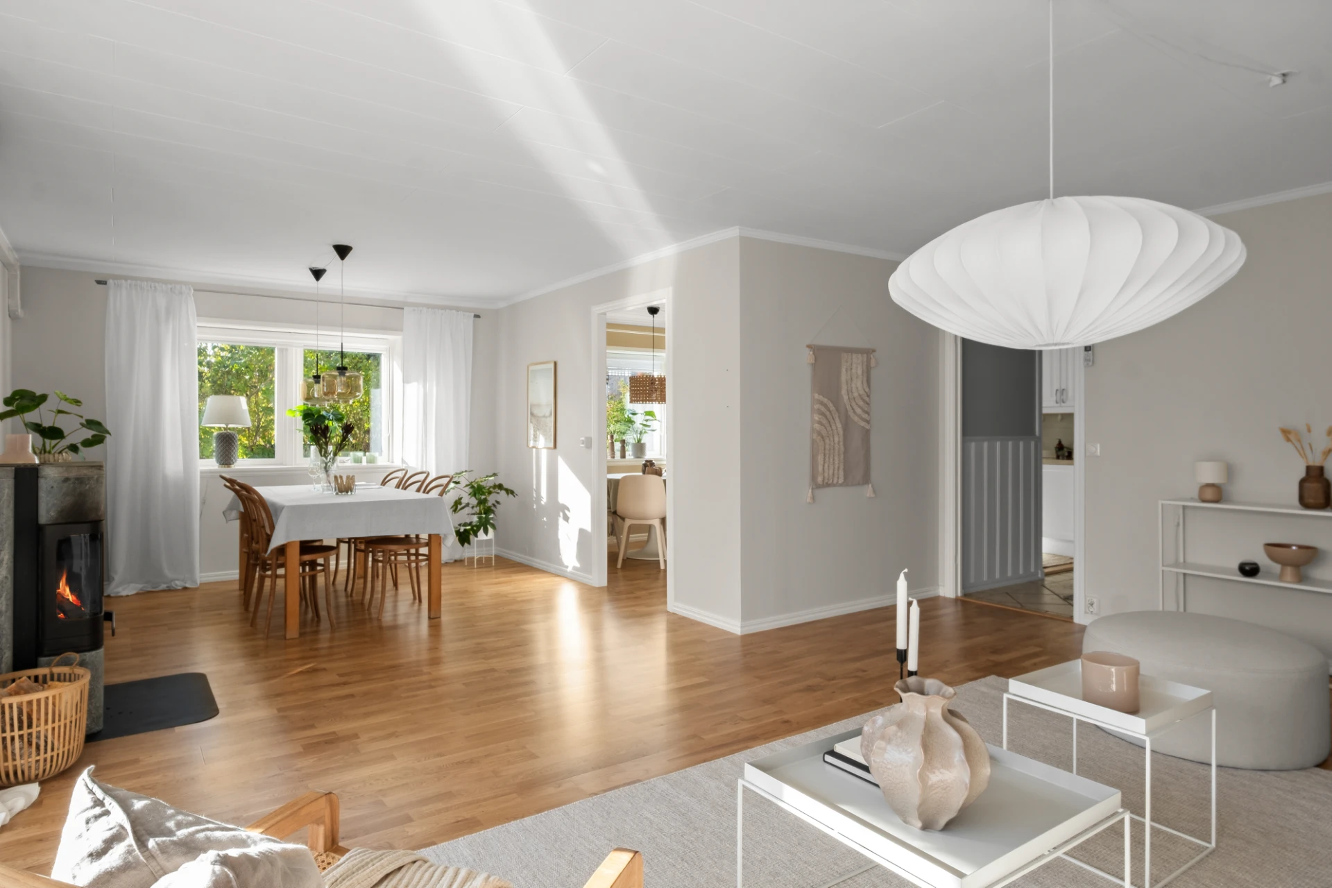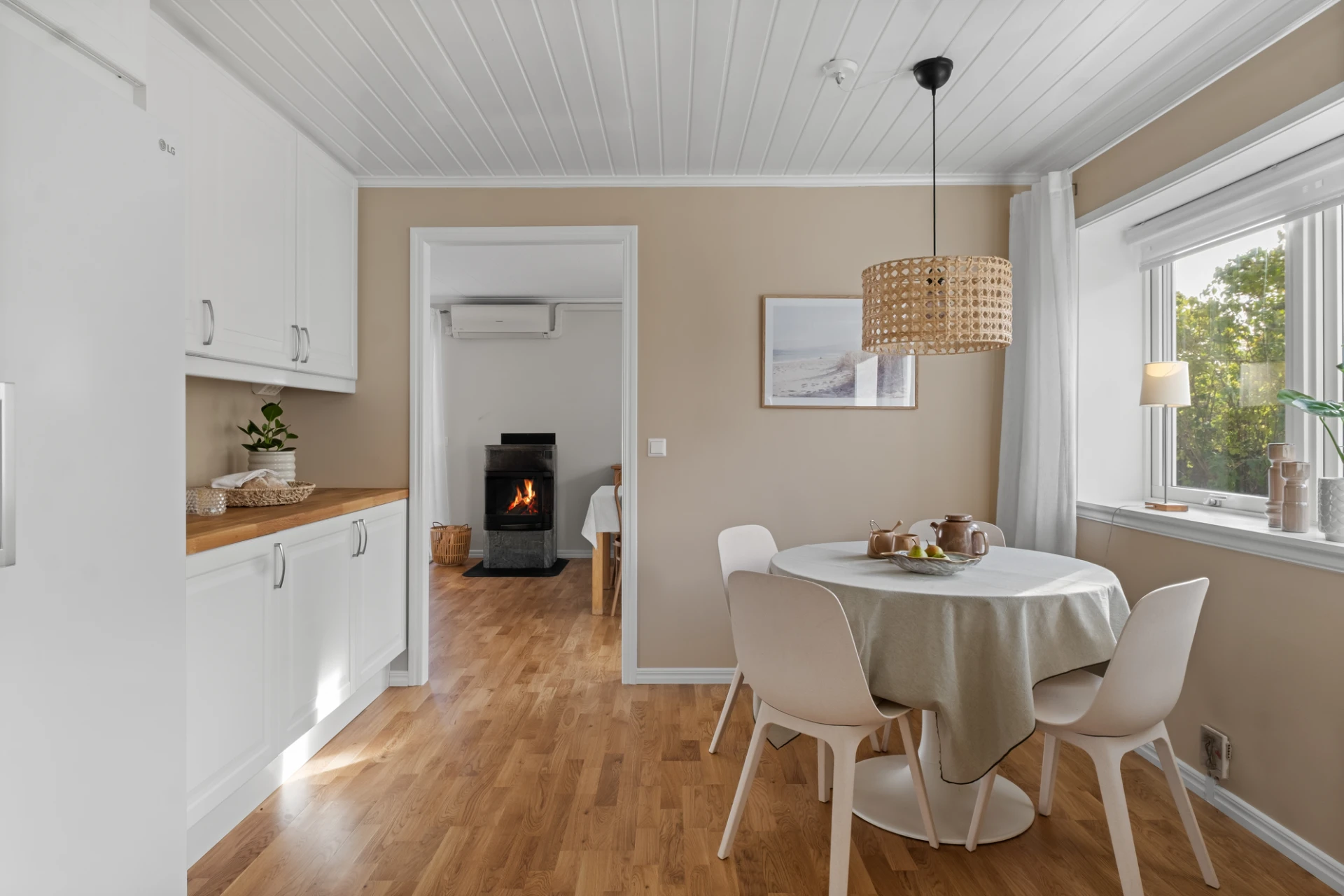 Generöst vardagsrum med plats för soffgrupp, soffbord, tv-möbel och matplats. En täljstenskamin skänker både värme och mysfaktor under höst- och vinterhalvåret. Ekparkett, ljust målade väggar och altandörr ut till den trädäckade uteplatsen. Här finns även en luft-luftvärmepump som kan leverera både värme och kyla för extra komfort året runt.