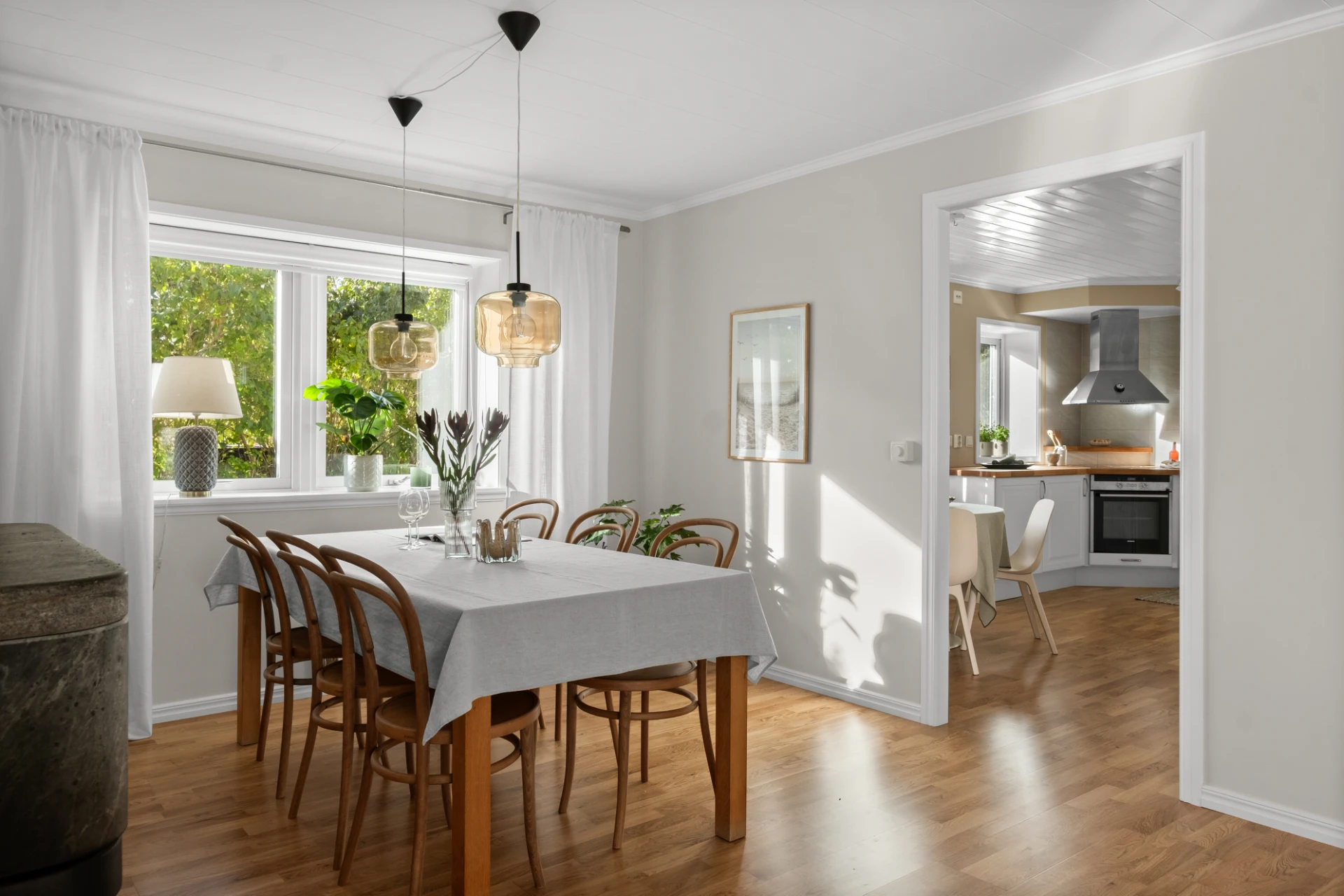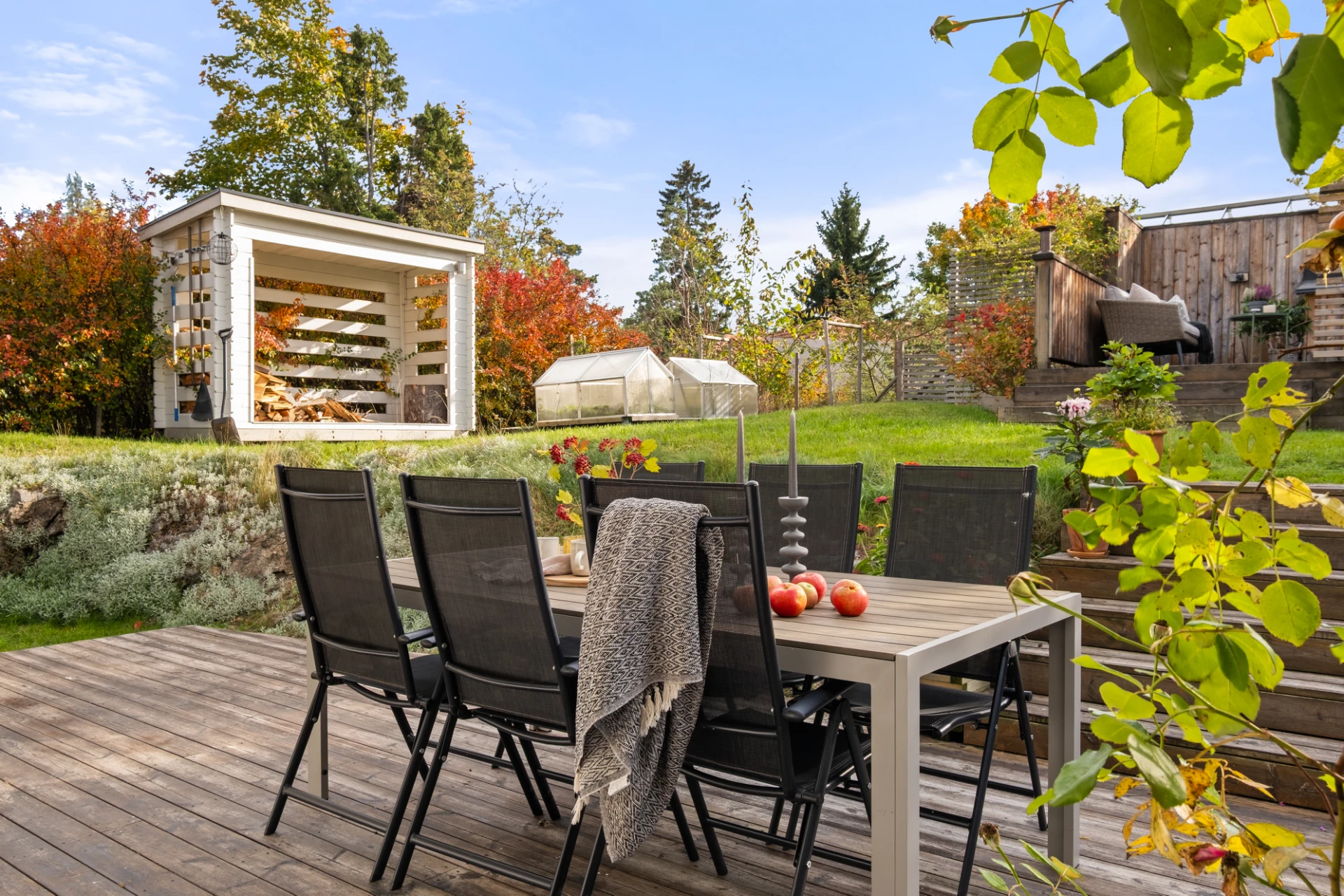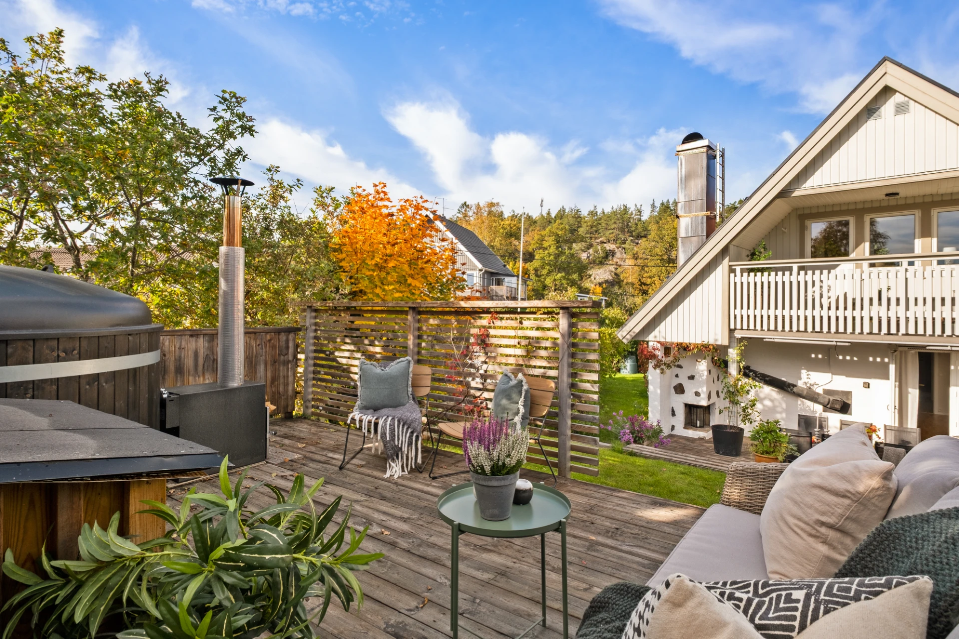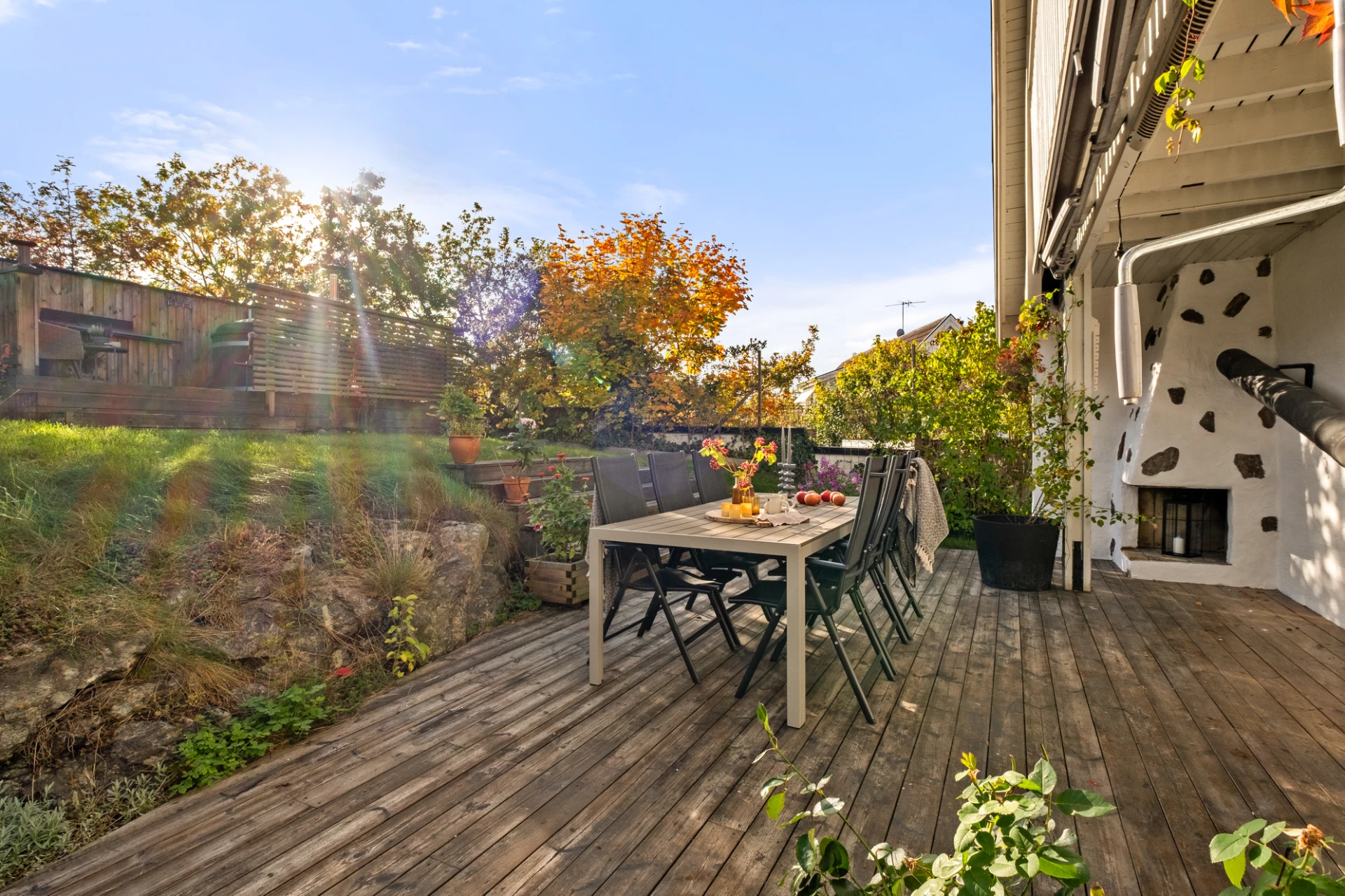 Generöst vardagsrum med plats för soffgrupp, soffbord, tv-möbel och matplats. En täljstenskamin skänker både värme och mysfaktor under höst- och vinterhalvåret. Ekparkett, ljust målade väggar och altandörr ut till den trädäckade uteplatsen. Här finns även en luft-luftvärmepump som kan leverera både värme och kyla för extra komfort året runt.