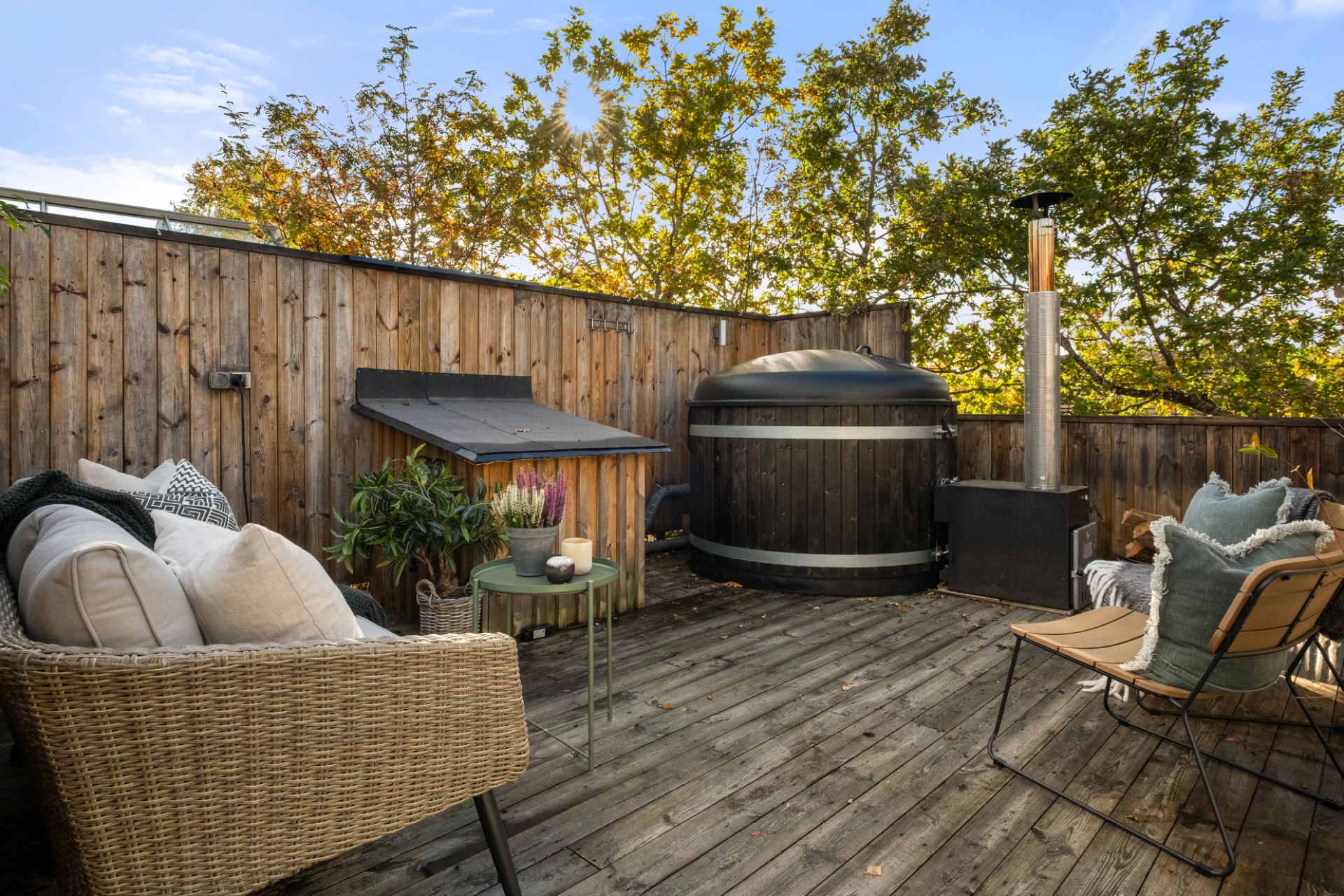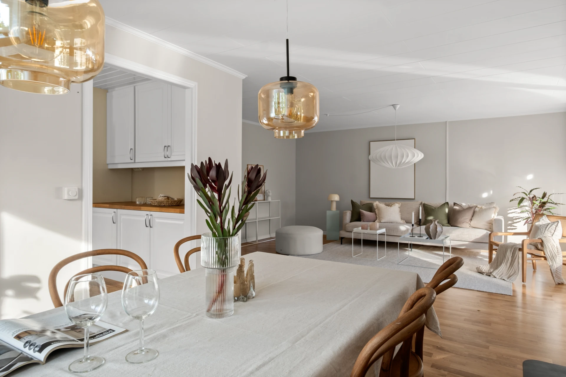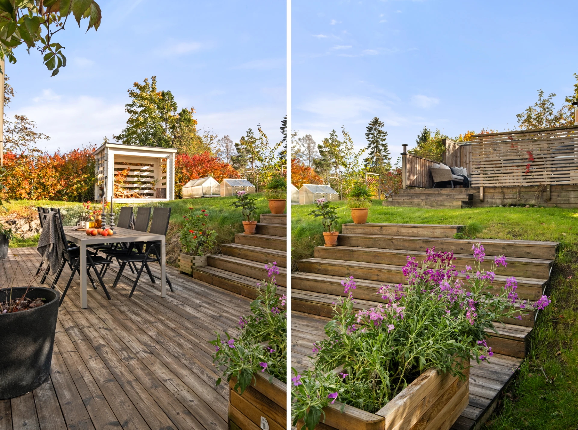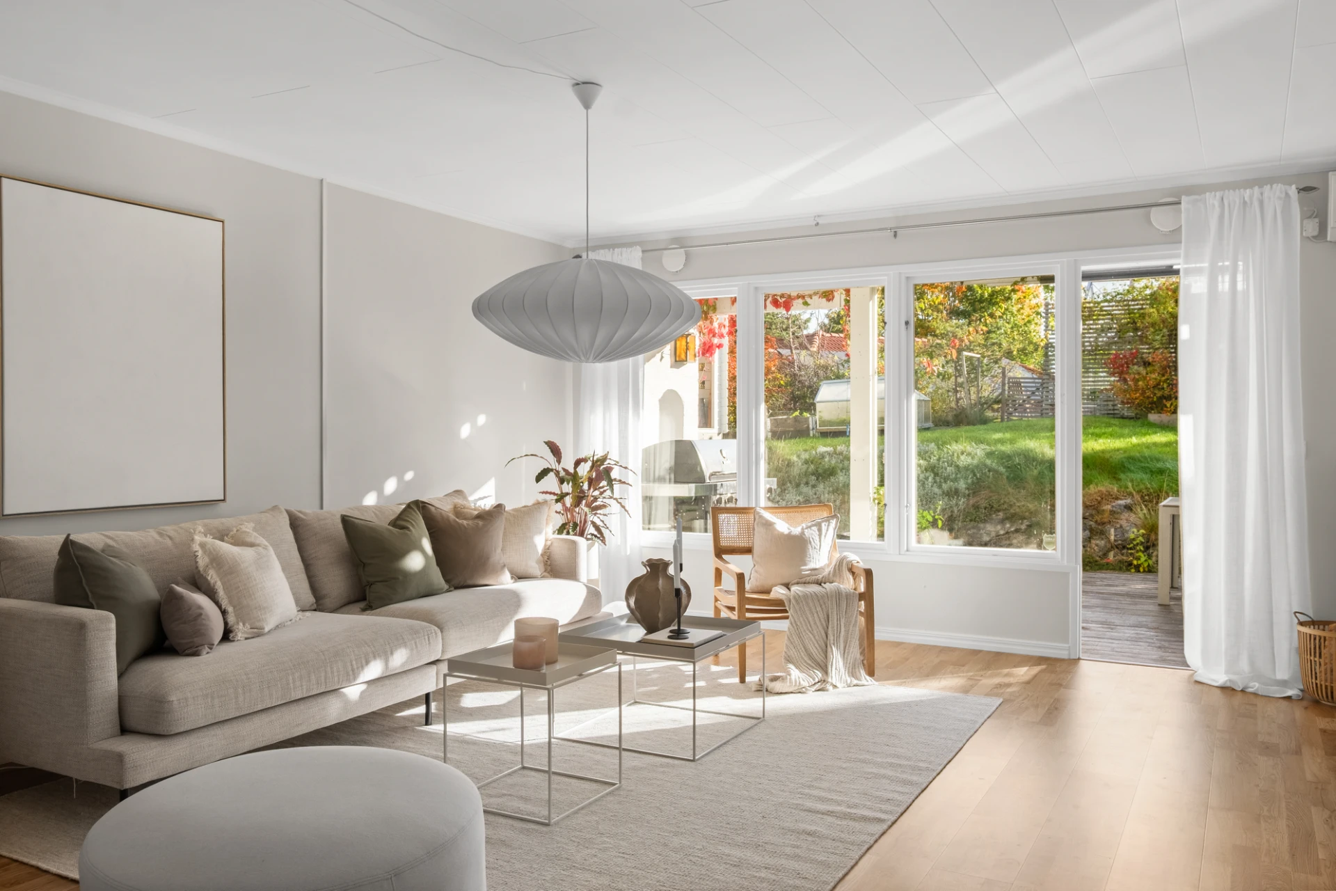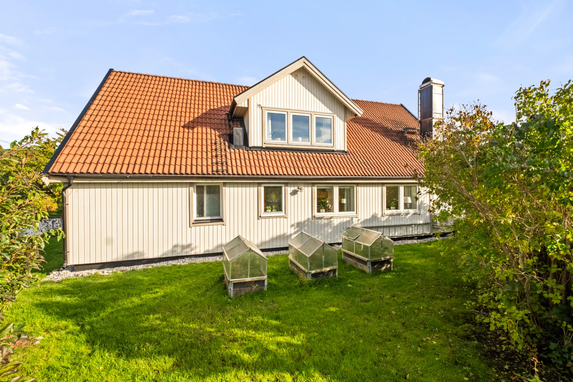 Generöst vardagsrum med plats för soffgrupp, soffbord, tv-möbel och matplats. En täljstenskamin skänker både värme och mysfaktor under höst- och vinterhalvåret. Ekparkett, ljust målade väggar och altandörr ut till den trädäckade uteplatsen. Här finns även en luft-luftvärmepump som kan leverera både värme och kyla för extra komfort året runt.