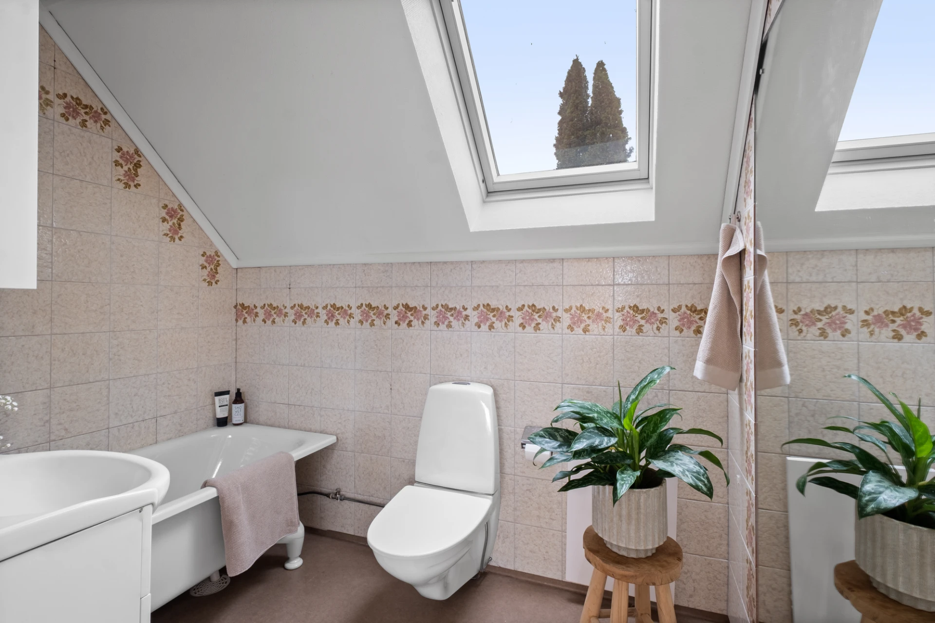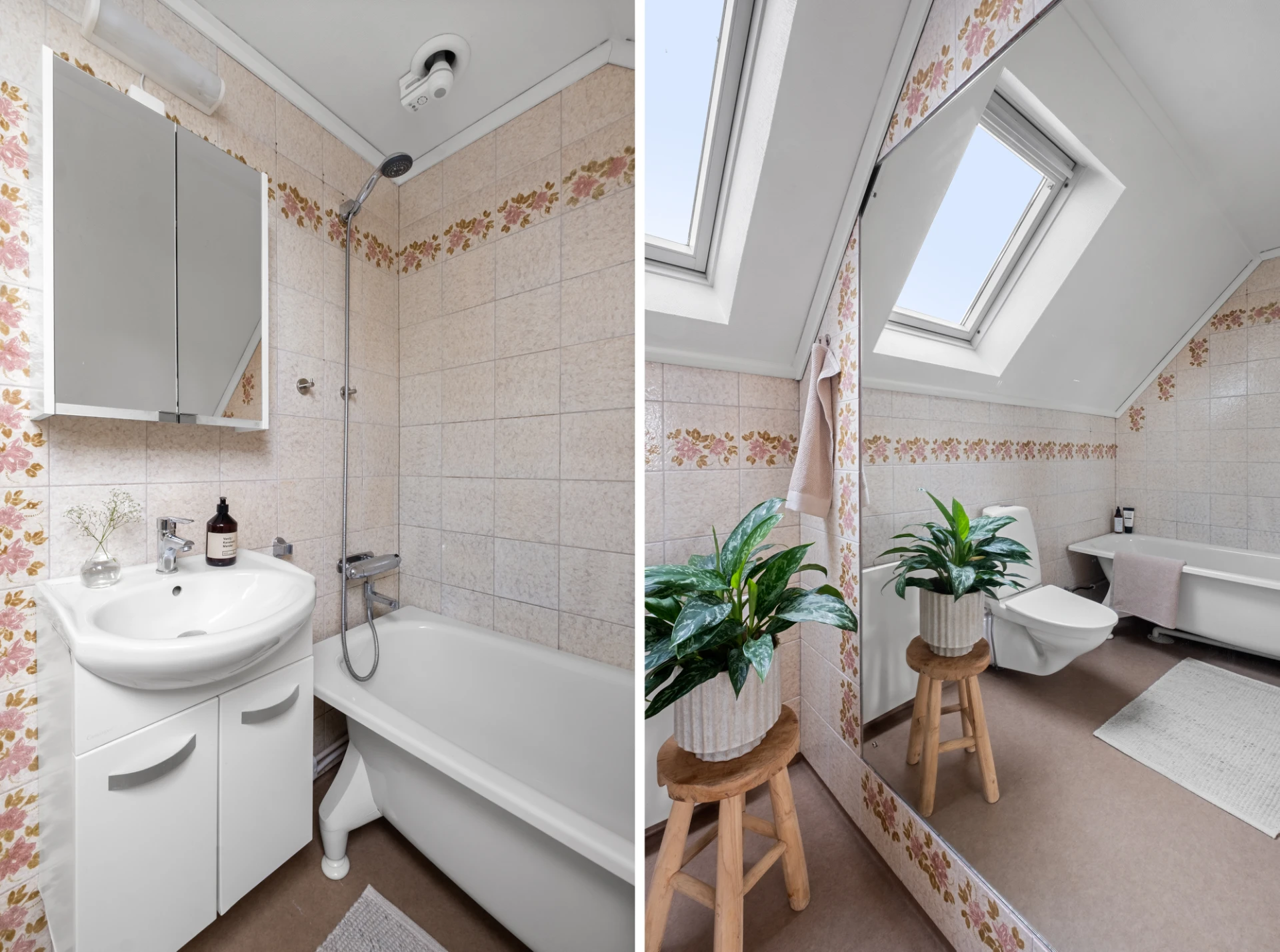 Äldre badrum med plastmatta på golv och kakel på väggarna. Ett takfönster släpper in ljus. Badrummet är utrustat med badkar, handfat på kommod, spegelskåp samt wc. En stor infälld spegel i kaklet ger badrummet en härlig karaktär.