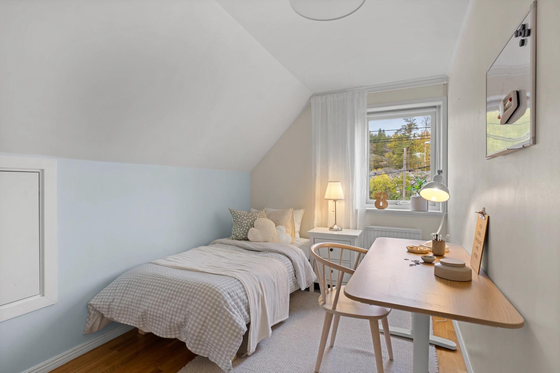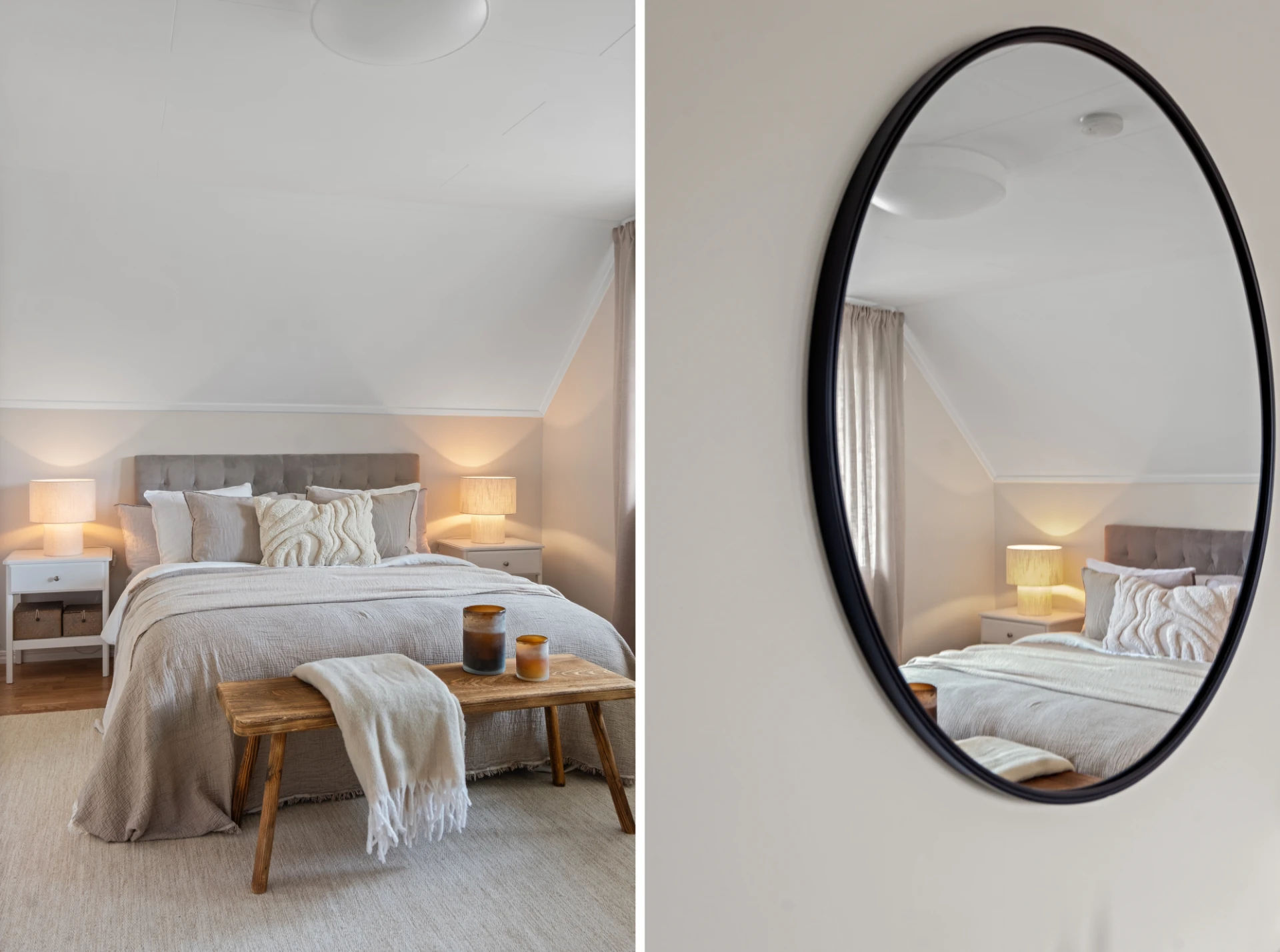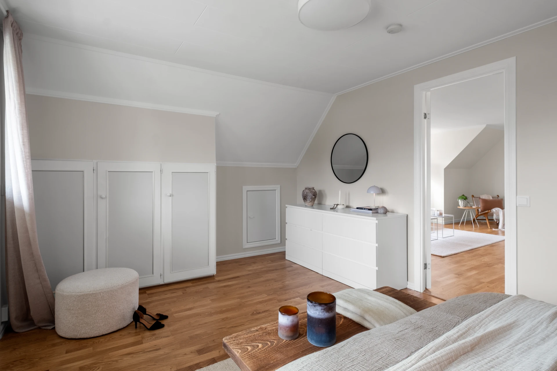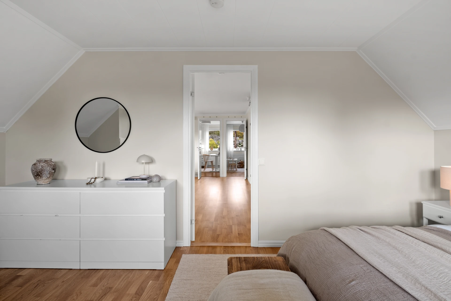 Två identiska, spegelvända sovrum. Båda rummen har ljusa väggar och ekparkett på golv. Praktiska kattvindar ger extra förvaringsmöjligheter. Här finns plats för säng, skrivbord och byrå om så önskas - perfekt som barnrum, gästrum eller hemmakontor.