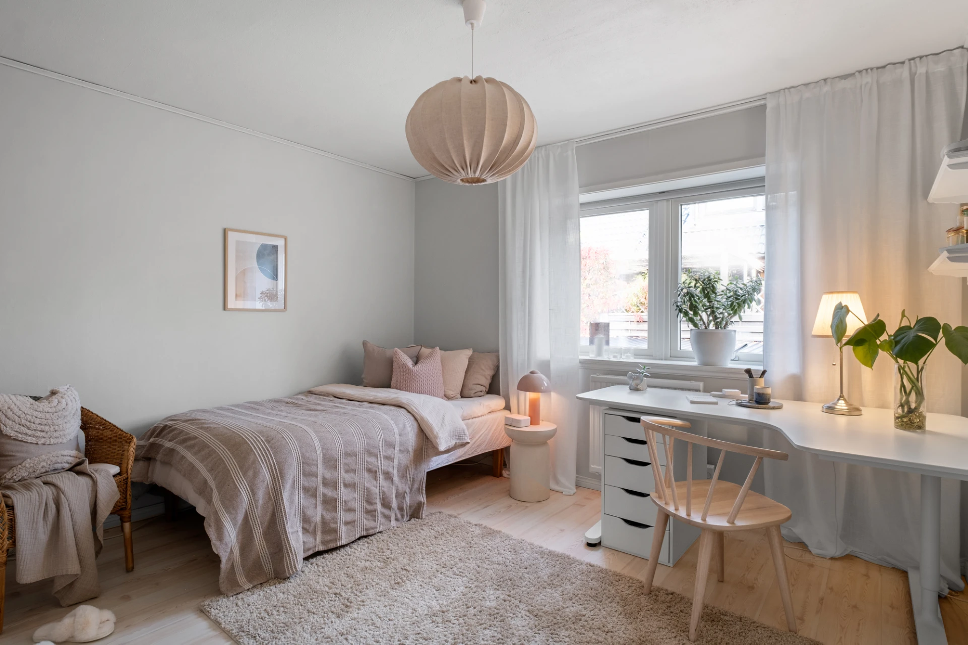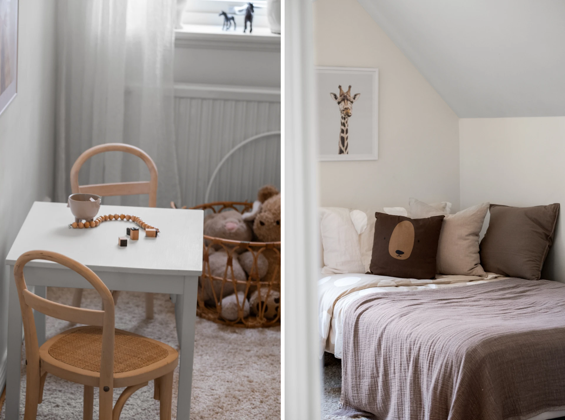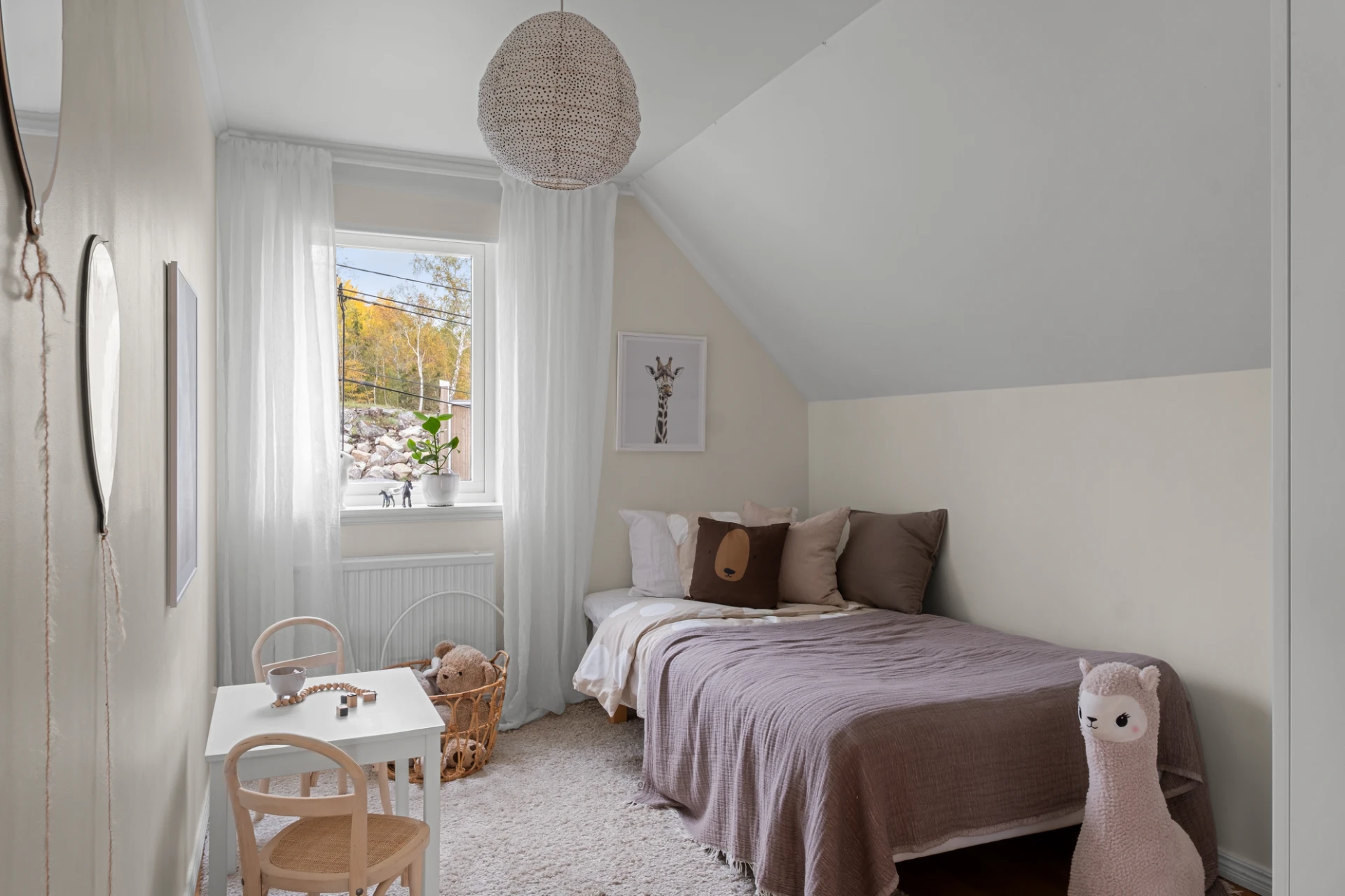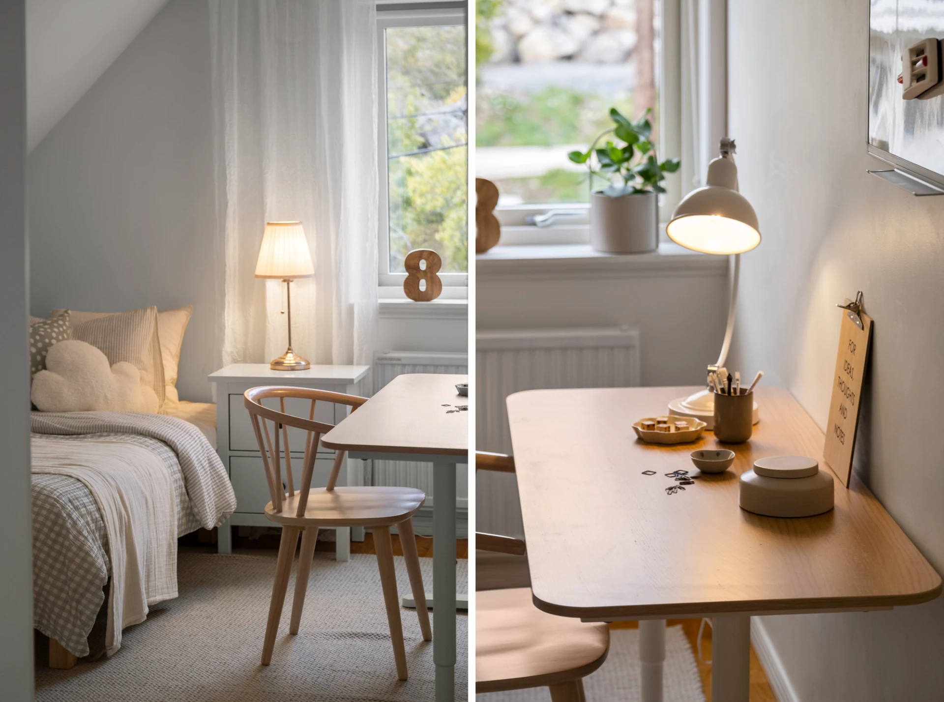 Två identiska, spegelvända sovrum. Båda rummen har ljusa väggar och ekparkett på golv. Praktiska kattvindar ger extra förvaringsmöjligheter. Här finns plats för säng, skrivbord och byrå om så önskas - perfekt som barnrum, gästrum eller hemmakontor.