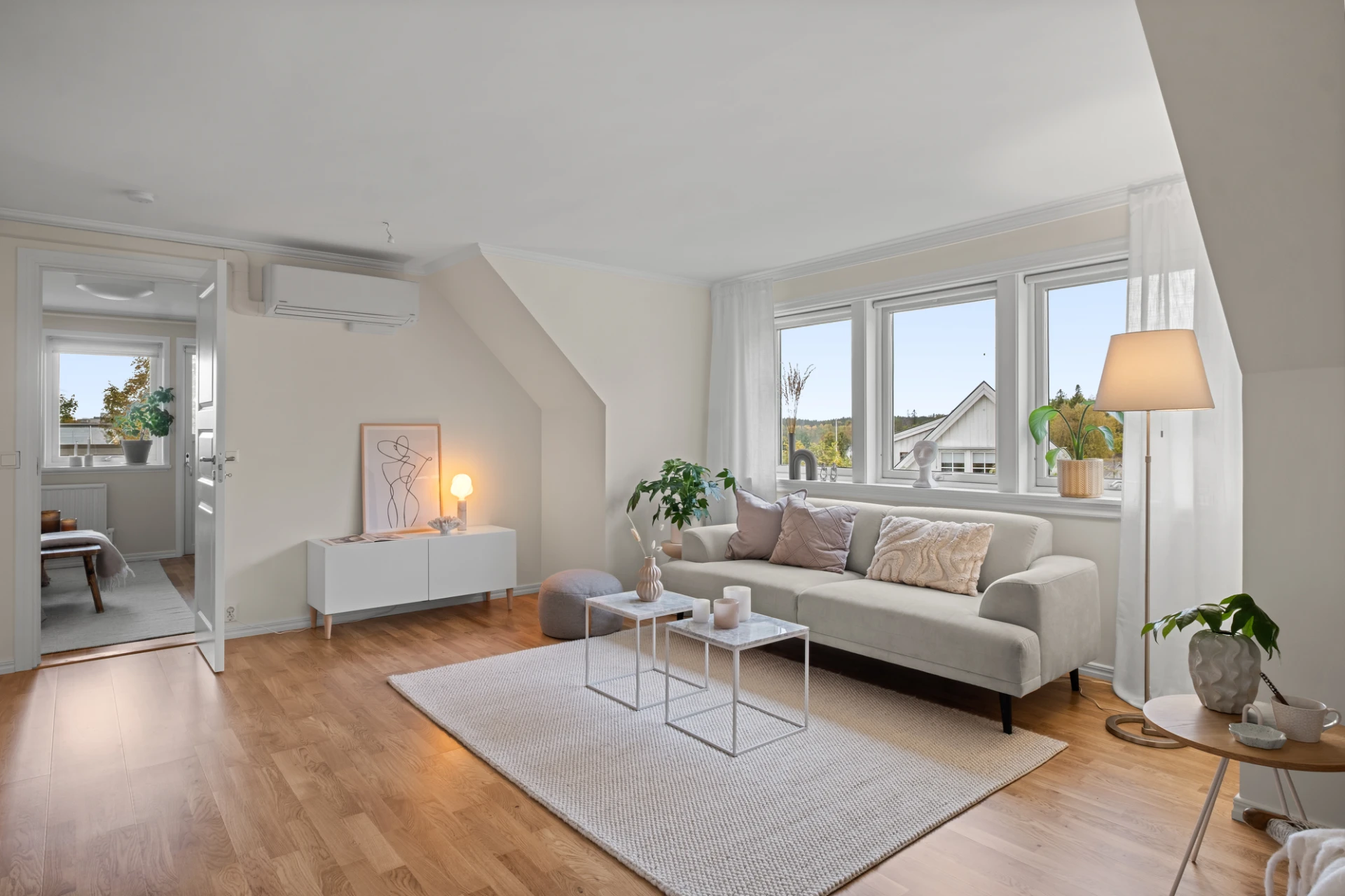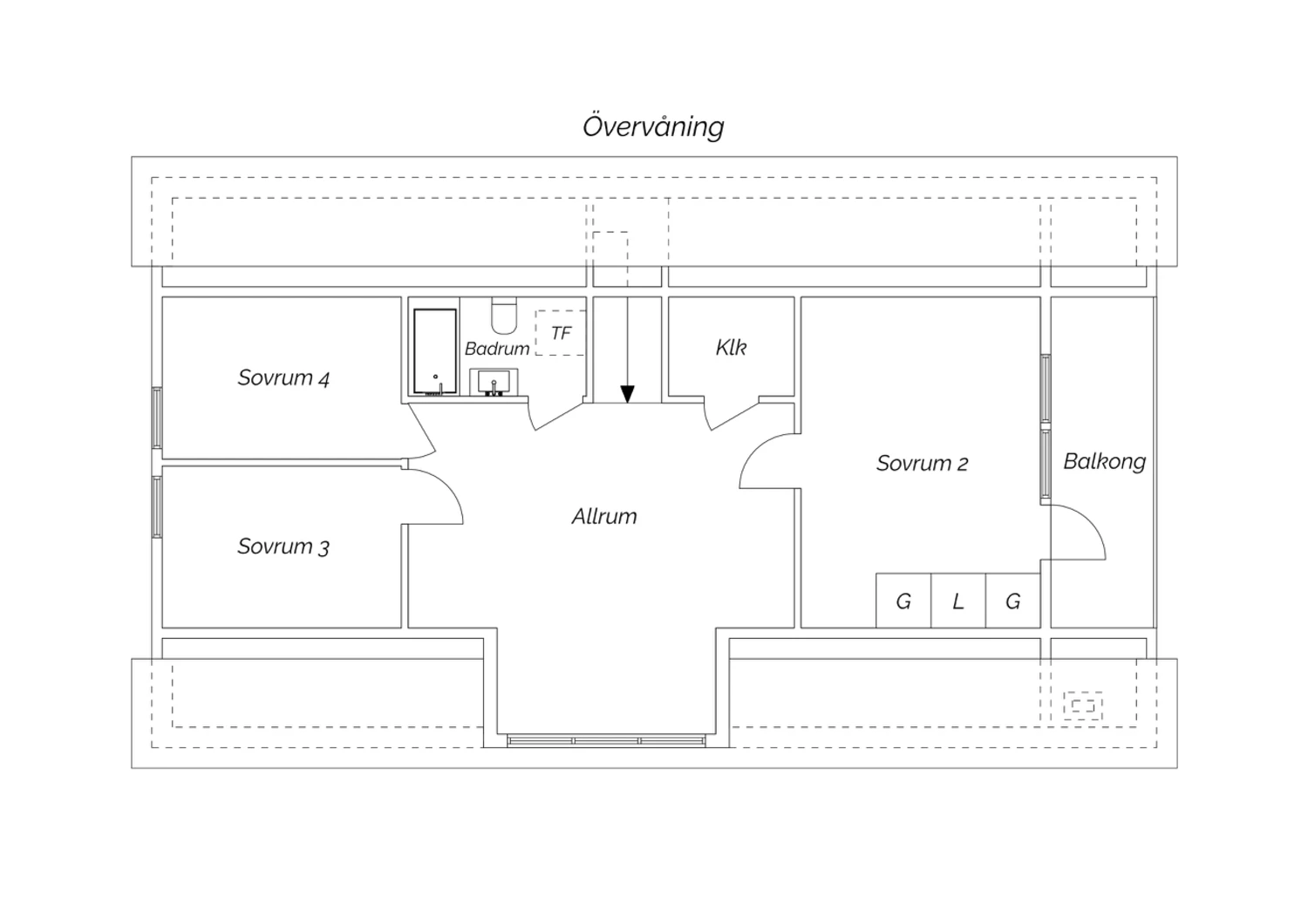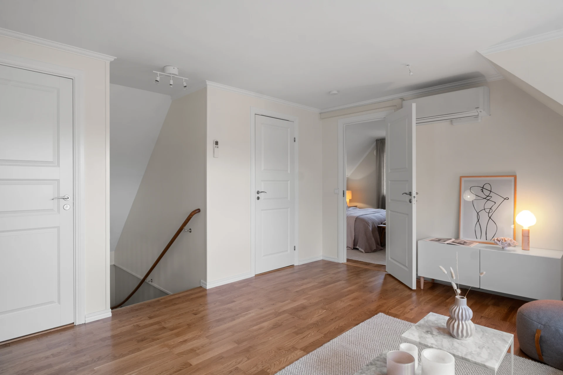 Via den vitmålade trappan från entrévåningen når man detta allrum med gott om plats för den mysiga soffgruppen. Härlig takkupa släpper in ljus. Ekparkett och ljust målade väggar. Luft-luftvärmepump som även här kan ge både värme och kyla. Från detta rum nås samtliga rum på övervåningen. Härifrån nås även en stor och praktisk klädkammare.