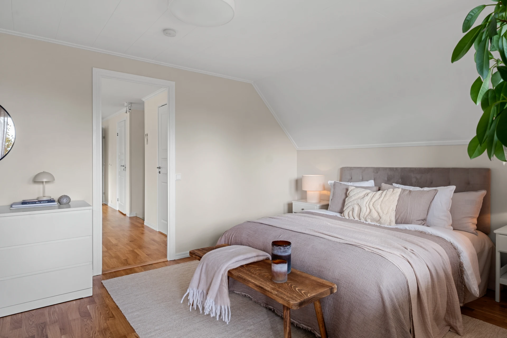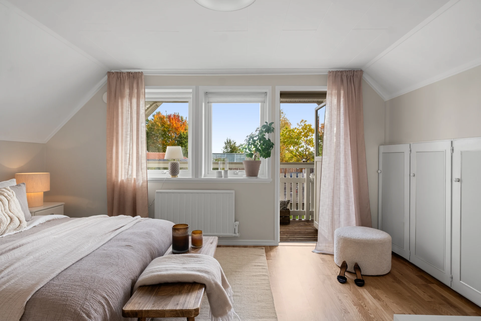 Generöst sovrum med plats för dubbelsäng med tillhörande sängbord. Målade väggar i ljusgrått och ekparkett på golv. Förvaringsmöjligheter i inbyggda garderober samt kattvind. Härifrån nås en rymlig balkong med härligt solläge.