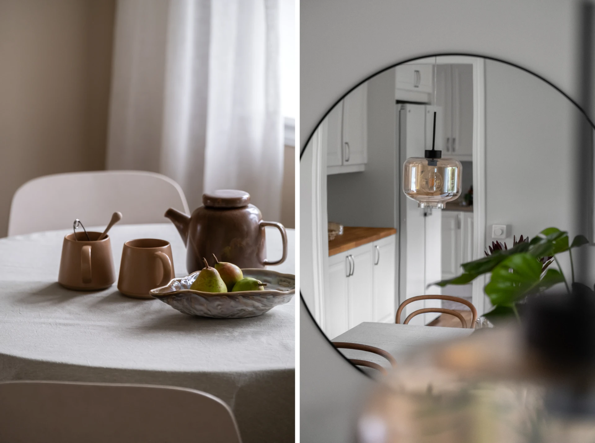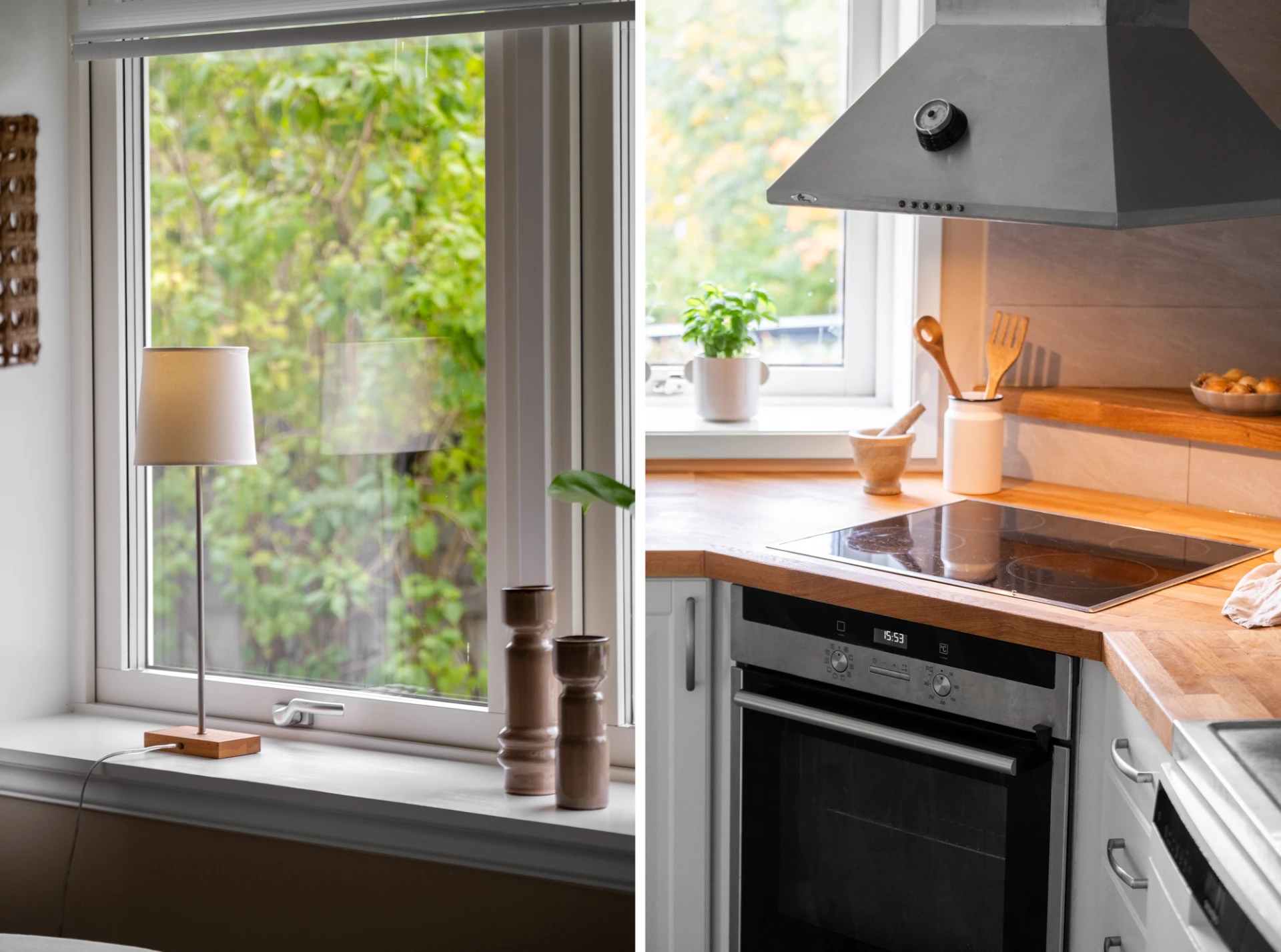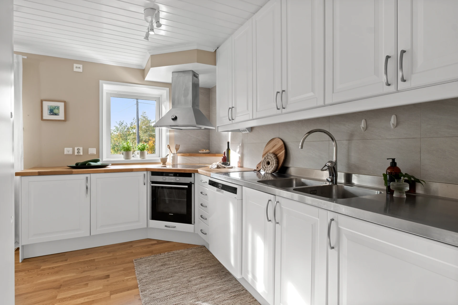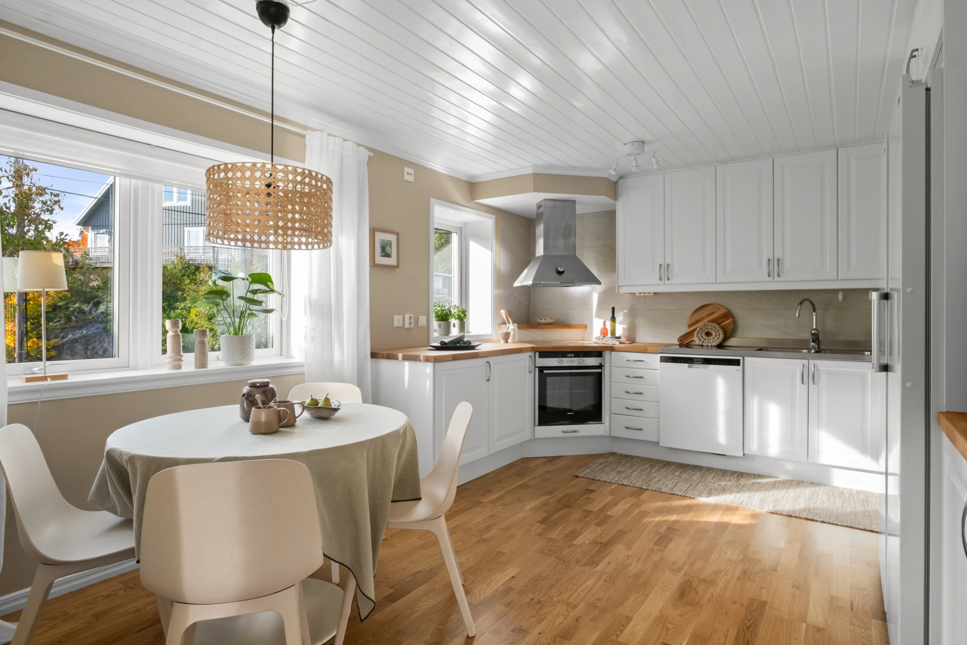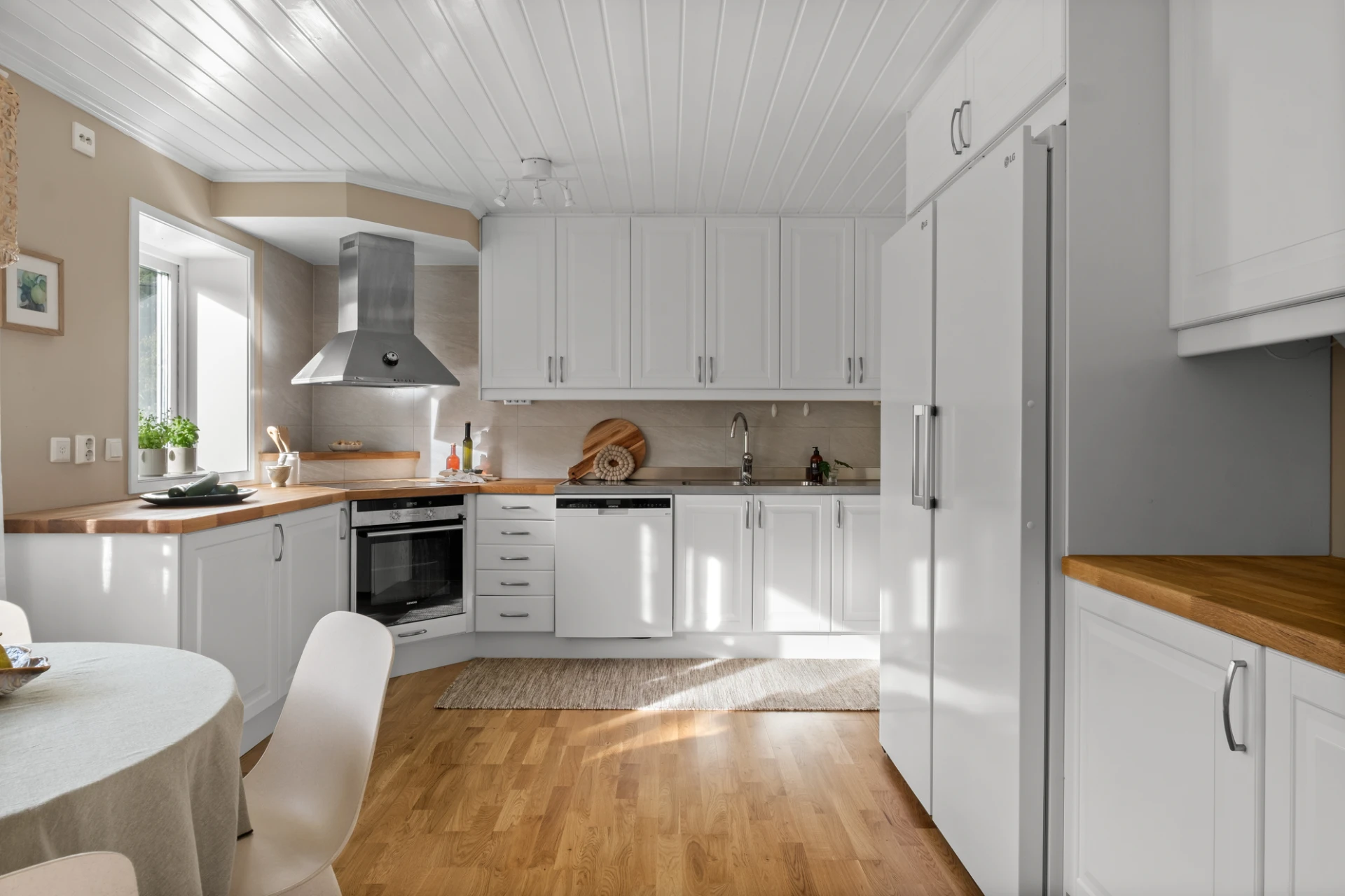Med öppning från vardagsrummet och hallen nås det ljusa köket. Massiv träbänkskiva följt av diskbänk i rostfritt och ovan detta ett ljusgrått kakel satt i halvförband. Köket är utrustat med häll, ugn, rostfri fläkt, diskmaskin samt kyl och frys i fullhöjd. Gott om arbetsyta samt goda förvaringsmöjligheter. Plats för matbord framför fönster. Ekparkett och väggar målade i en beige nyans.