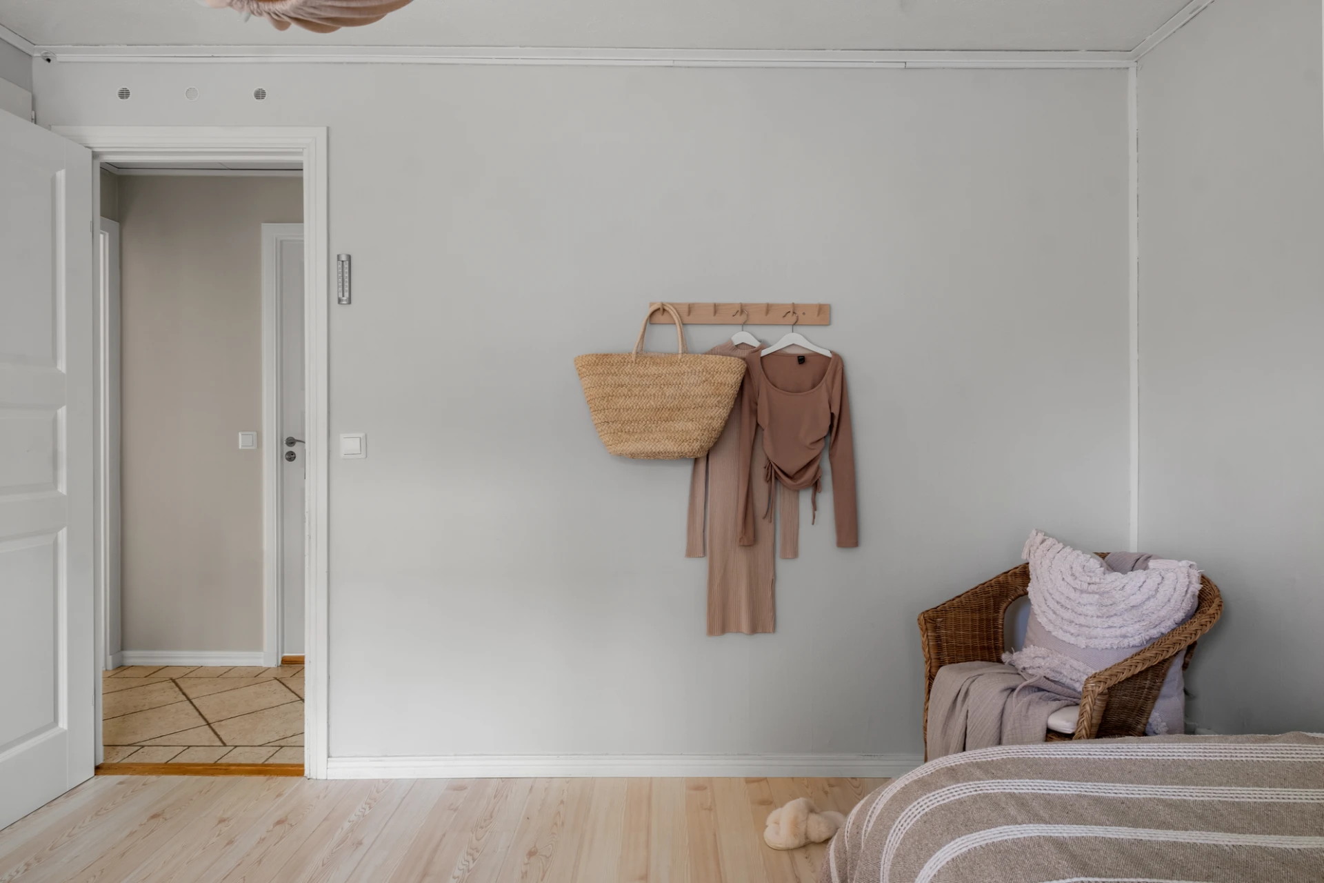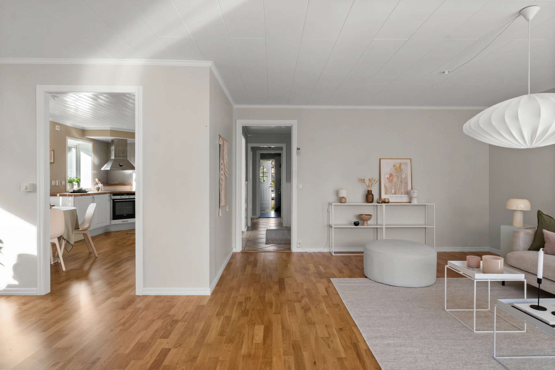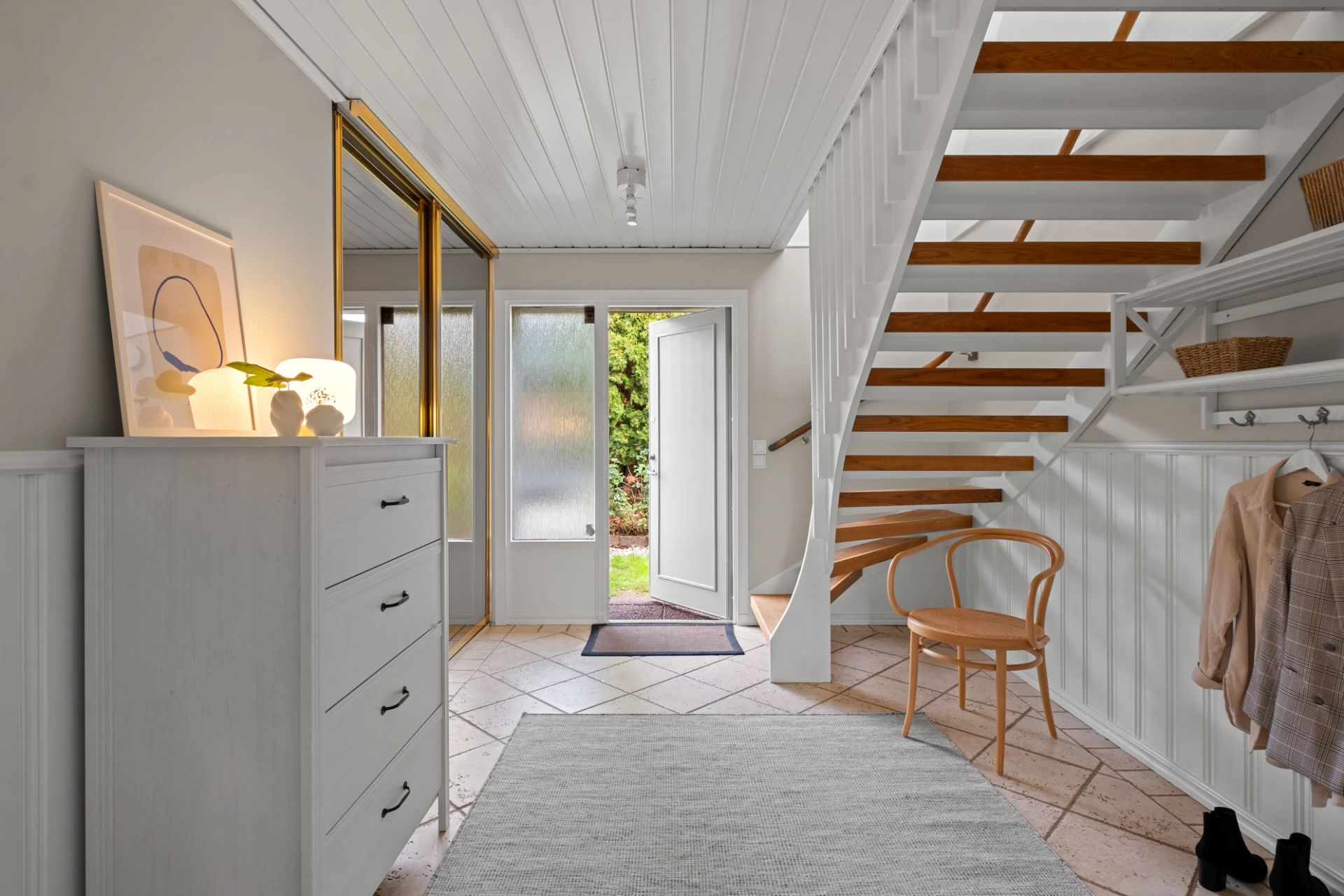 Välkomnande entréhall med avhängning direkt till höger bakom skjutdörrar i spegelglas. Ljust klinkergolv med elburen golvvärme, bröstpanel och ljust målade väggar.
