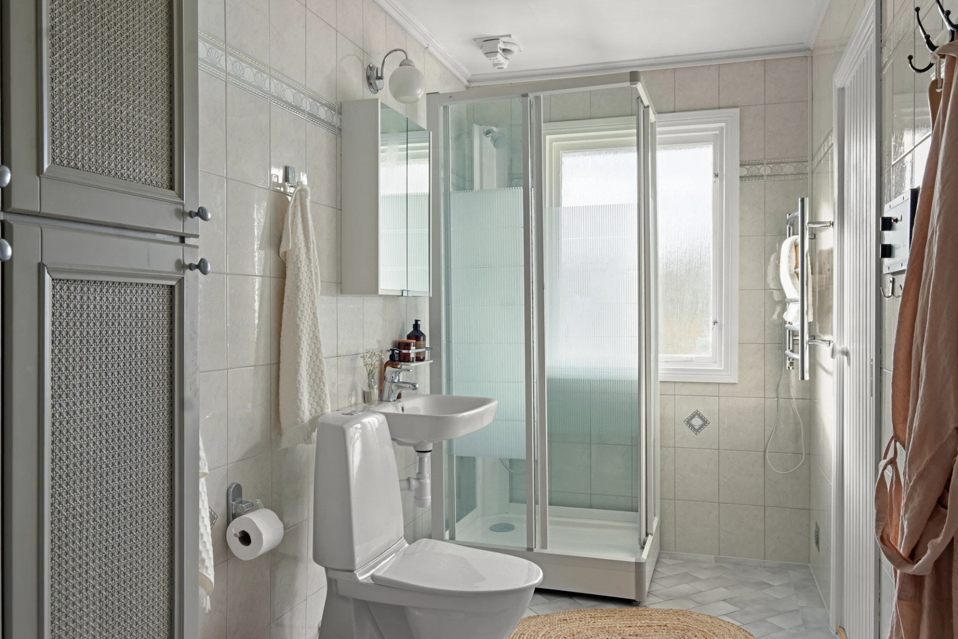Duschrum med ljusgrått klinkergolv med elburen golvvärme och vitt kakel på vägg. Duschkabin, handfat, spegelskåp, wc handdukstork samt högskåp för förvaring. Frostat fönster släpper in ljus men ingen insyn. Härifrån nås en rymlig bastu med plats för 4-6 personer.
