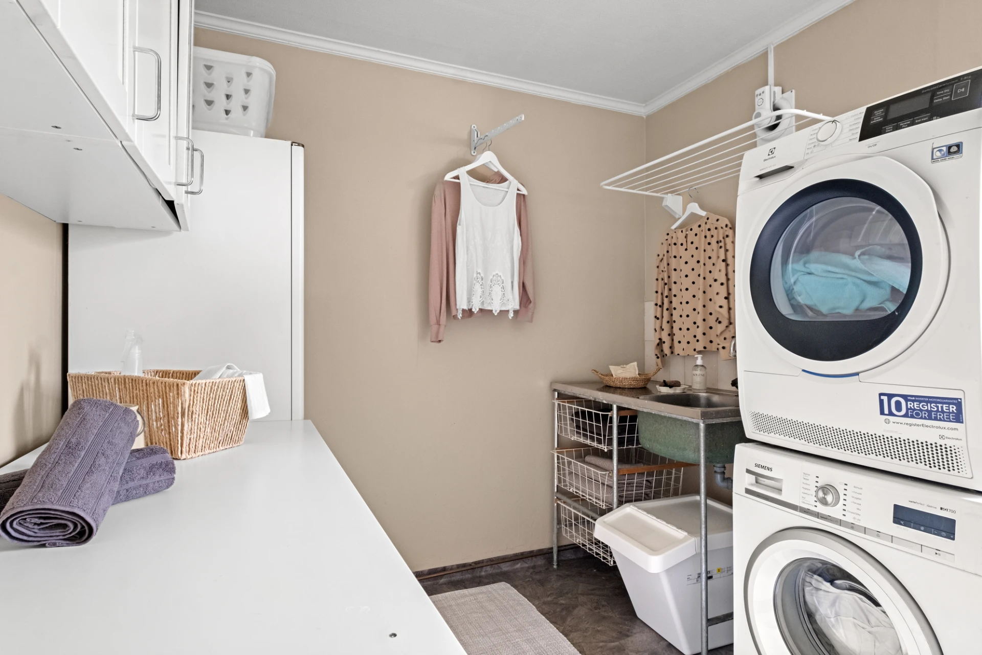 Praktisk tvättstuga/groventré med mörkgrå plastmatta och ljusa väggar. Här finns grovtvättställ, tvättmaskin och torktumlare placerade i pelare, varmvattenberedare samt både under- och överskåp som ger gott om förvaring. En funktionell och välplanerad yta som underlättar vardagen.