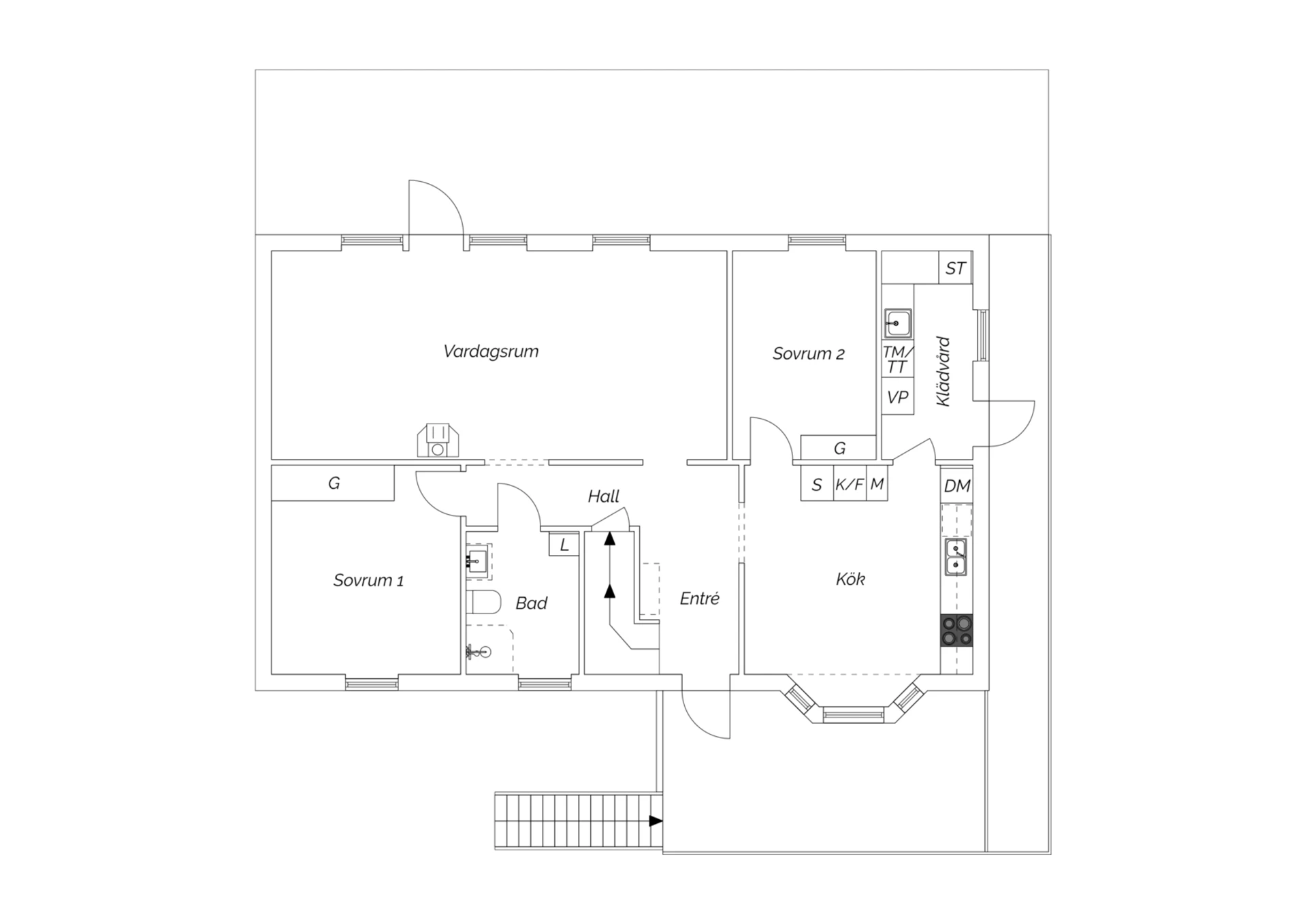 Här möts ni av en trevlig framsida med stor altan som fångar solens strålar från tidig eftermiddag till sen kväll. Här finns gott om plats för stor mat- eller loungegrupp.