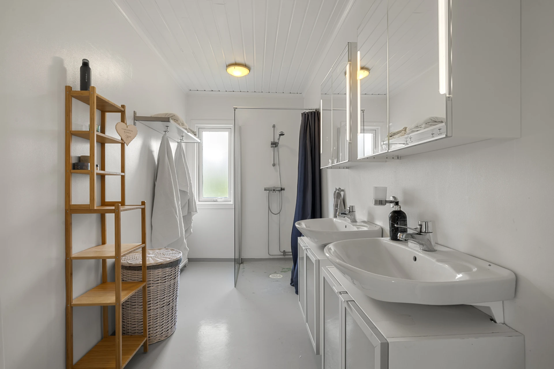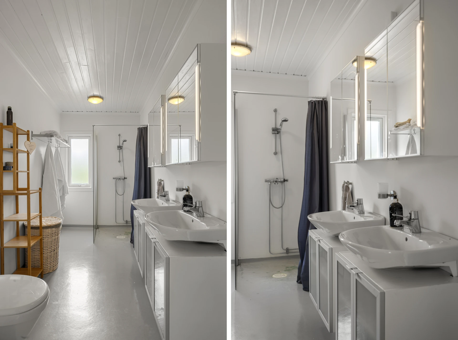 Ljust badrum med ljusgrå våtrumsmatta och vita väggar. Badrummet är utrustat med dusch bakom glasvägg, wc, dubbla handfat med kommod samt dubbla spegelskåp med infälld belysning. Ett frostat fönster släpper in ljus och ger vädringsmöjlighet. Vitmålad träpanel i taket.
