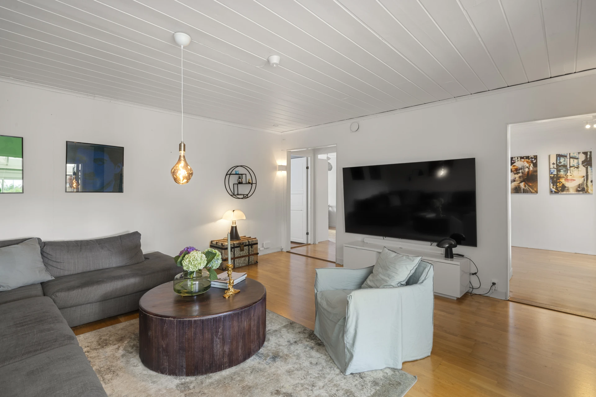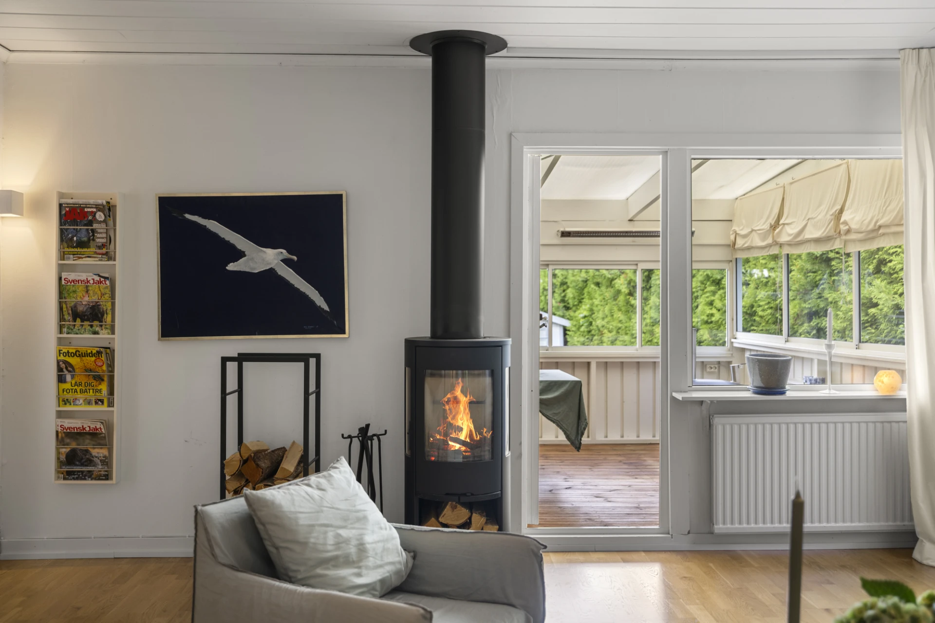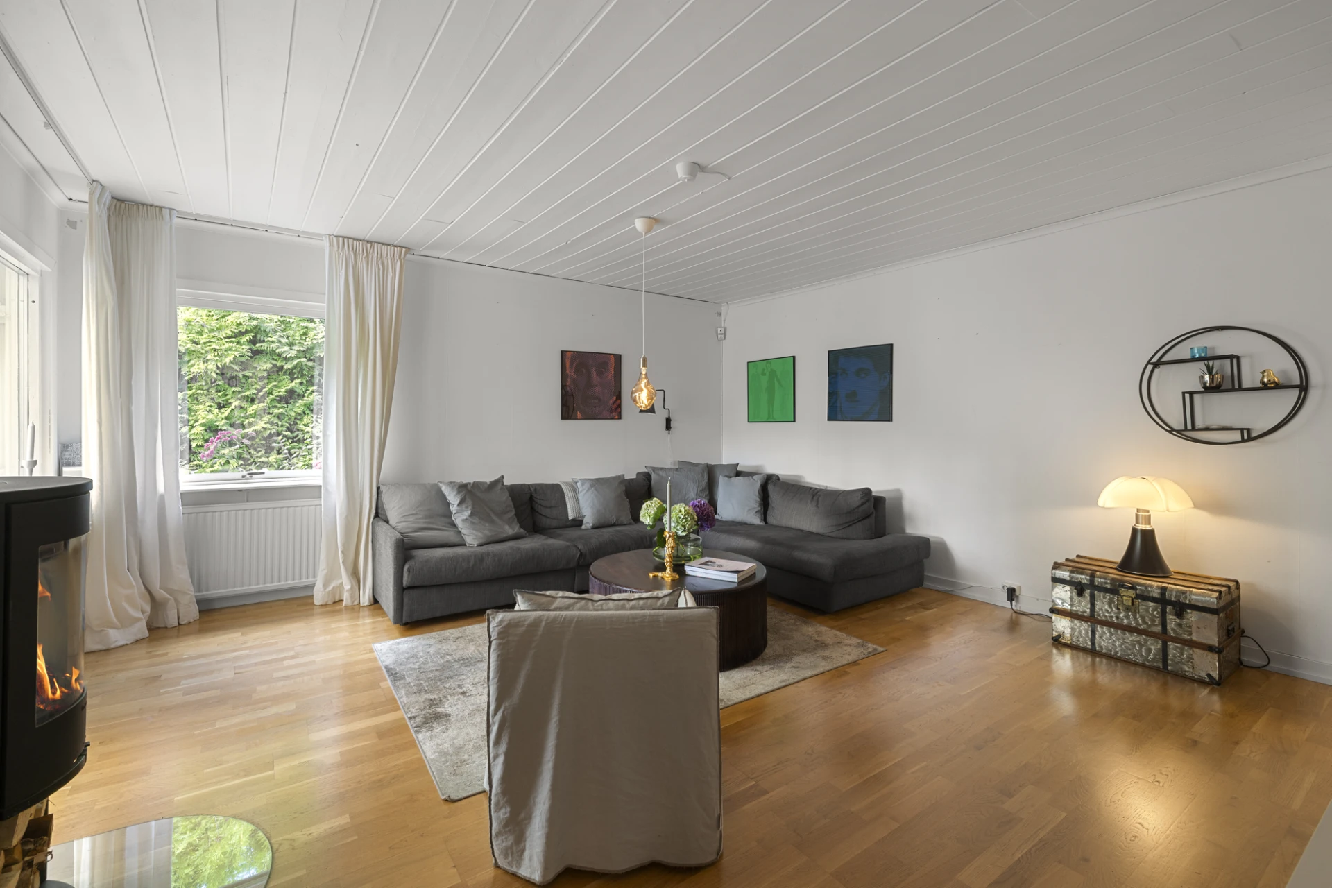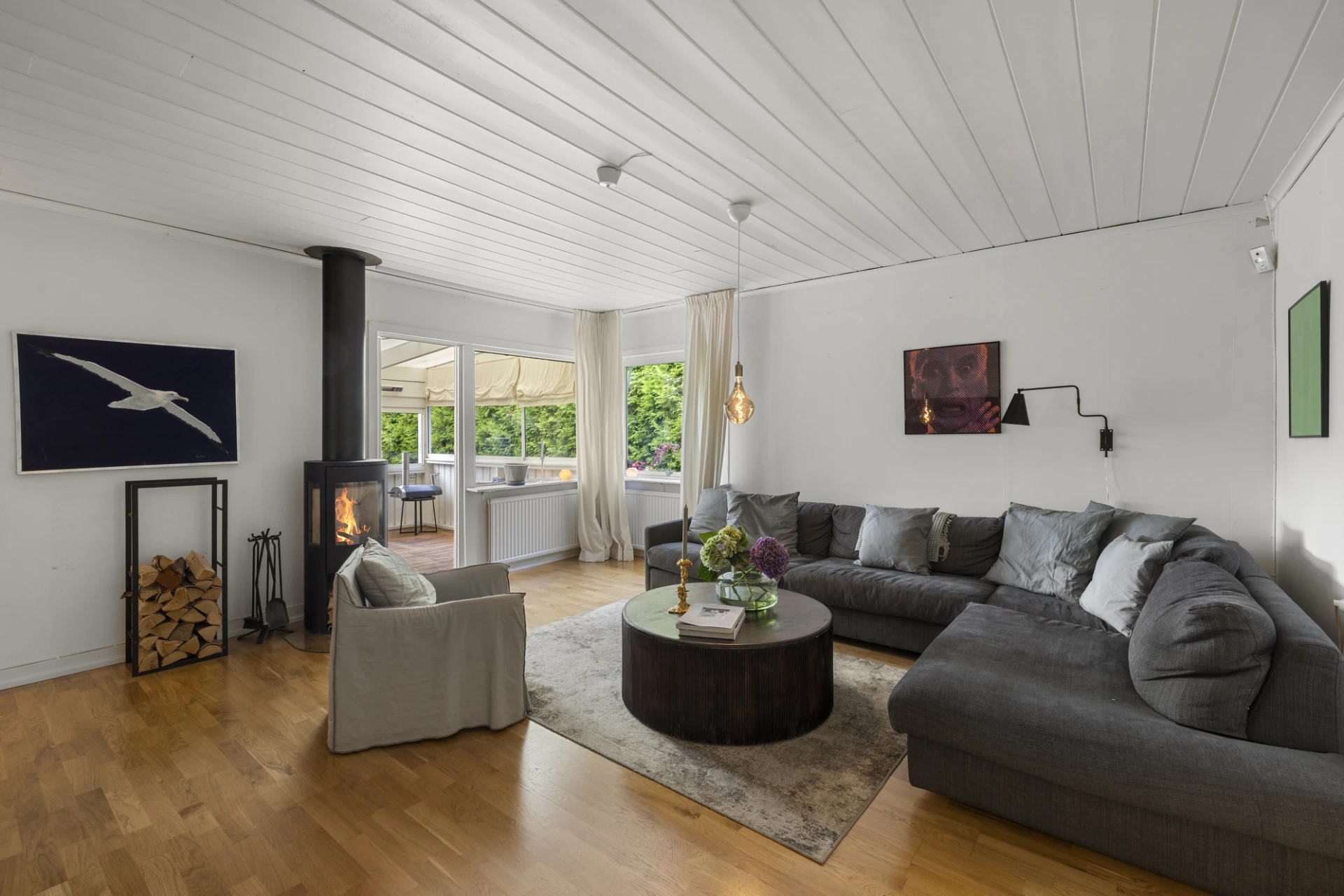 Vardagsrummet erbjuder gott om plats för en stor soffgrupp och möblemang för hela familjen. Den mysiga braskaminen skapar värme och trivsel under årets kalla dagar. Från vardagsrummet nås det inglasade uterummet som blir en naturlig förlängning av vardagslivet under både sommar och vinter. Parkettgolv, vitmålade väggar och vitmålad träpanel i taket.
