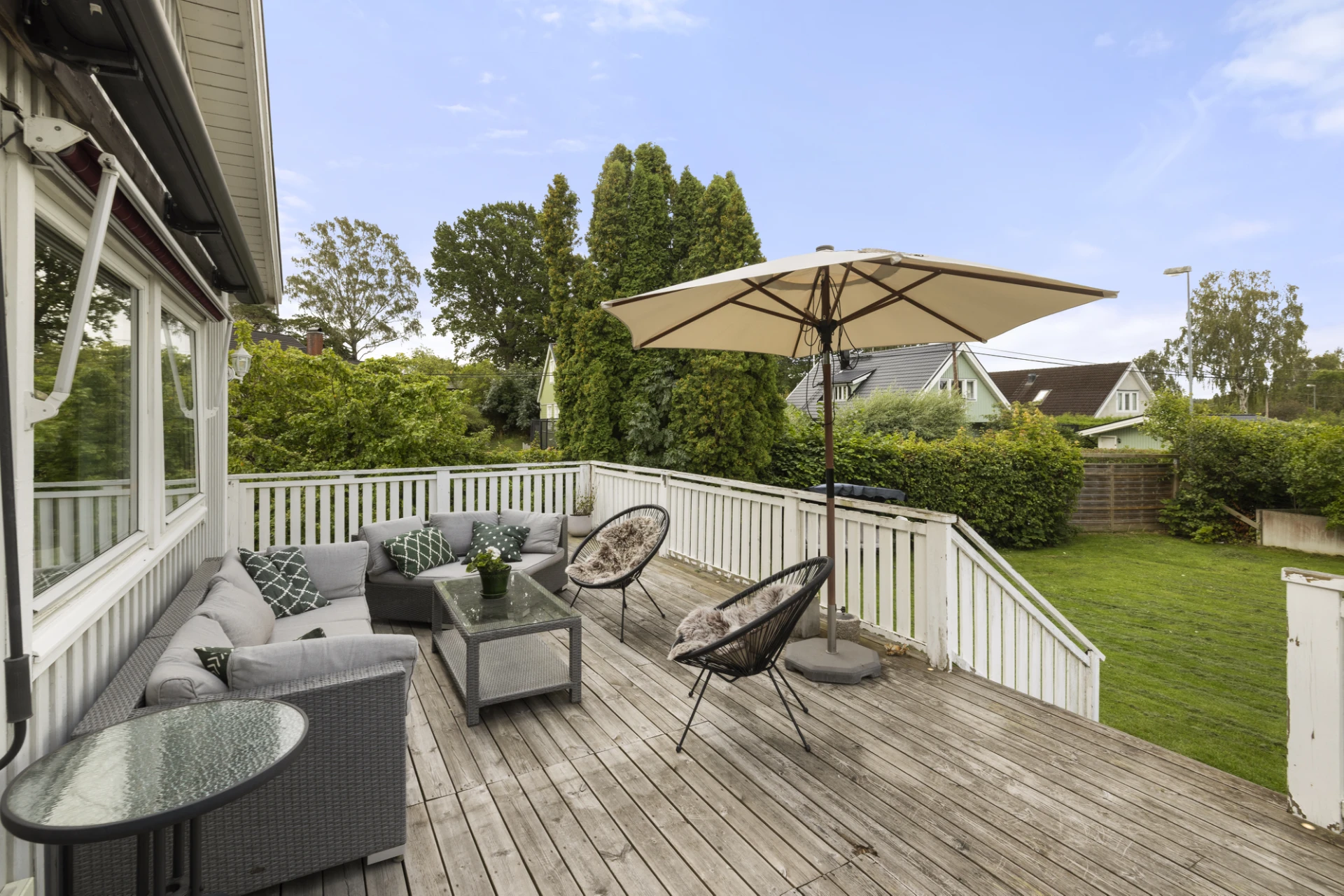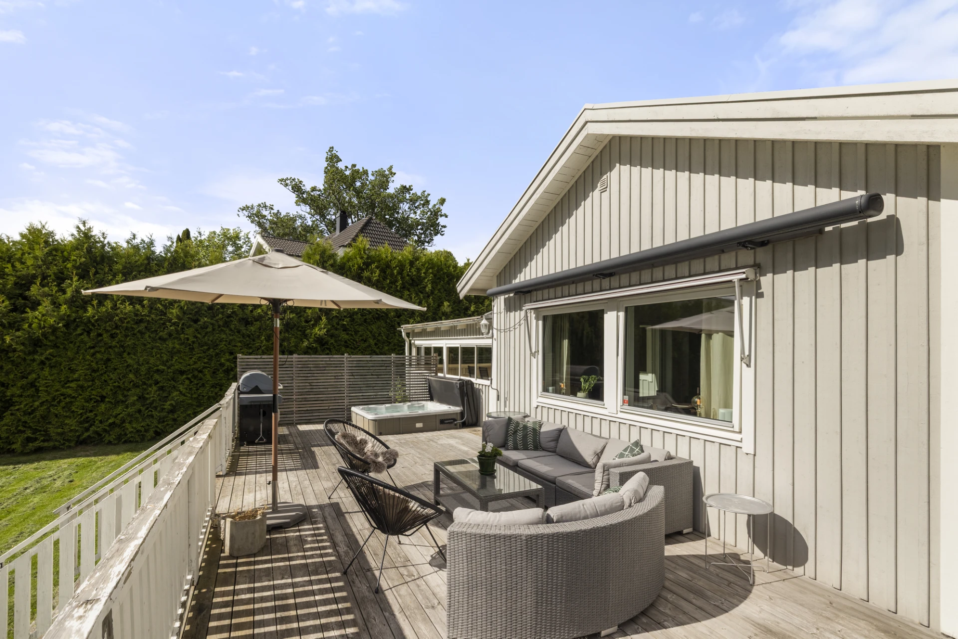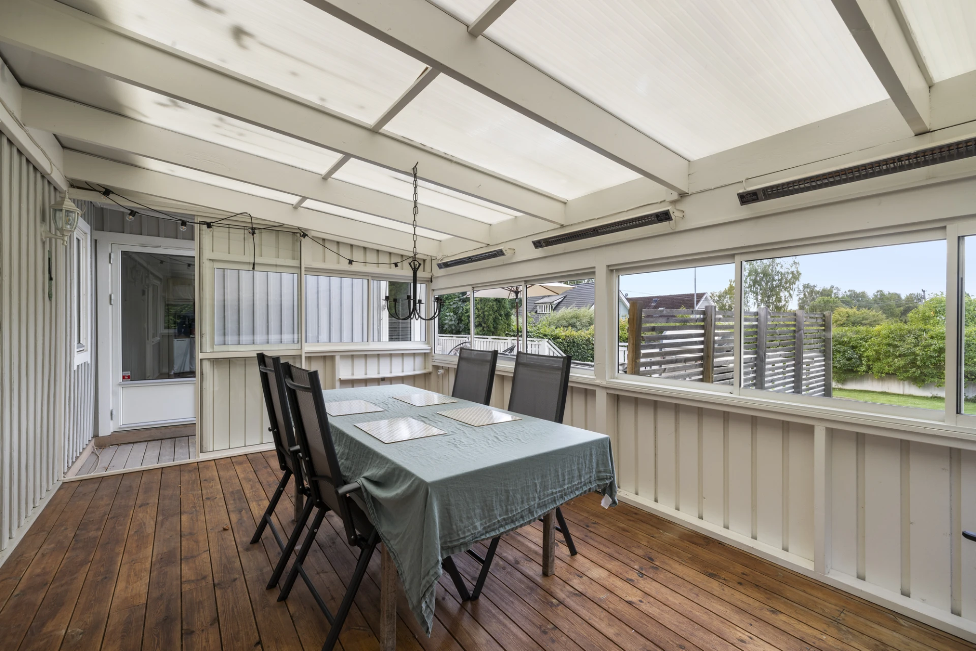 Vardagsrummet erbjuder gott om plats för en stor soffgrupp och möblemang för hela familjen. Den mysiga braskaminen skapar värme och trivsel under årets kalla dagar. Från vardagsrummet nås det inglasade uterummet som blir en naturlig förlängning av vardagslivet under både sommar och vinter. Parkettgolv, vitmålade väggar och vitmålad träpanel i taket.