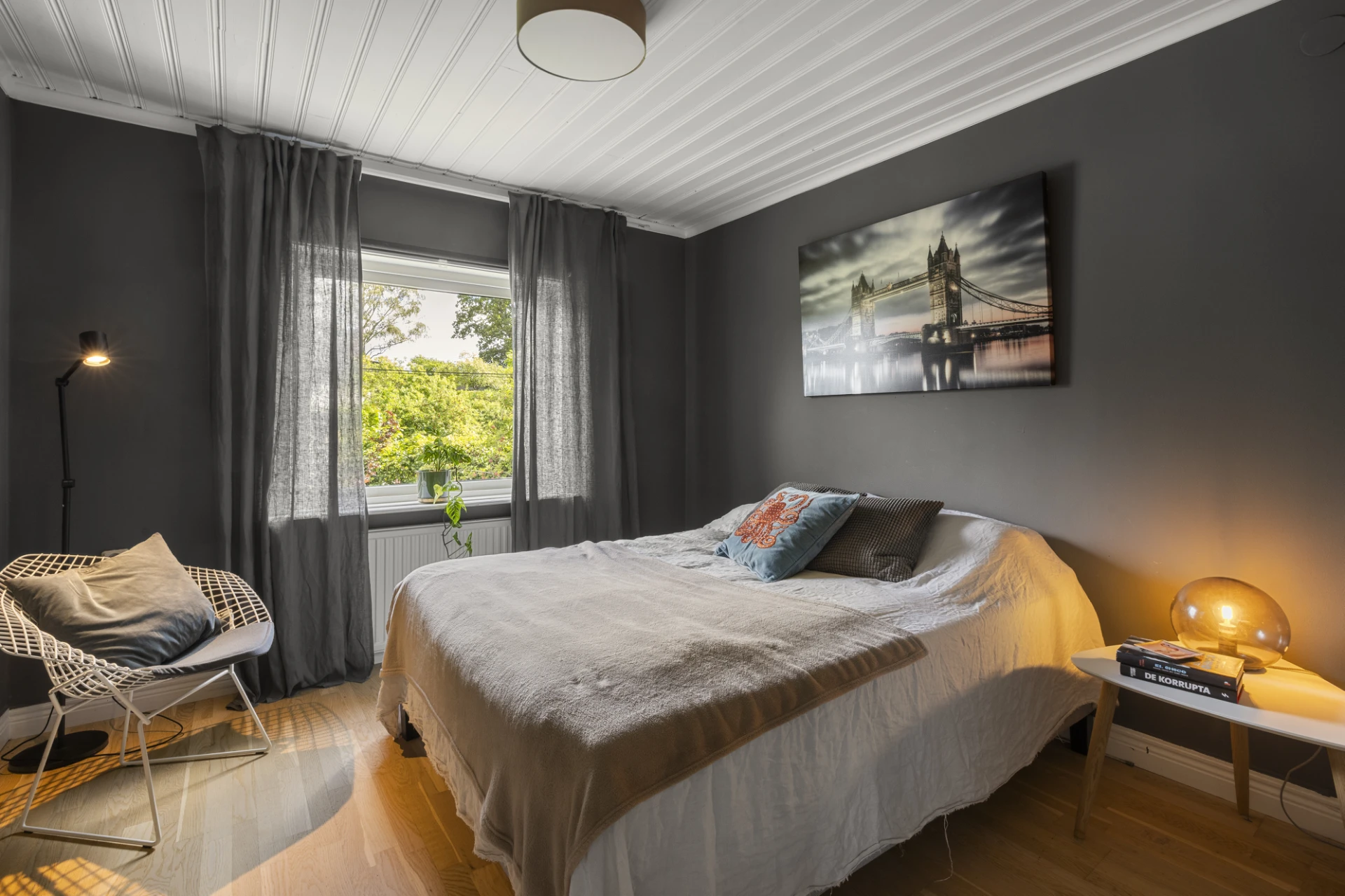 Generöst sovrum med plats för dubbelsäng med tillhörande sängbord om så önskas. Ljust parkettgolv och mörkgrå väggar samt vitmålad träpanel i taket.