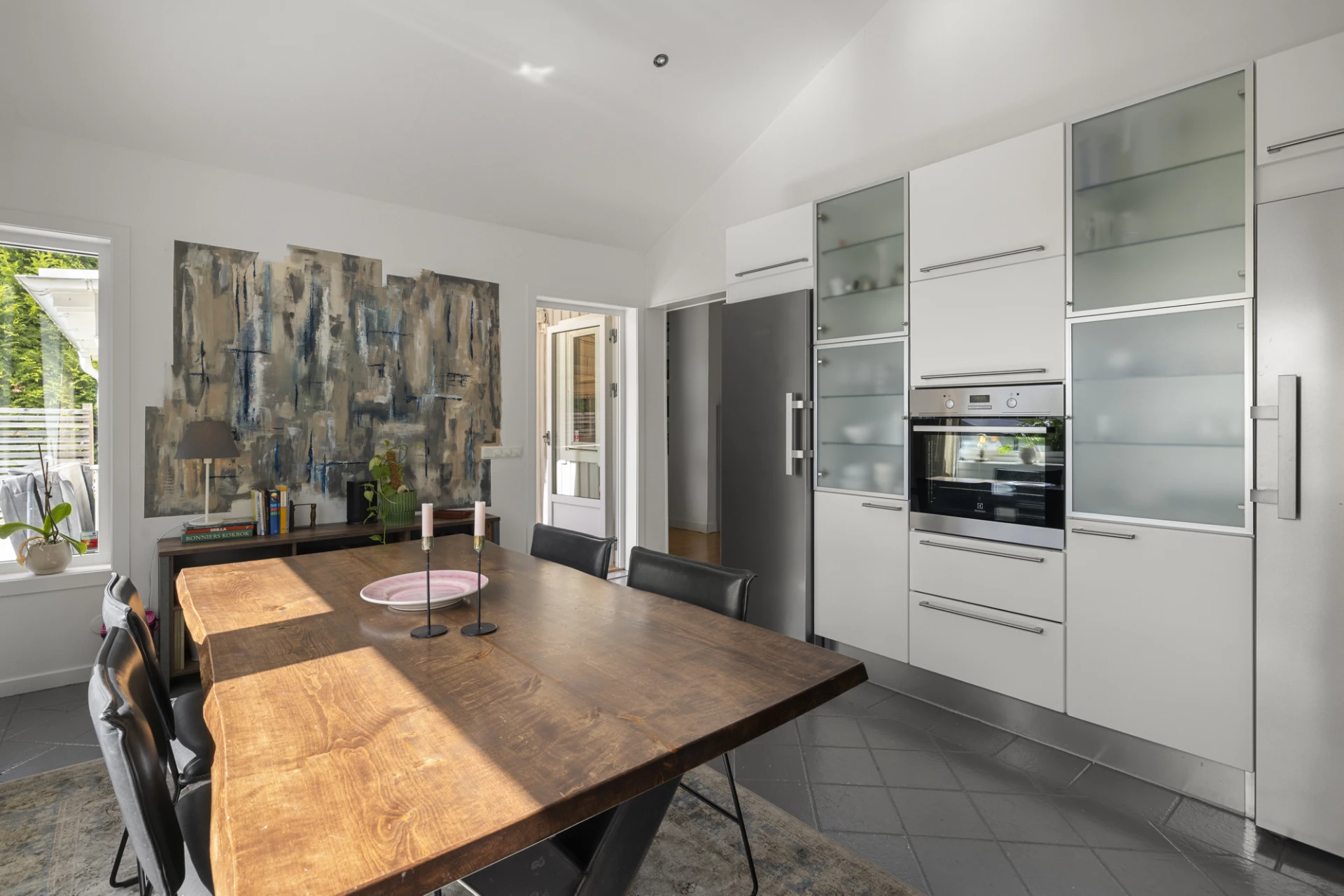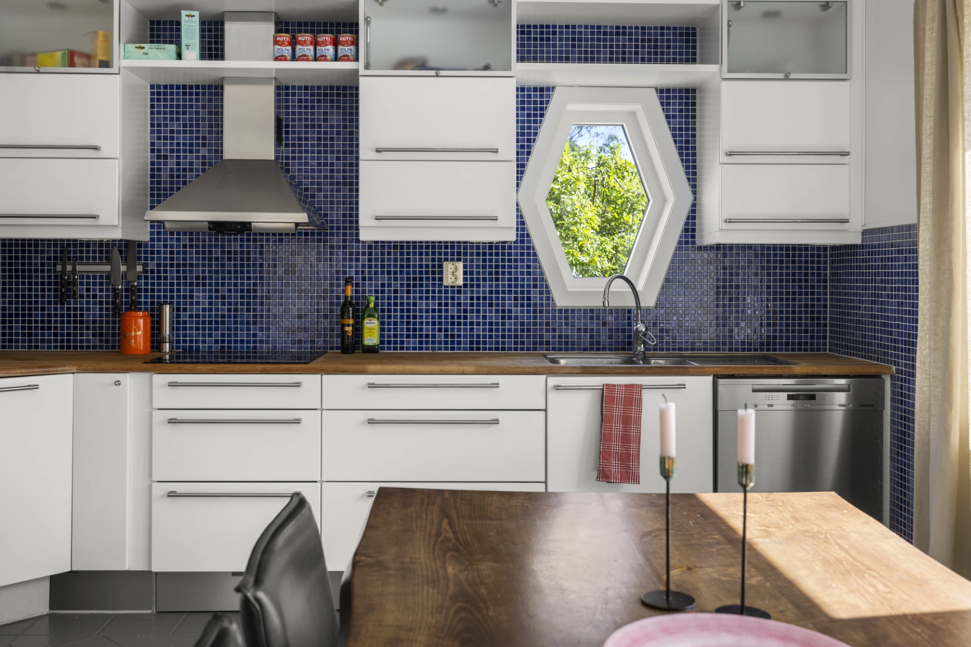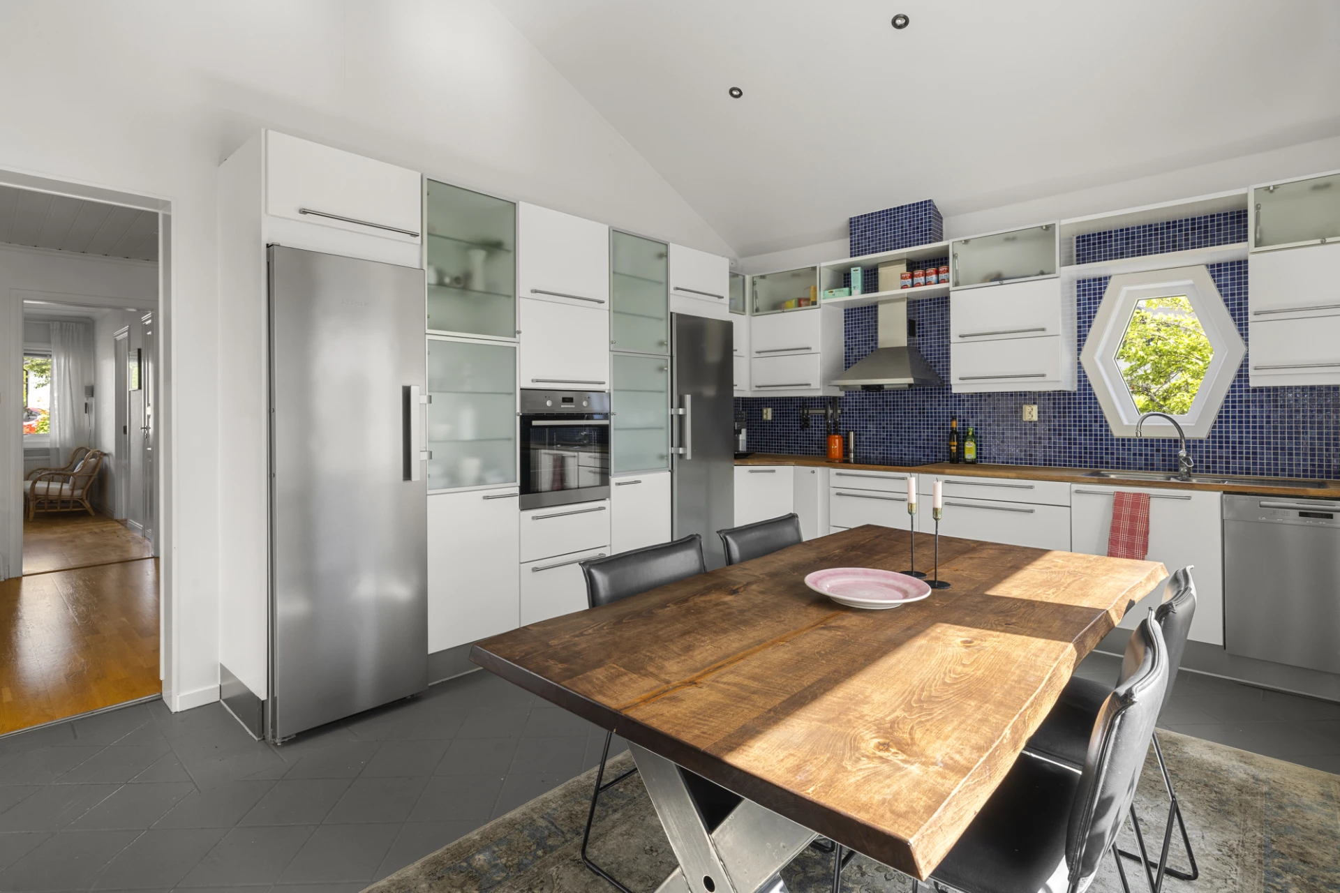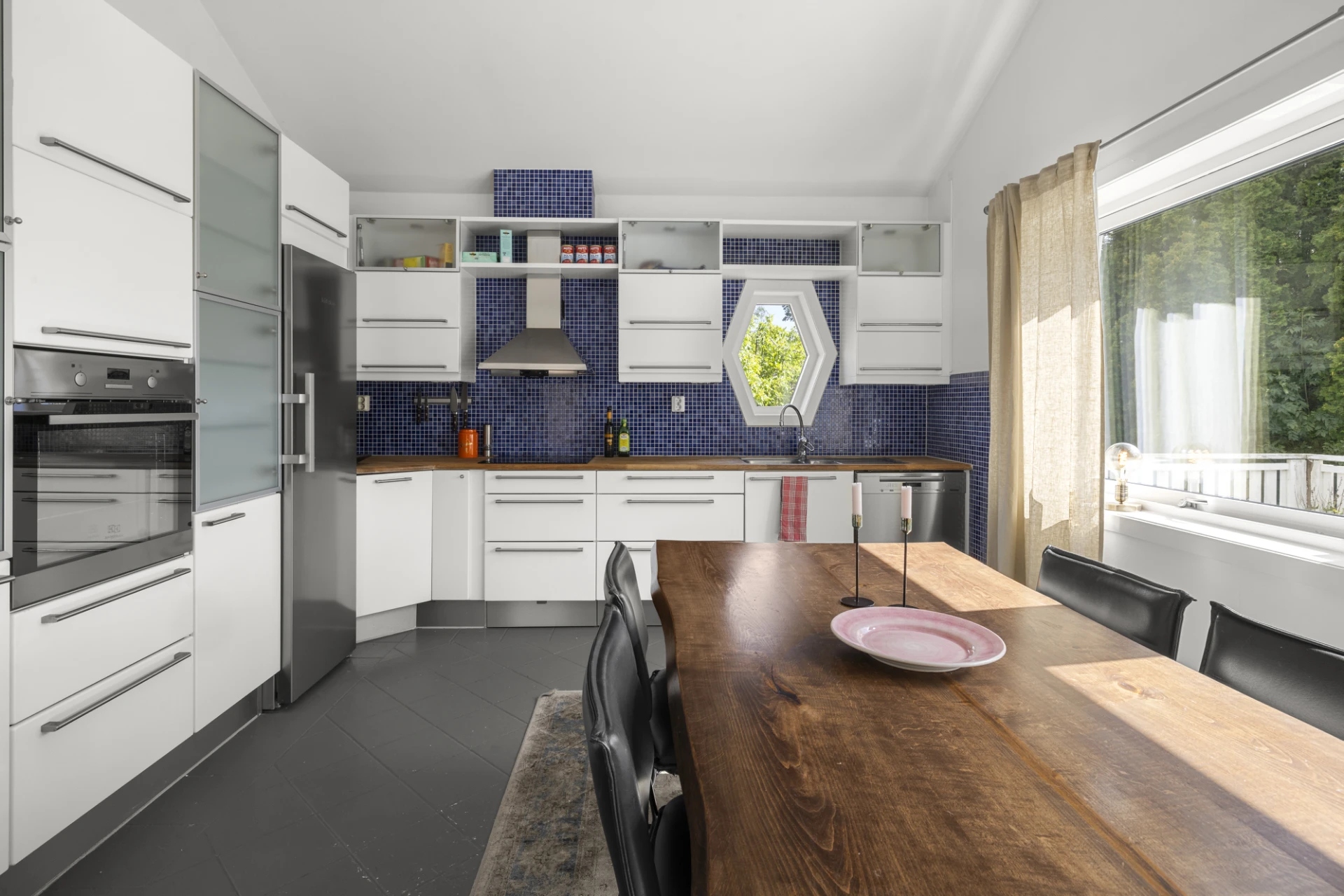 Köket har högt i tak och infällda spotlights. Stora fönster vetter mot baksidan och trädäcket och släpper in rikligt med ljus. Här finns gott om plats för ett stort matbord, och arbetsytor och förvaringsmöjligheter är väl tilltagna. Vita luckor med rostfria handtag, träbänk och blå mosaik som stänkskydd skapar en stilren känsla. Köket är utrustat med rostfria vitvaror: diskmaskin, fläkt, induktionshäll, kyl och frys samt ugn i arbetshöjd. Vitmålade väggar och grått klinkergolv med vattenburen golvvärme fullbordar köket.