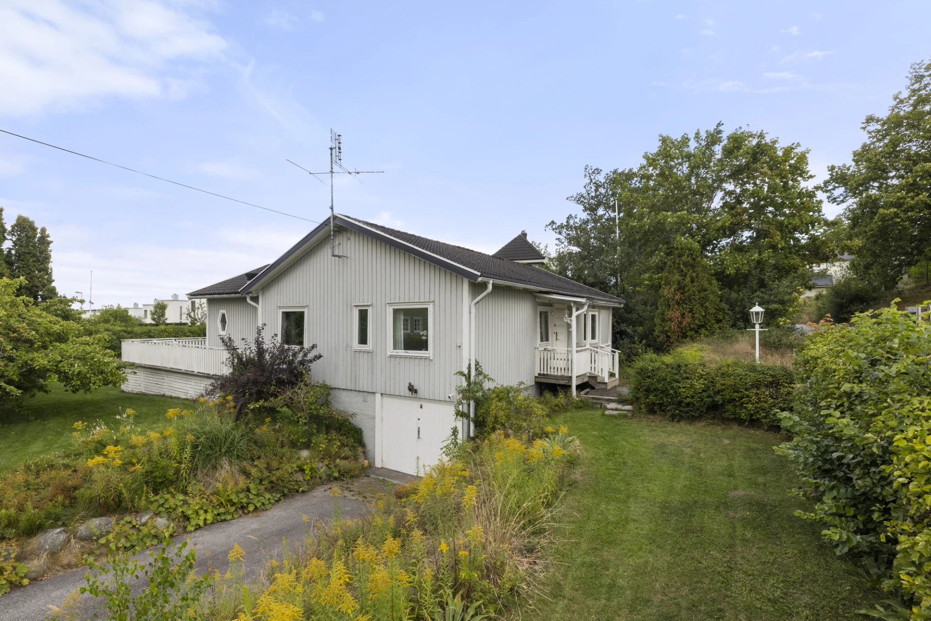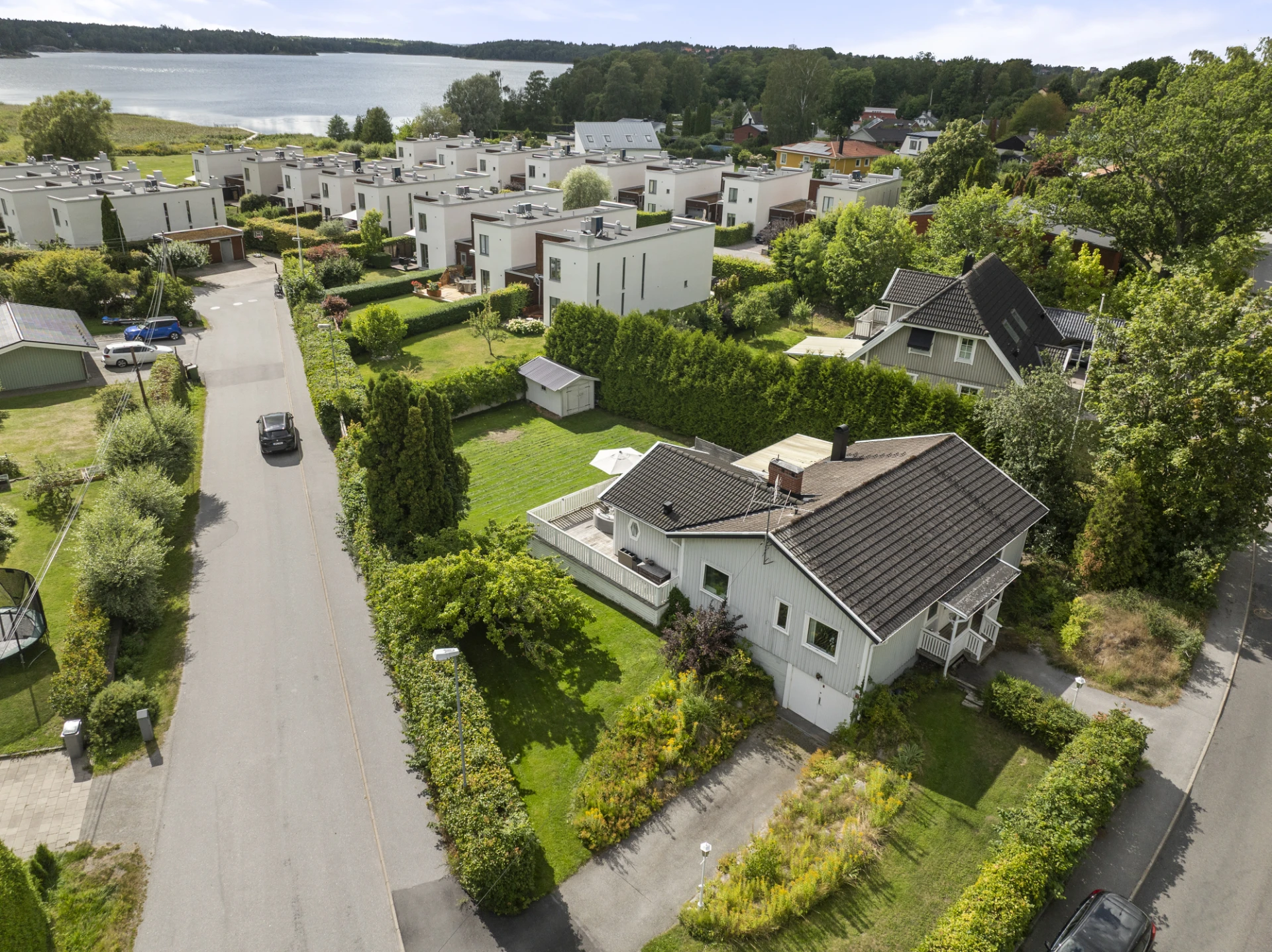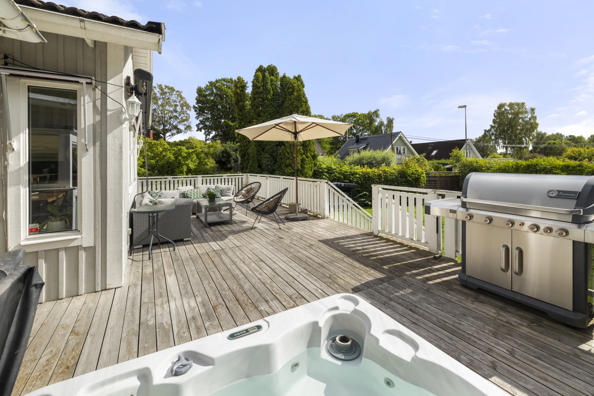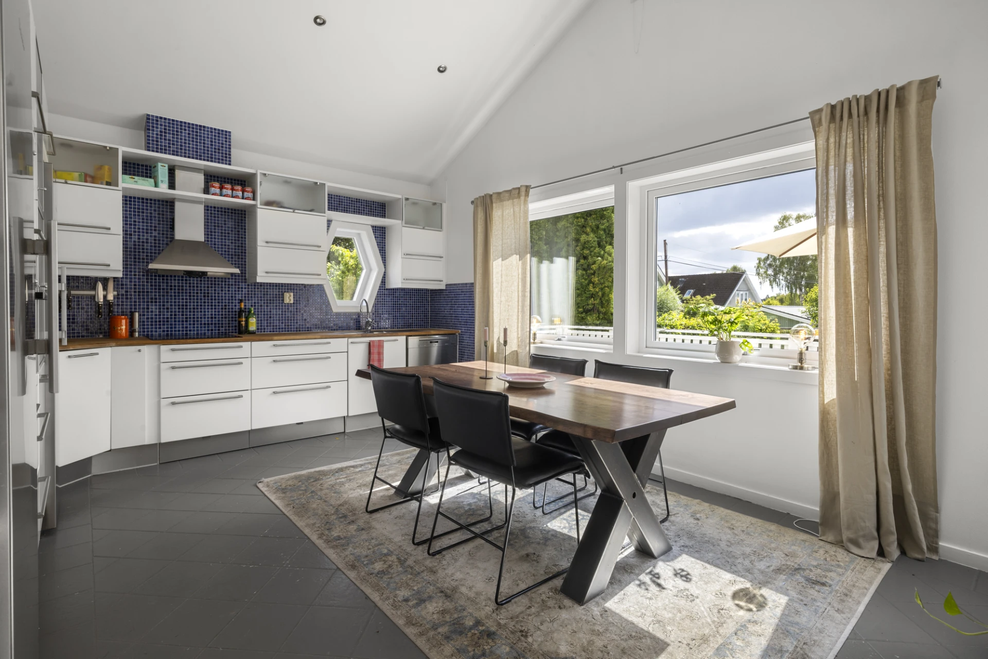 Köket har högt i tak och infällda spotlights. Stora fönster vetter mot baksidan och trädäcket och släpper in rikligt med ljus. Här finns gott om plats för ett stort matbord, och arbetsytor och förvaringsmöjligheter är väl tilltagna. Vita luckor med rostfria handtag, träbänk och blå mosaik som stänkskydd skapar en stilren känsla. Köket är utrustat med rostfria vitvaror: diskmaskin, fläkt, induktionshäll, kyl och frys samt ugn i arbetshöjd. Vitmålade väggar och grått klinkergolv med vattenburen golvvärme fullbordar köket.