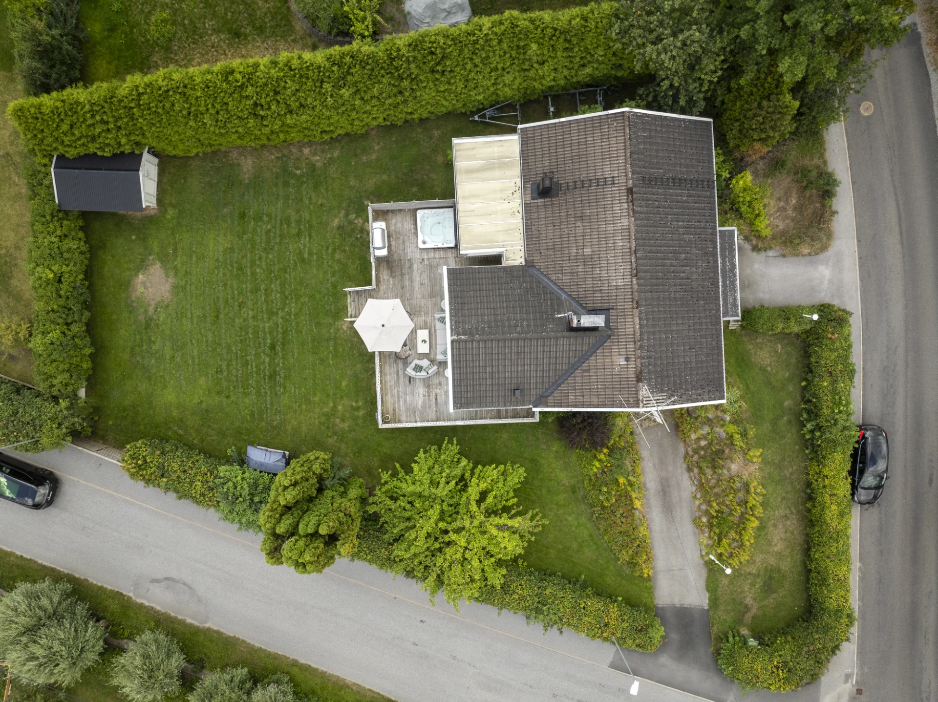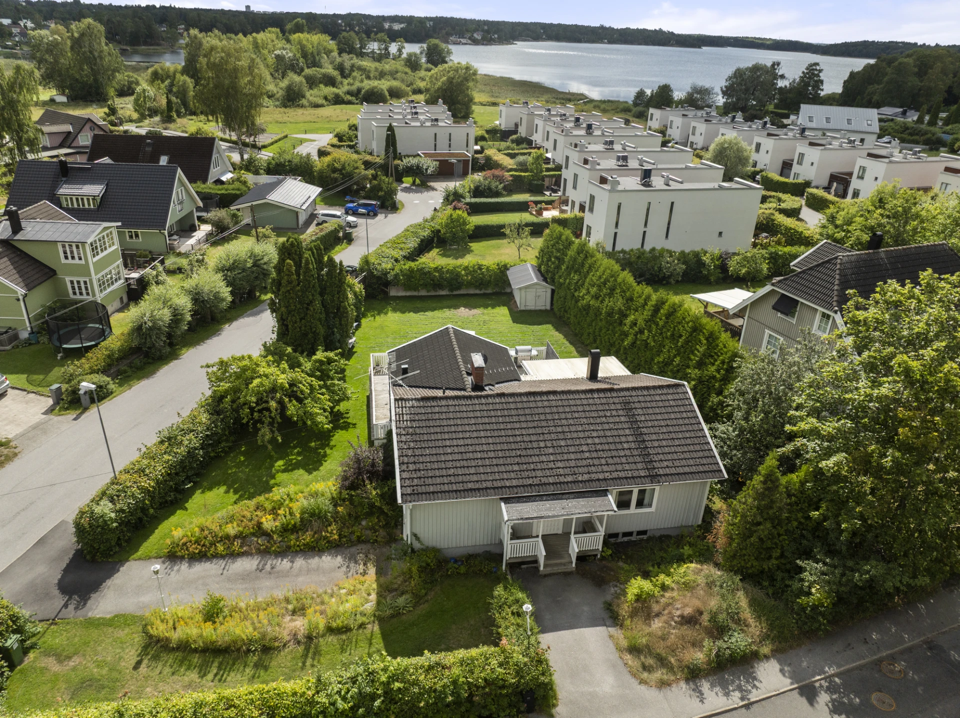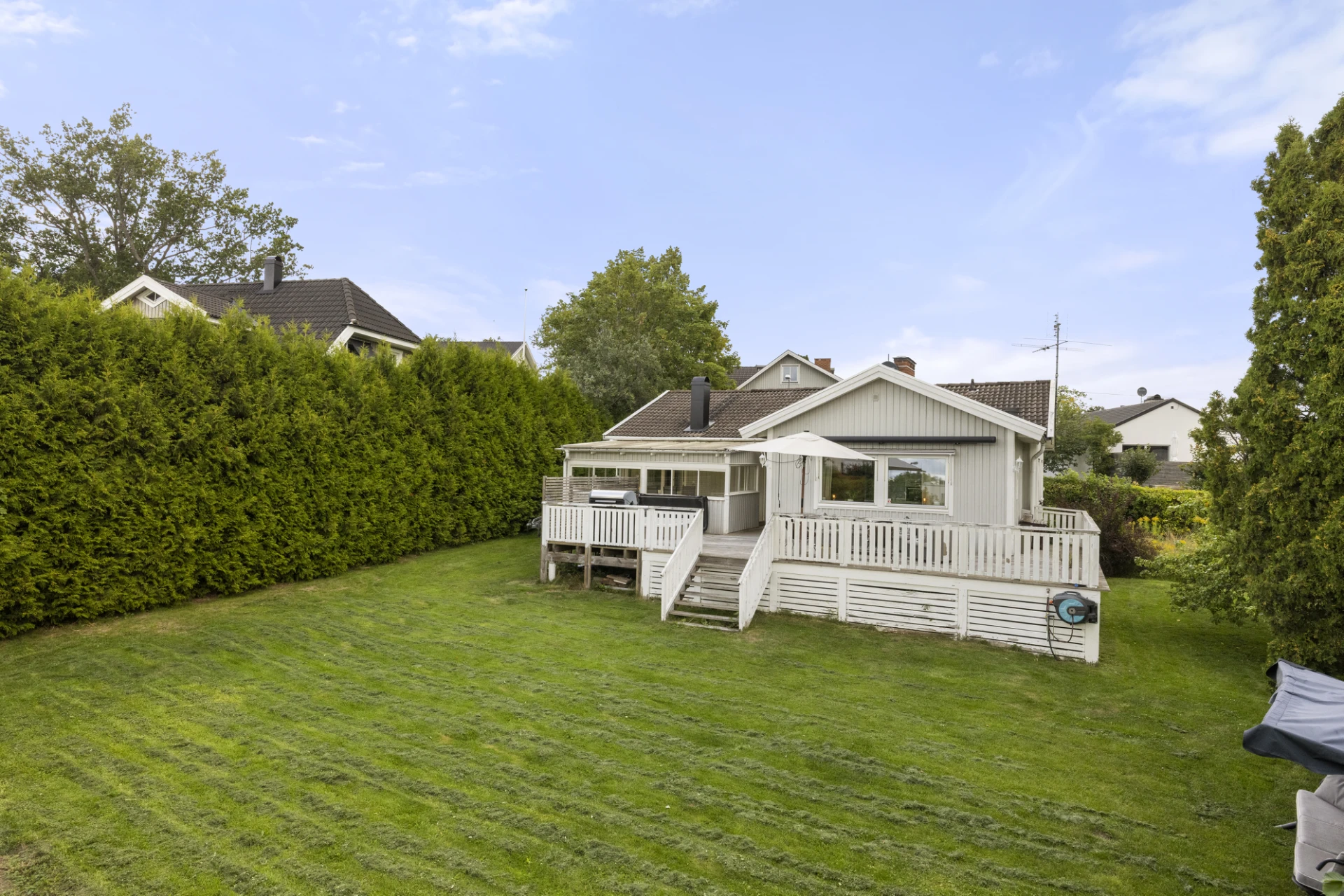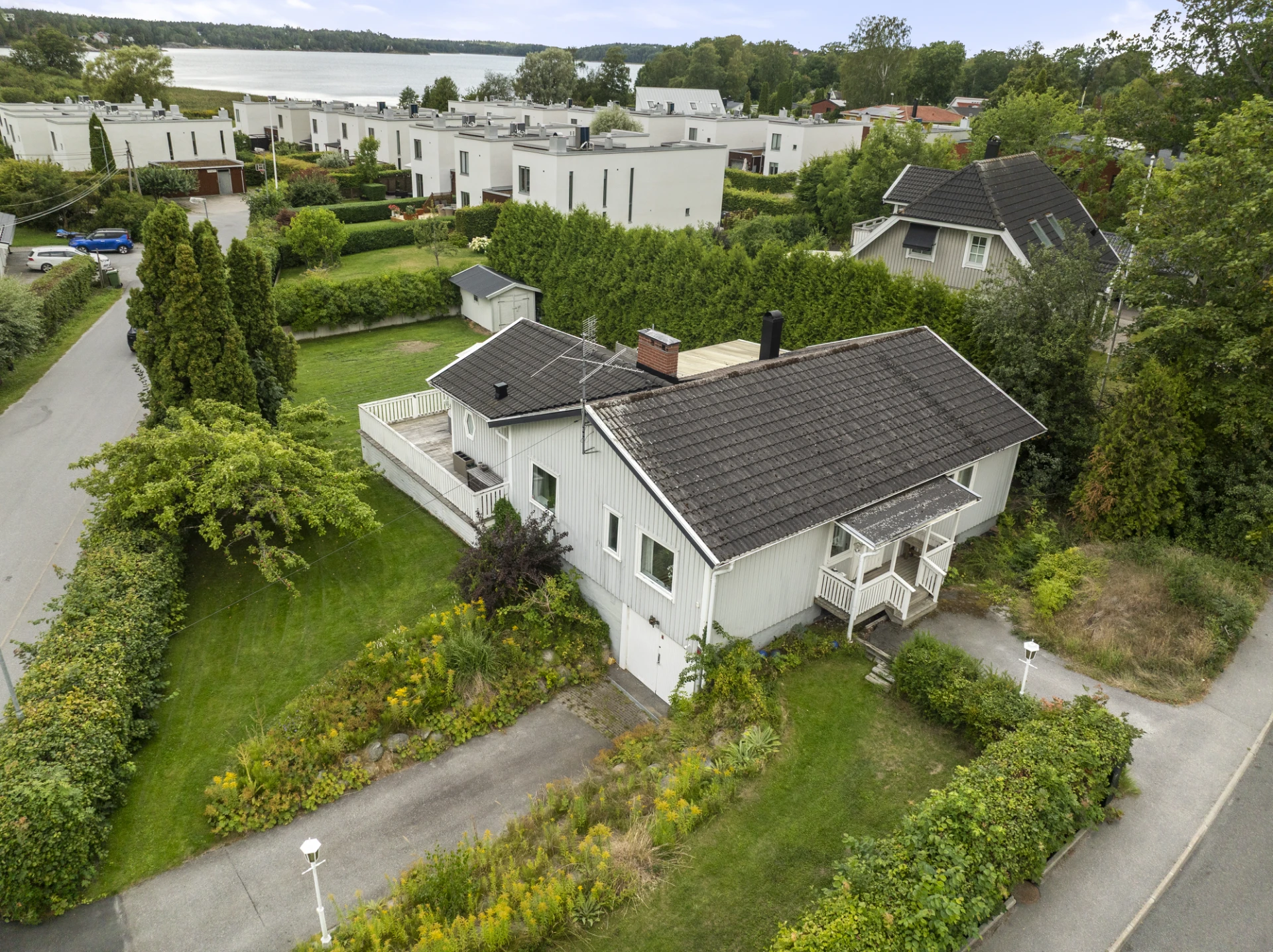 Köket har högt i tak och infällda spotlights. Stora fönster vetter mot baksidan och trädäcket och släpper in rikligt med ljus. Här finns gott om plats för ett stort matbord, och arbetsytor och förvaringsmöjligheter är väl tilltagna. Vita luckor med rostfria handtag, träbänk och blå mosaik som stänkskydd skapar en stilren känsla. Köket är utrustat med rostfria vitvaror: diskmaskin, fläkt, induktionshäll, kyl och frys samt ugn i arbetshöjd. Vitmålade väggar och grått klinkergolv med vattenburen golvvärme fullbordar köket.