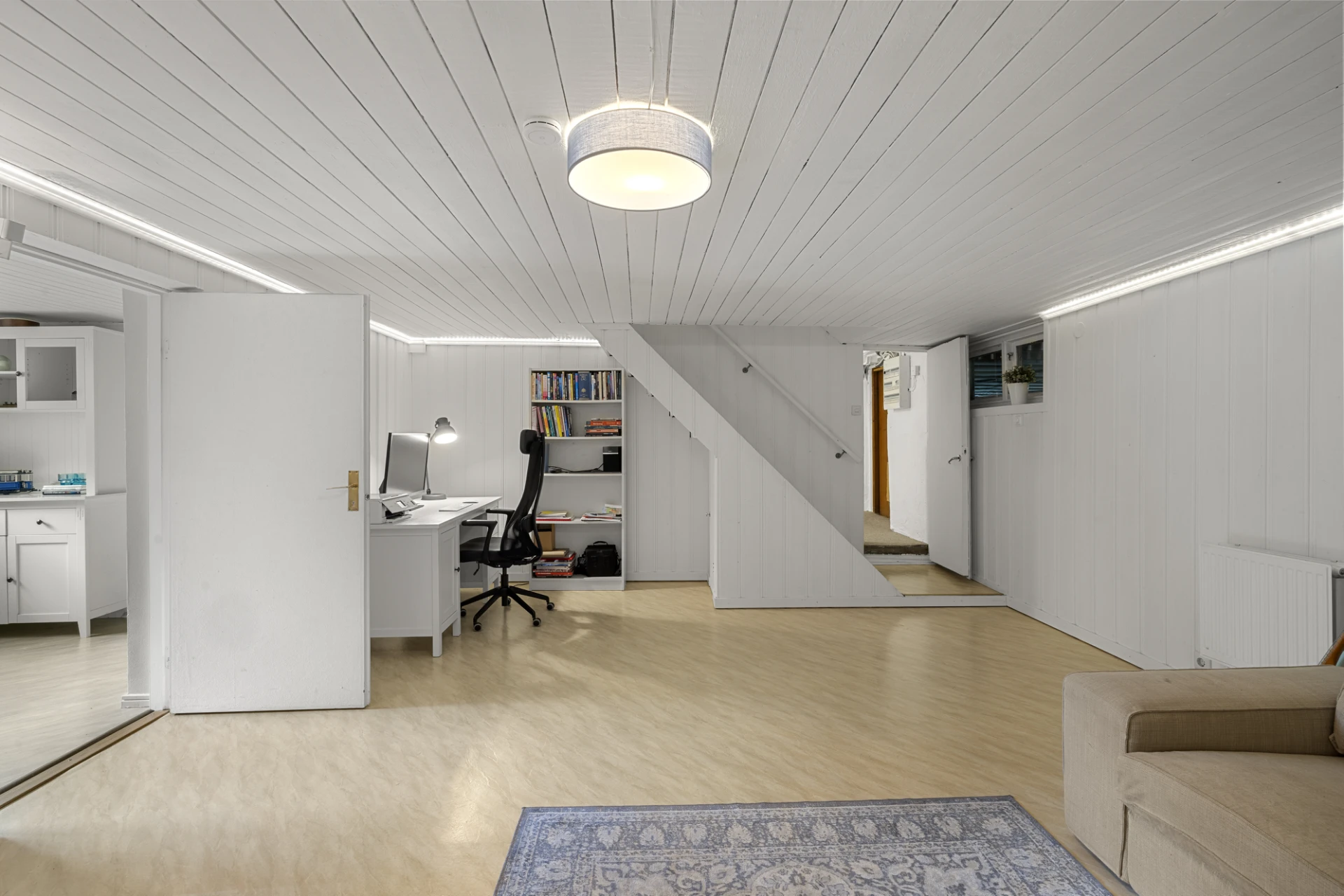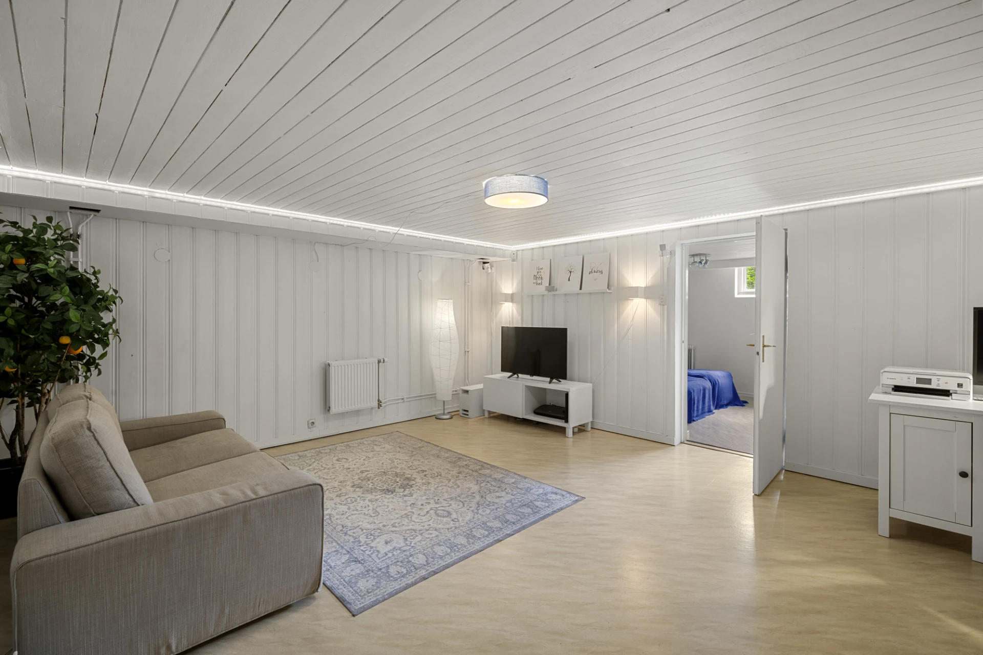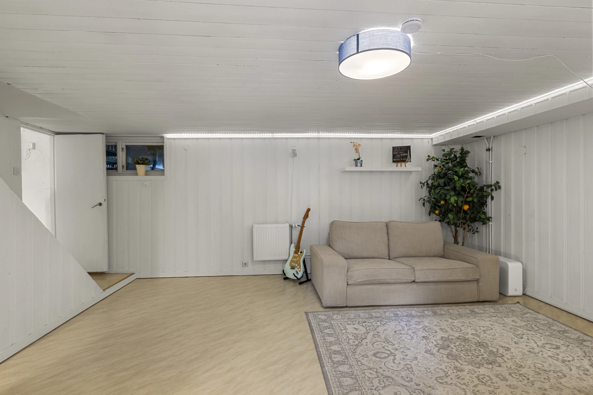 Allrummet i källarvåningen erbjuder gott om plats för både myshörna med soffa och TV samt en arbetsplats. Två källarfönster släpper in dagsljus. Väggar och tak är klädda med vit träpanel och golvet är belagt med ljus plastmatta.