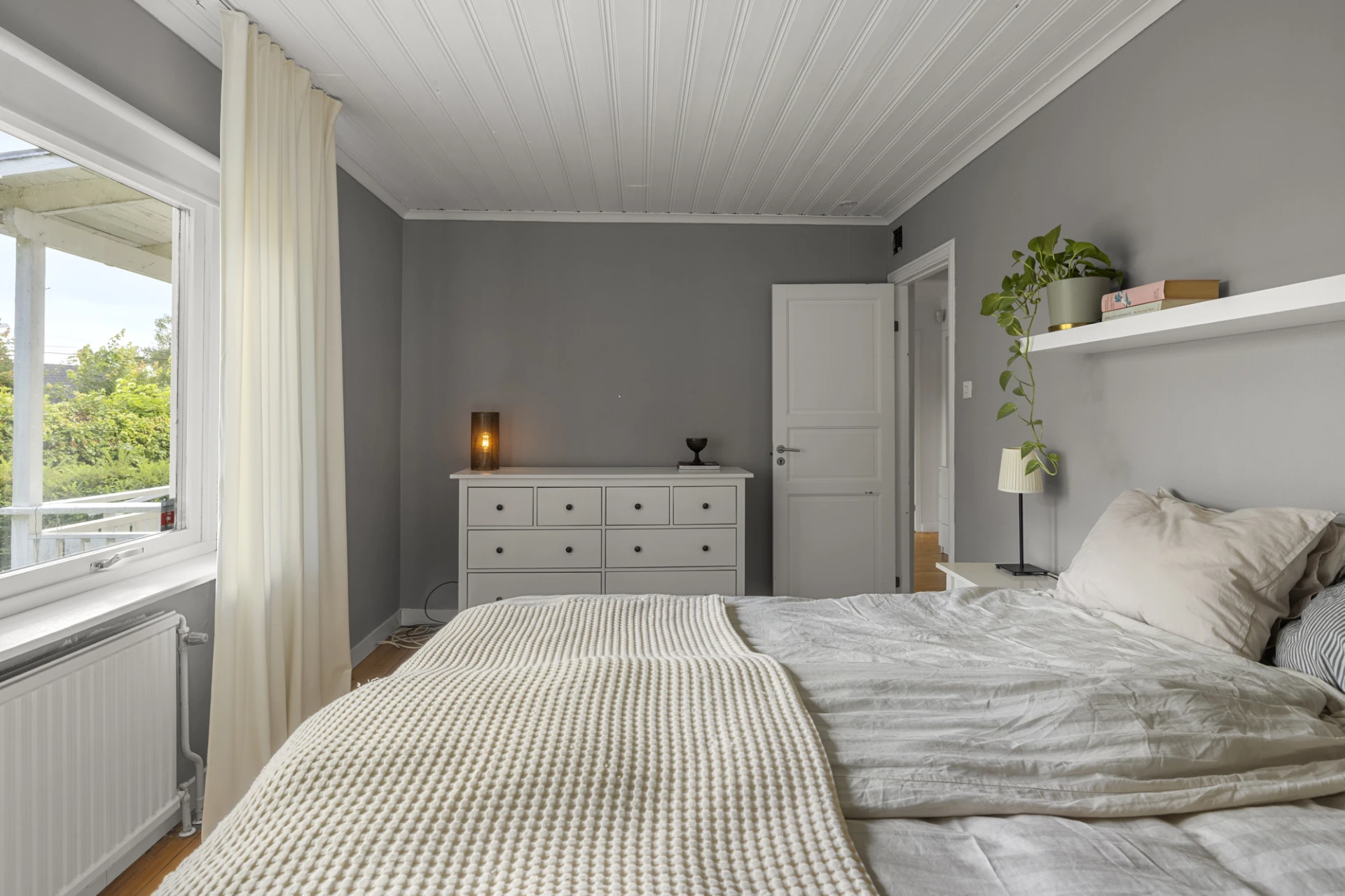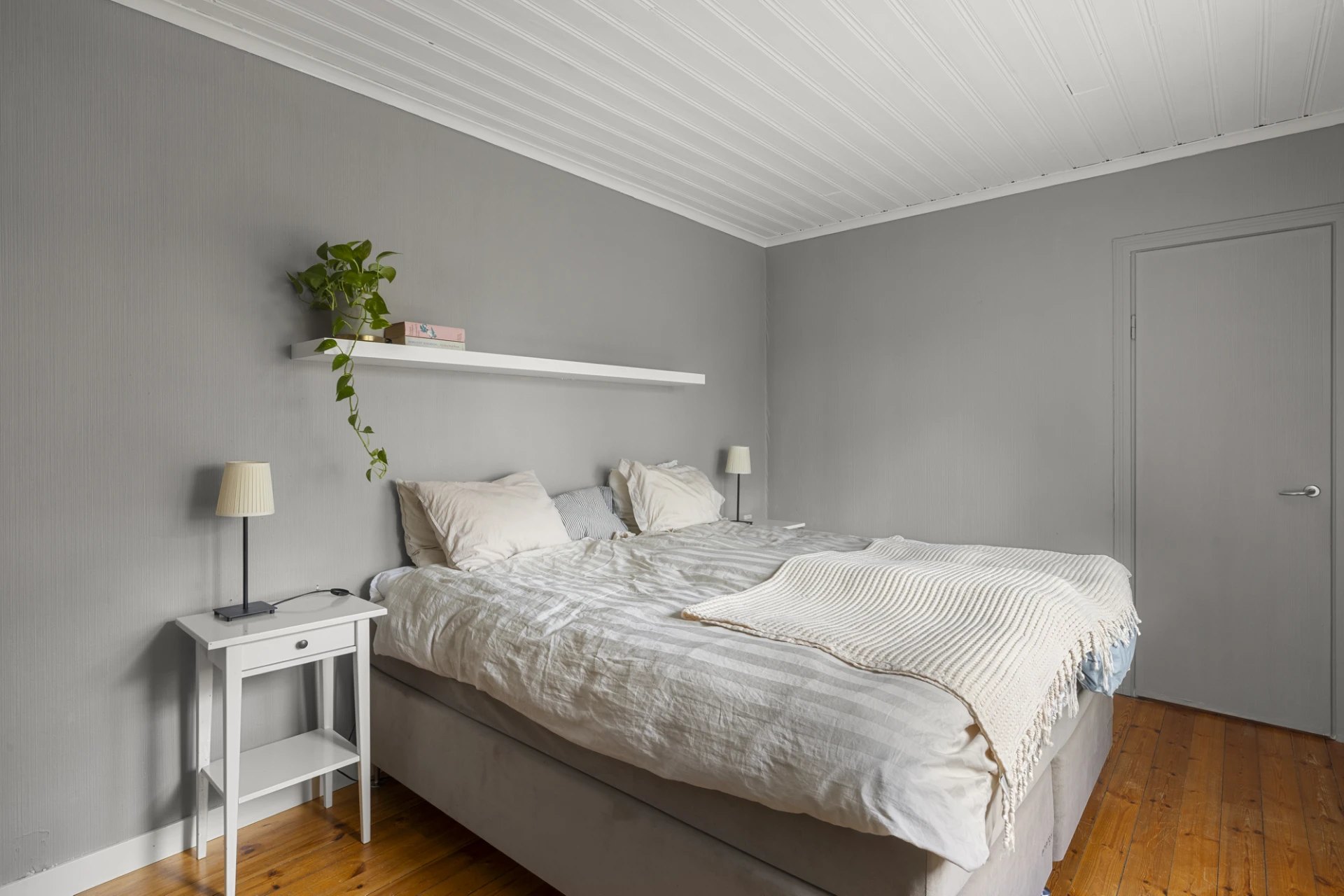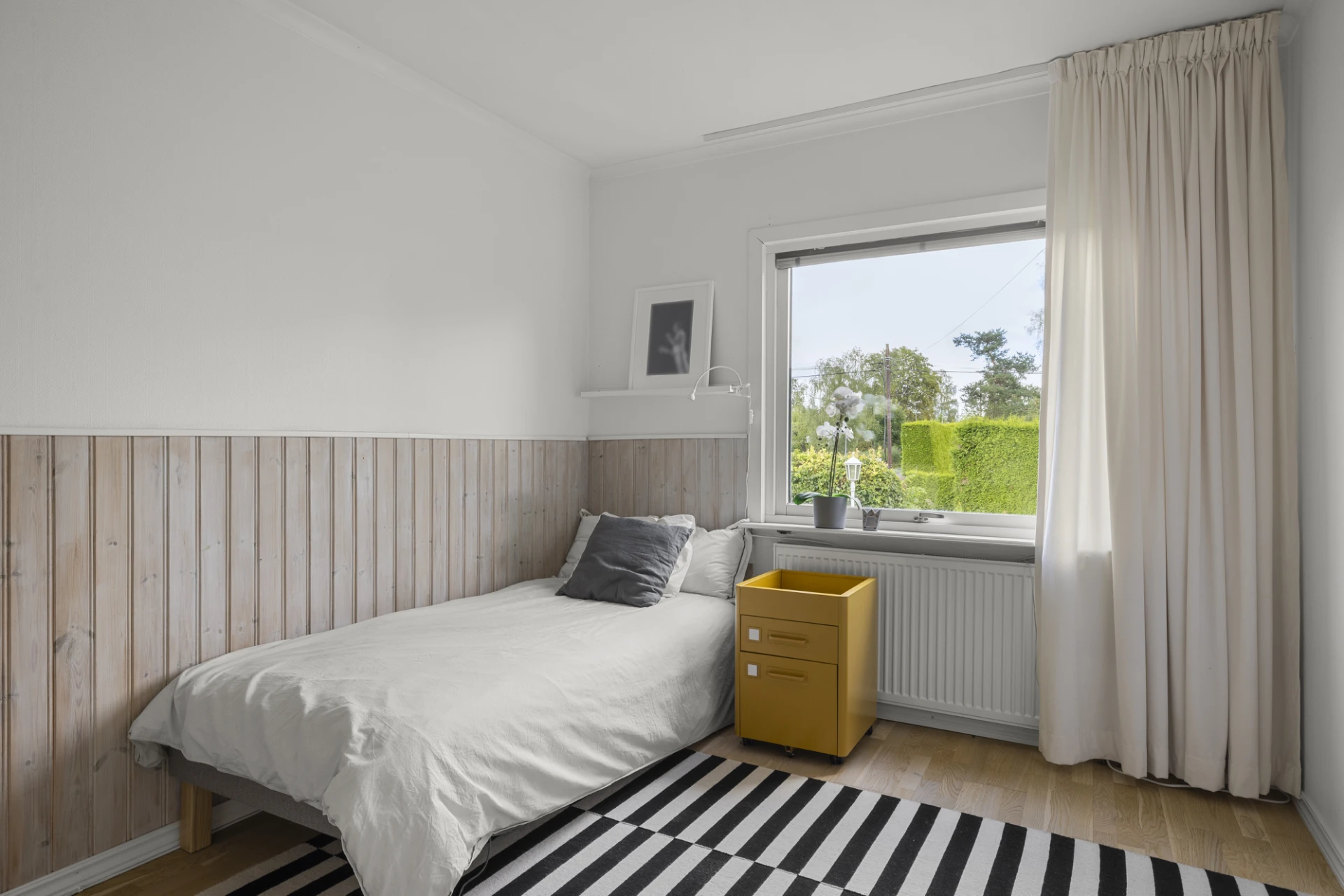 Detta sovrum rymmer både säng, sängbord och byrå, eller ett skrivbord om så önskas. Ljust parkettgolv och väggar med ljus bröstpanel som sedan följs av vitmålade väggar.