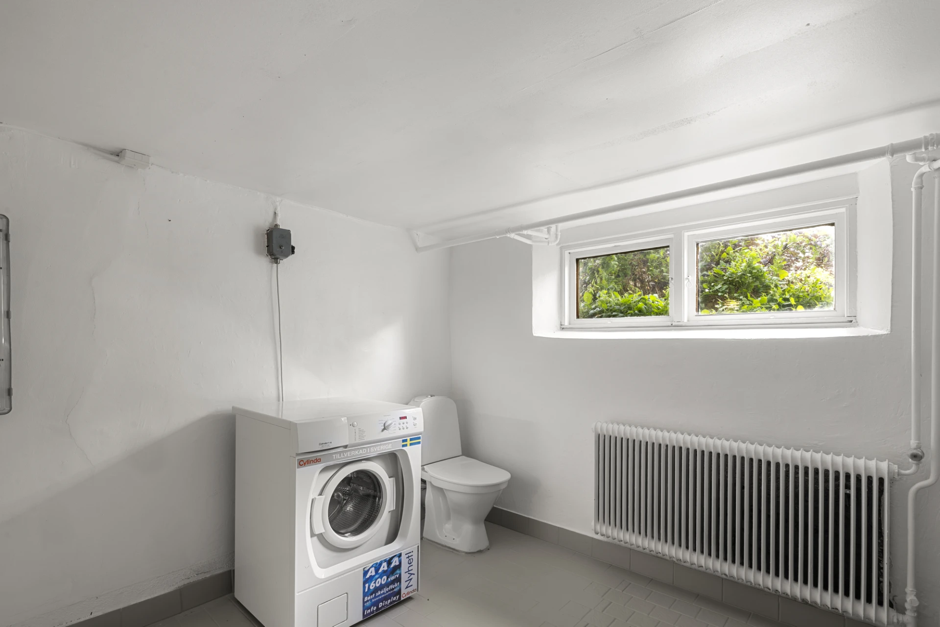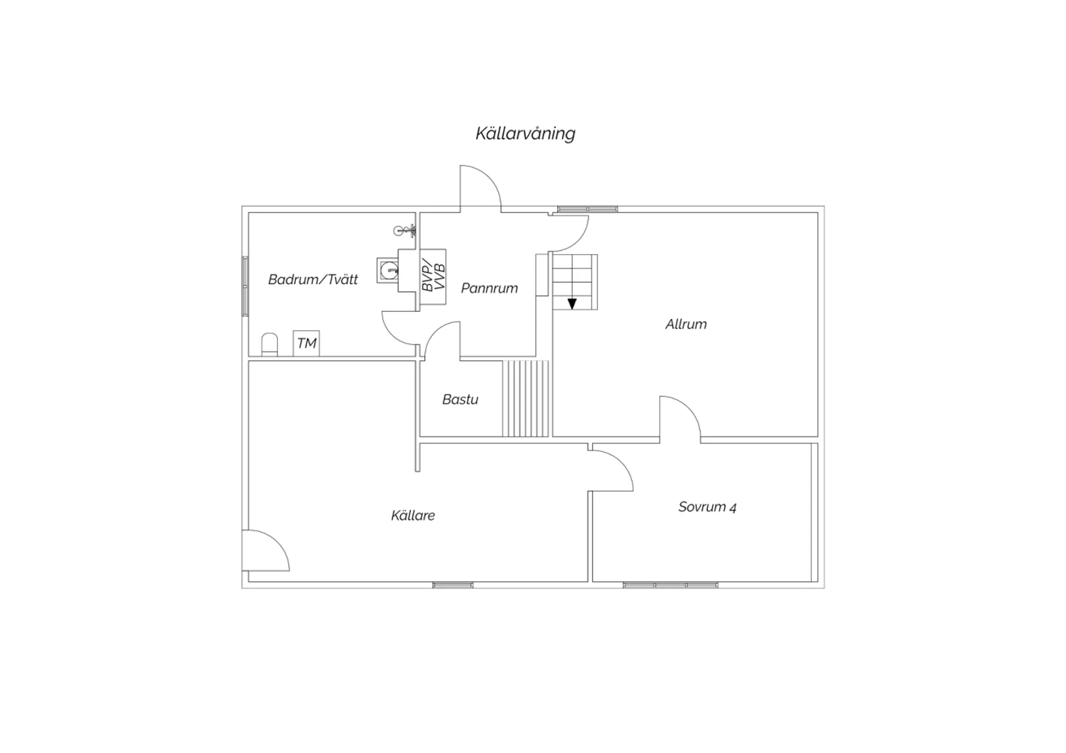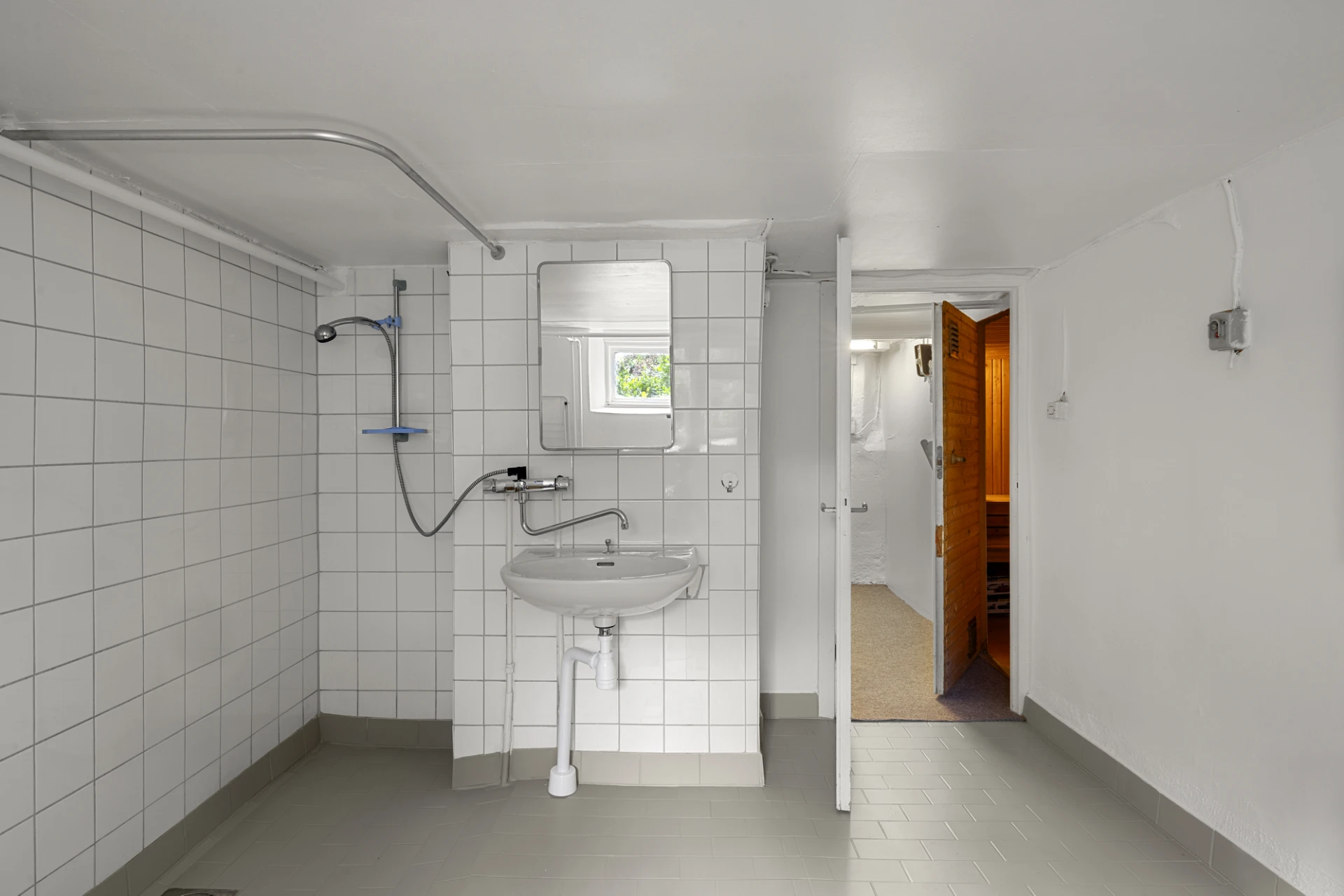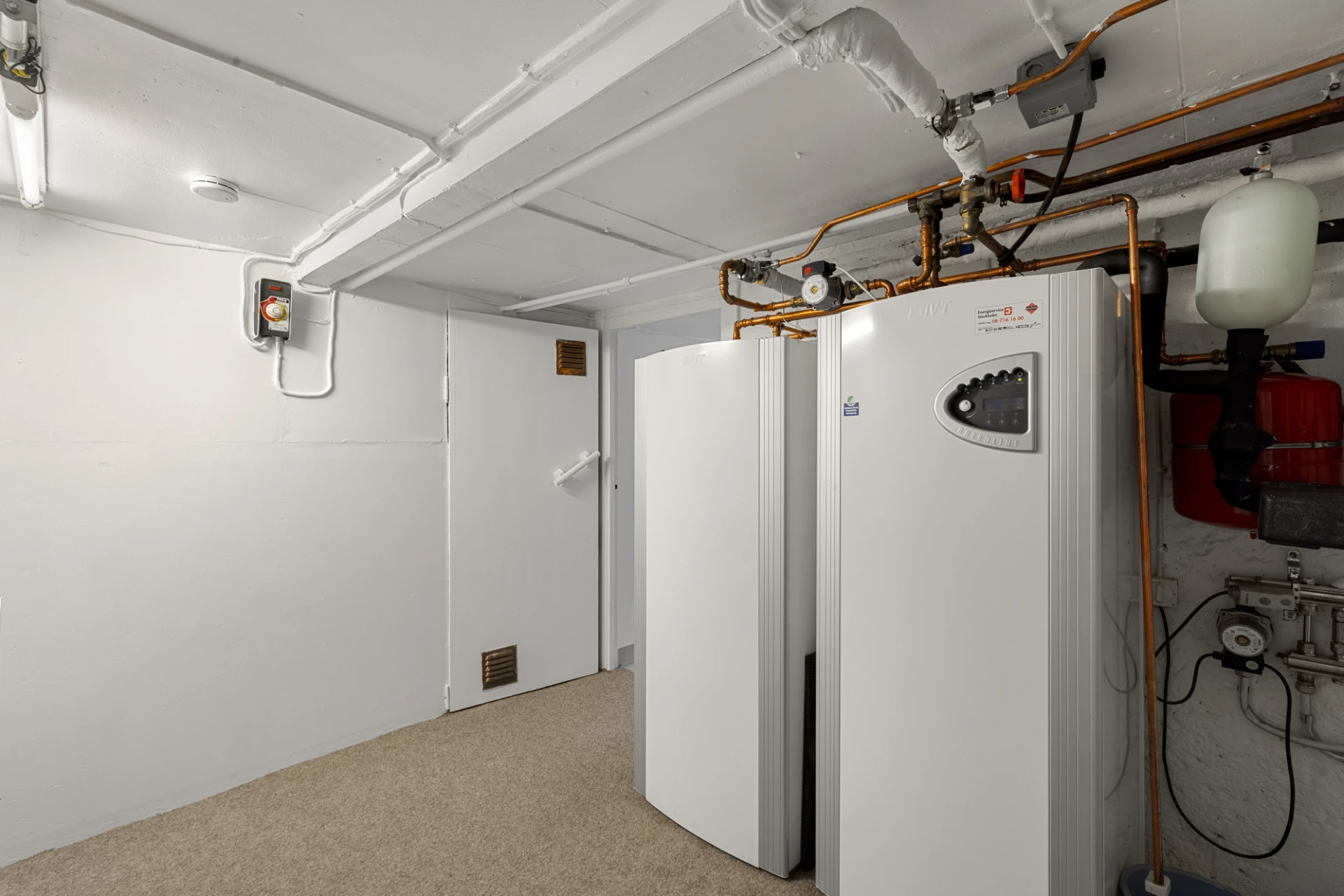 Intill tidigare rum finns ett pannrum med intilliggande bastu. I pannrummet finns bergvärmepumpen samt varmvattenberedaren placerad.
