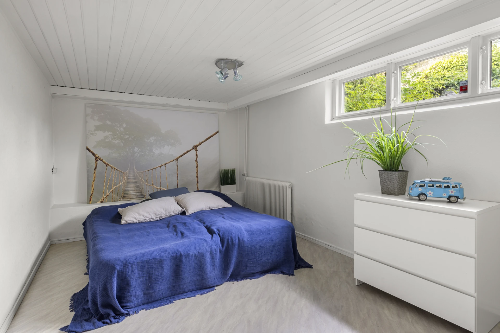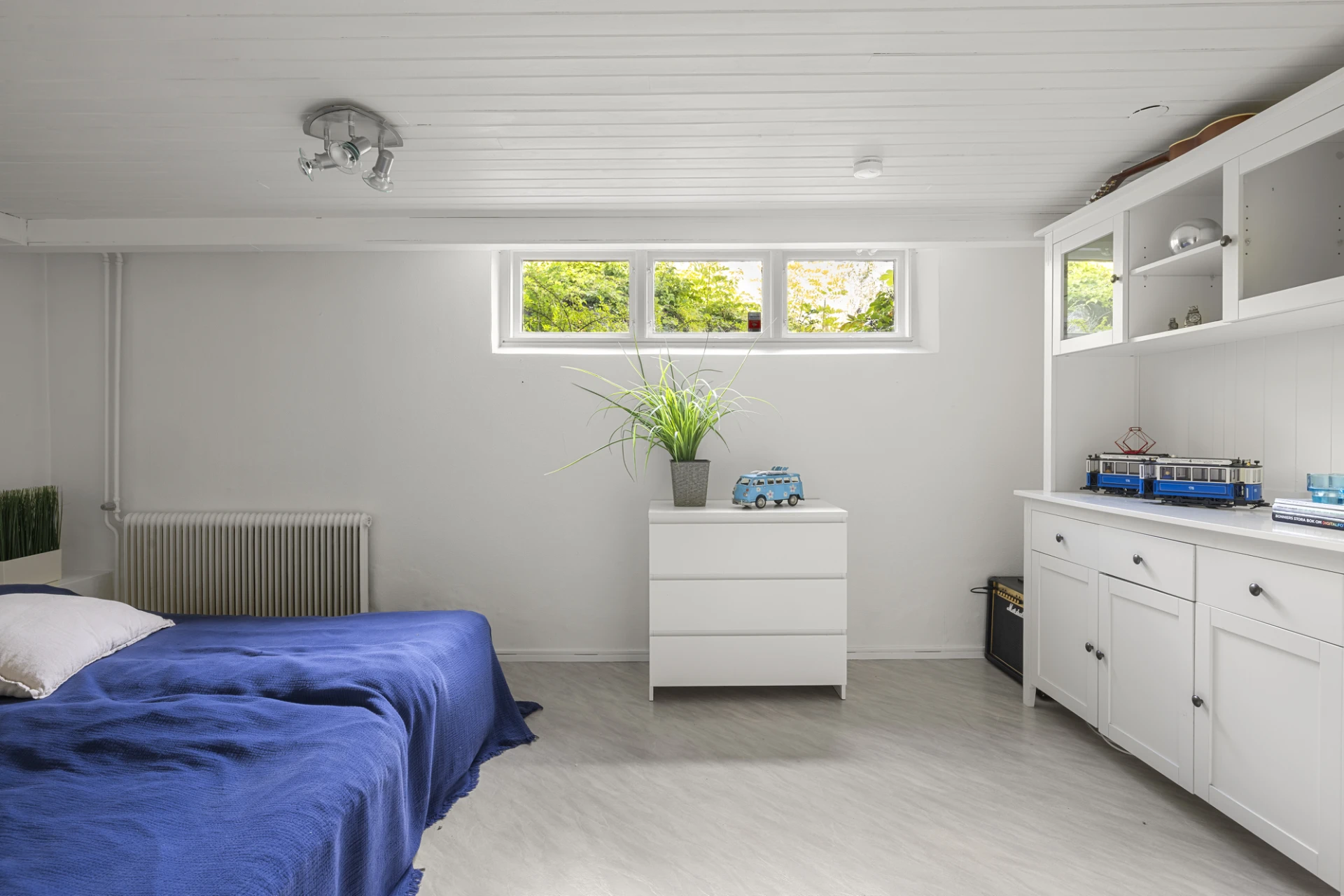 Sovrummet i källarplanet är väl tilltaget med gott om plats för önskat möblemang. Tre källarfönster släpper in ljus. Vitmålade väggar och ljus plastmatta på golvet samt vitmålad träpanel i taket.