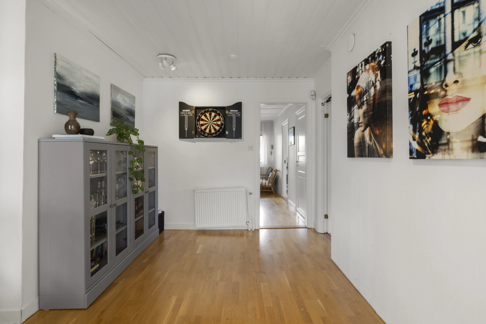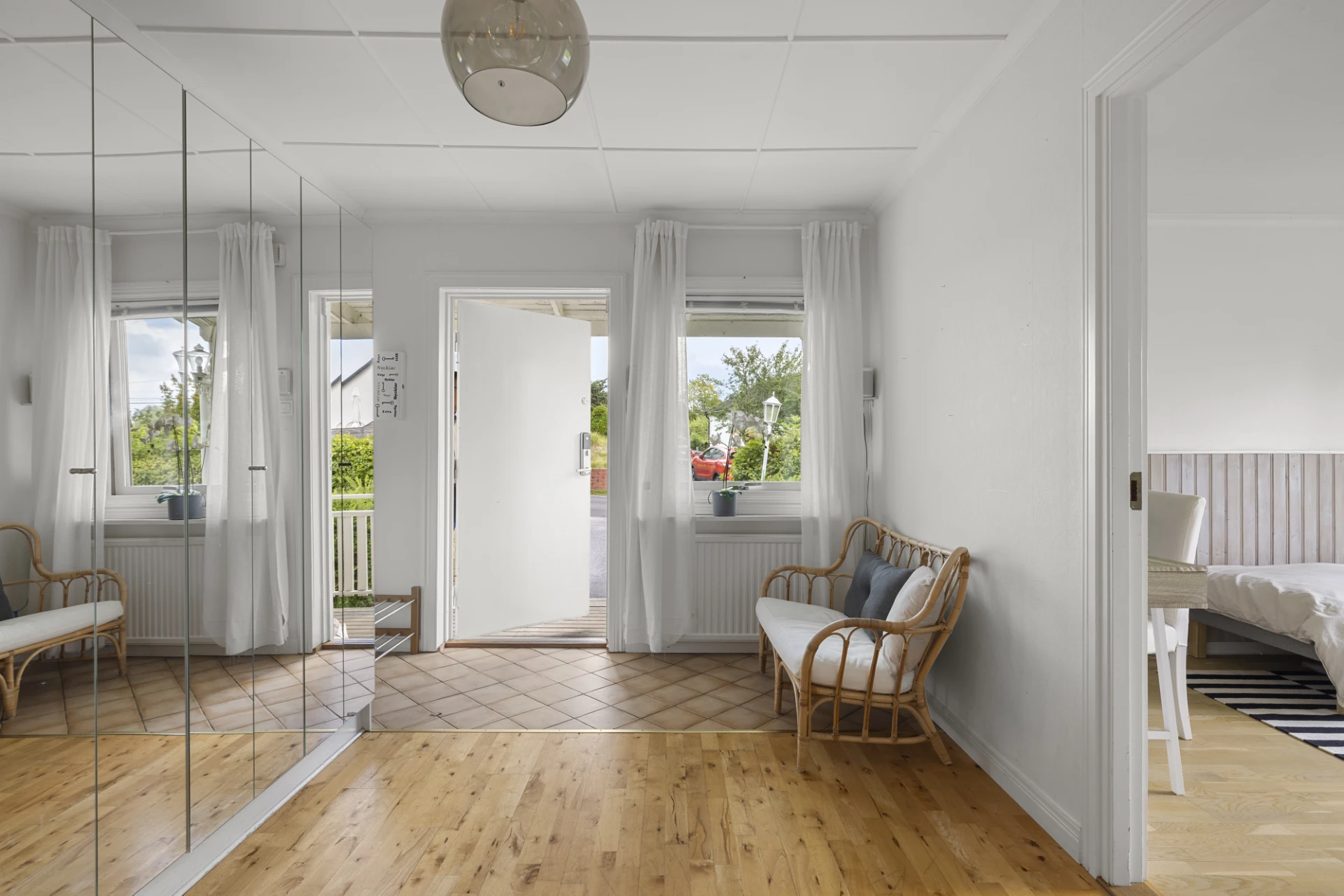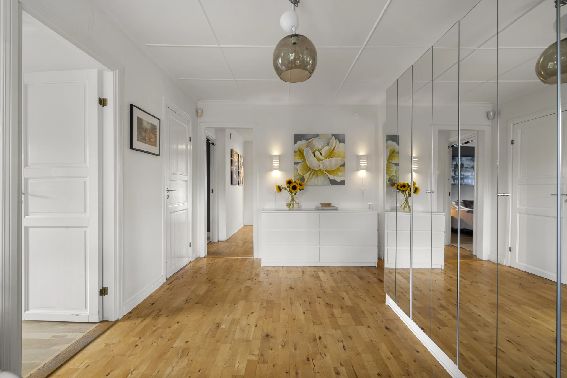 Rymlig entréhall med gott om förvaring i garderober med spegelglas. I entrén ligger ett klinkergolv och vidare följer ett parkettgolv, väggarna är vitmålade.