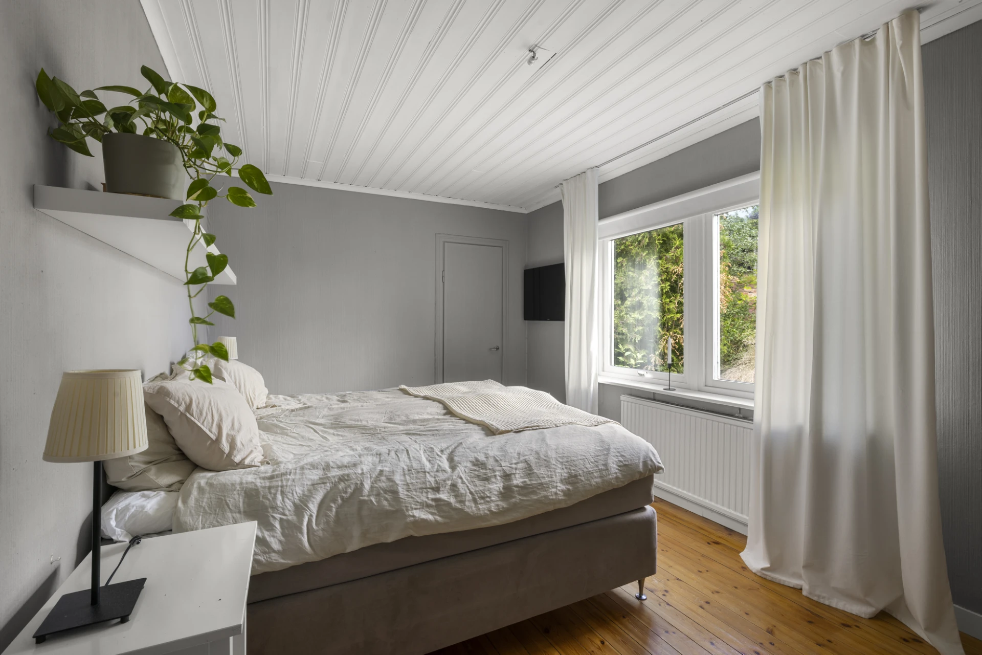 Stort sovrum med plats för dubbelsäng med tillhörande sängbord samt annat önskat möblemang. Äldre trägolv och gråmålade väggar samt vit träpanel i taket. Ingång till separat klädkammare med bra förvaringsmöjligheter. Detta sovrum skulle kunna delas av för att skapa ytterligare ett sovrum på detta plan om behovet finns. Tidigare har det funnits en dörr mellan klädkammare och vardagsrum.
