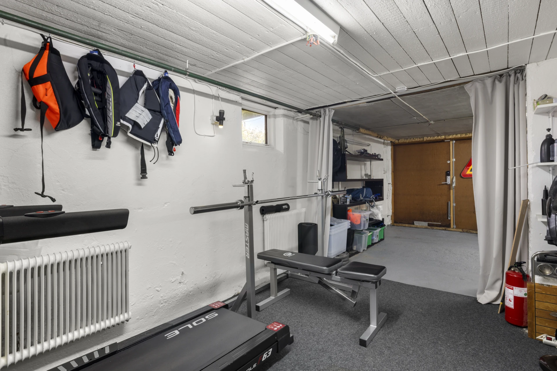 Utrymmet kan användas som garage, men används idag mest som förråd och förvaring. Den inre delen är inredd som gym. Golv och väggar i betong.