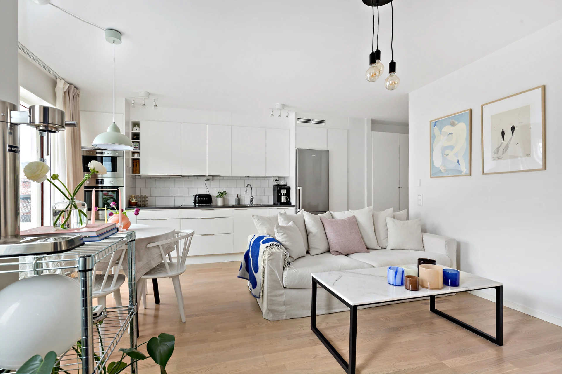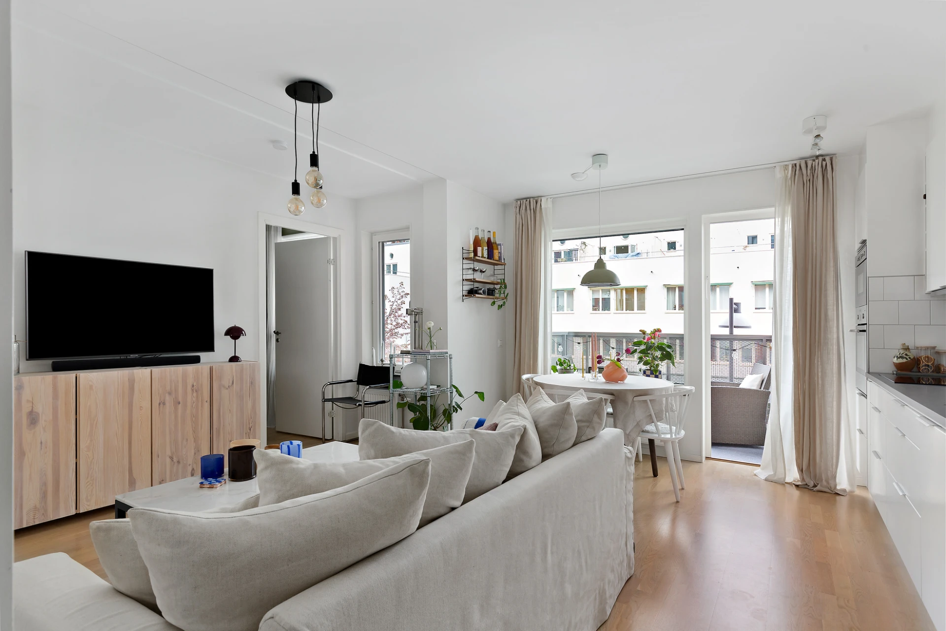 Härligt ljusinsläpp genom ett rejält fönsterparti. Den öppna planlösningen mellan kök och vardagsrum gör lägenheten riktigt hemtrevlig och ger en ökad känsla av ljus och rymd. Gott om plats för soffa, soffbord, tv-möbel m m. Utgång till balkongen som vetter mot Wilhelm Kåges gata.