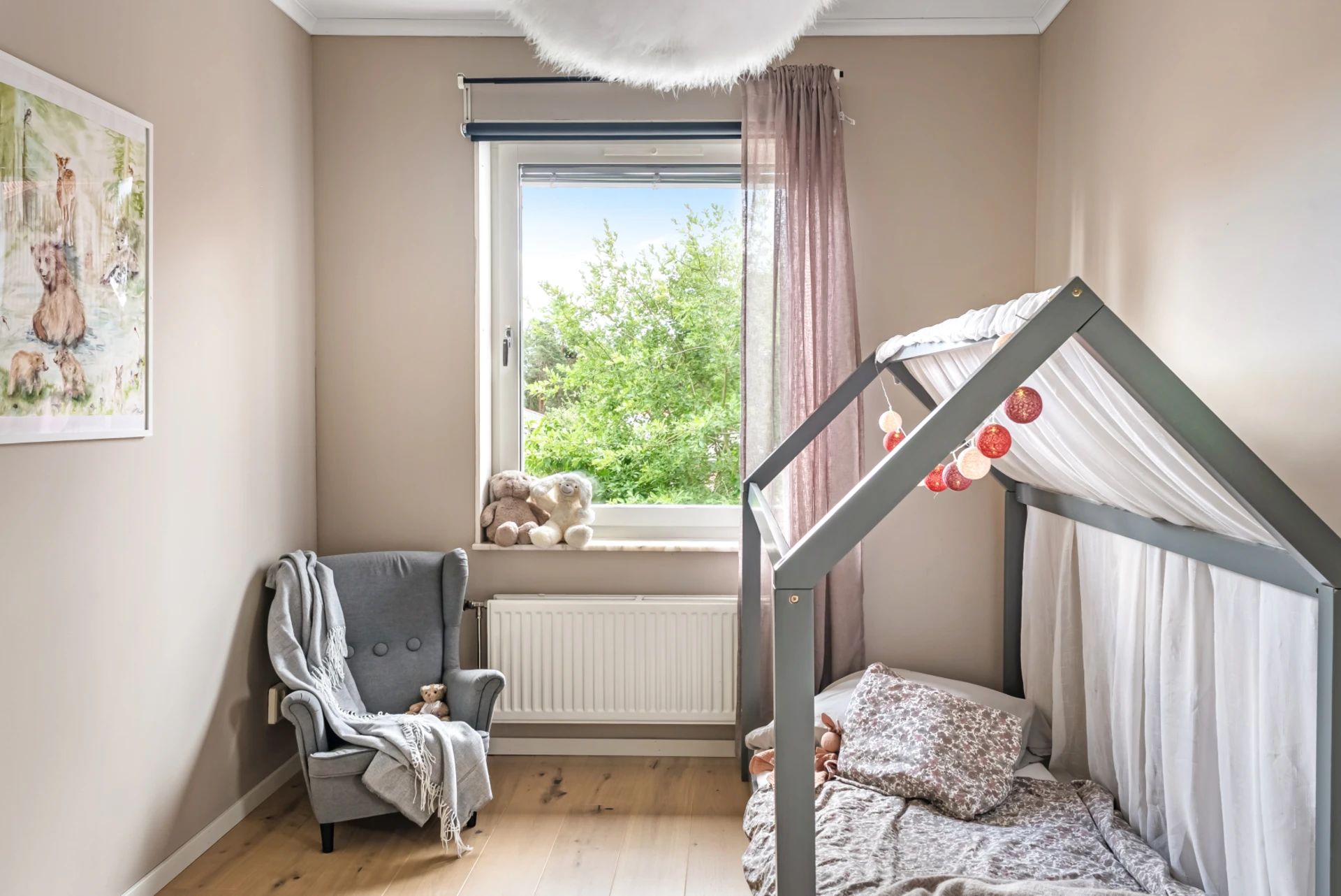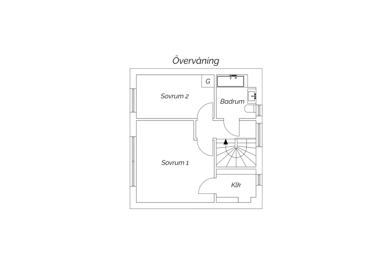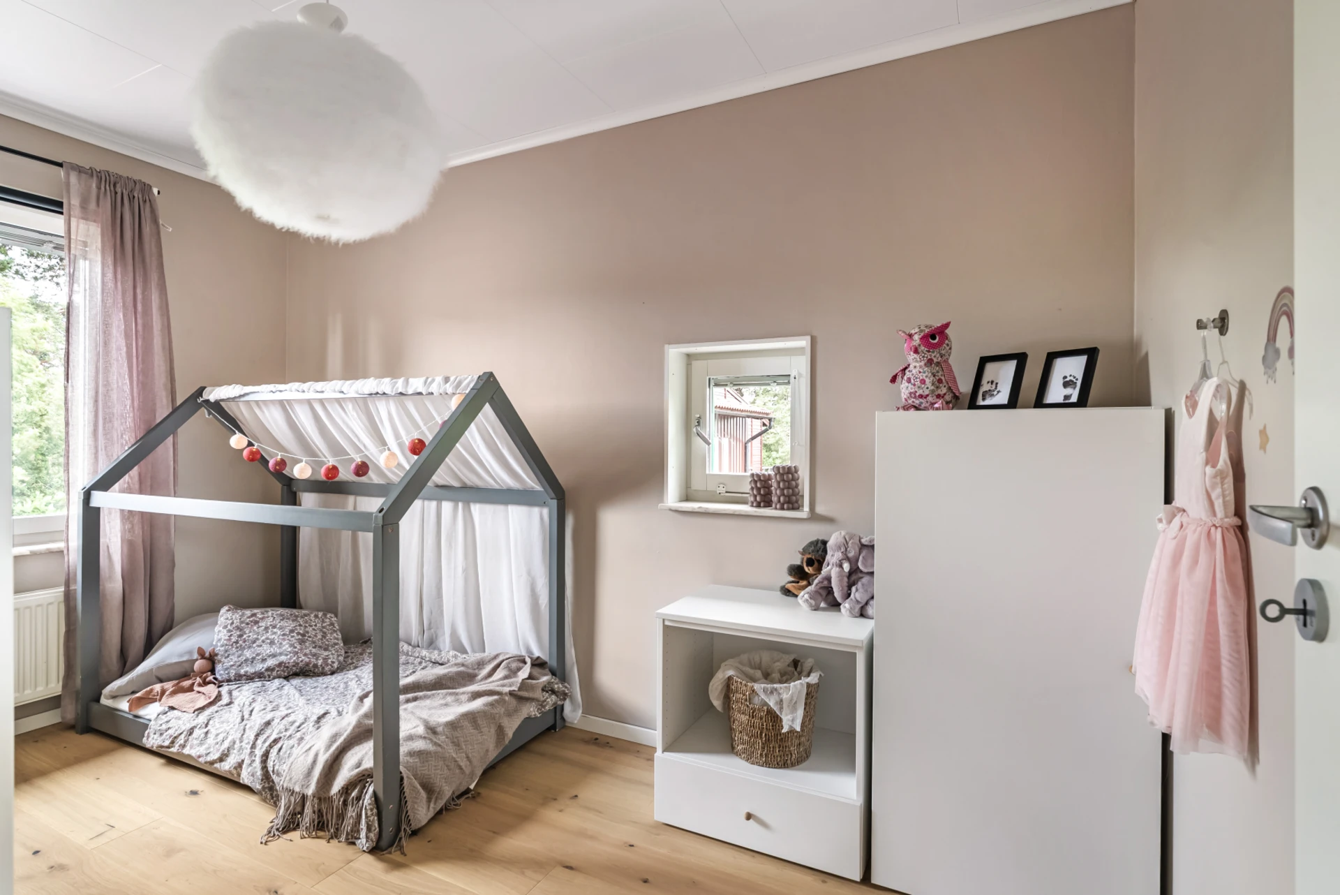 Ovanvåningen är inredd som familjens privata plan med två bra sovrum, en walk-in-closet samt ett badrum med badkar.