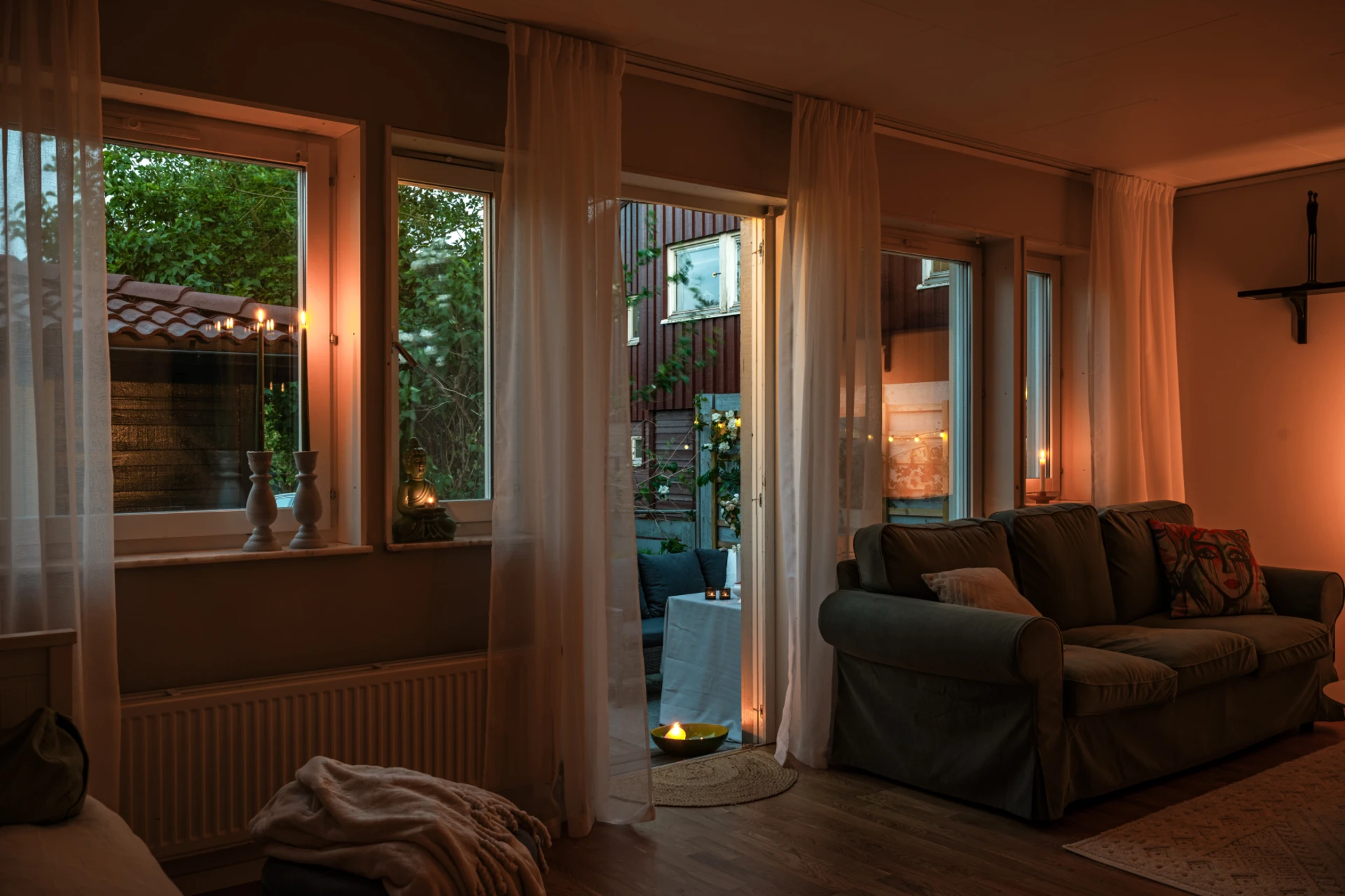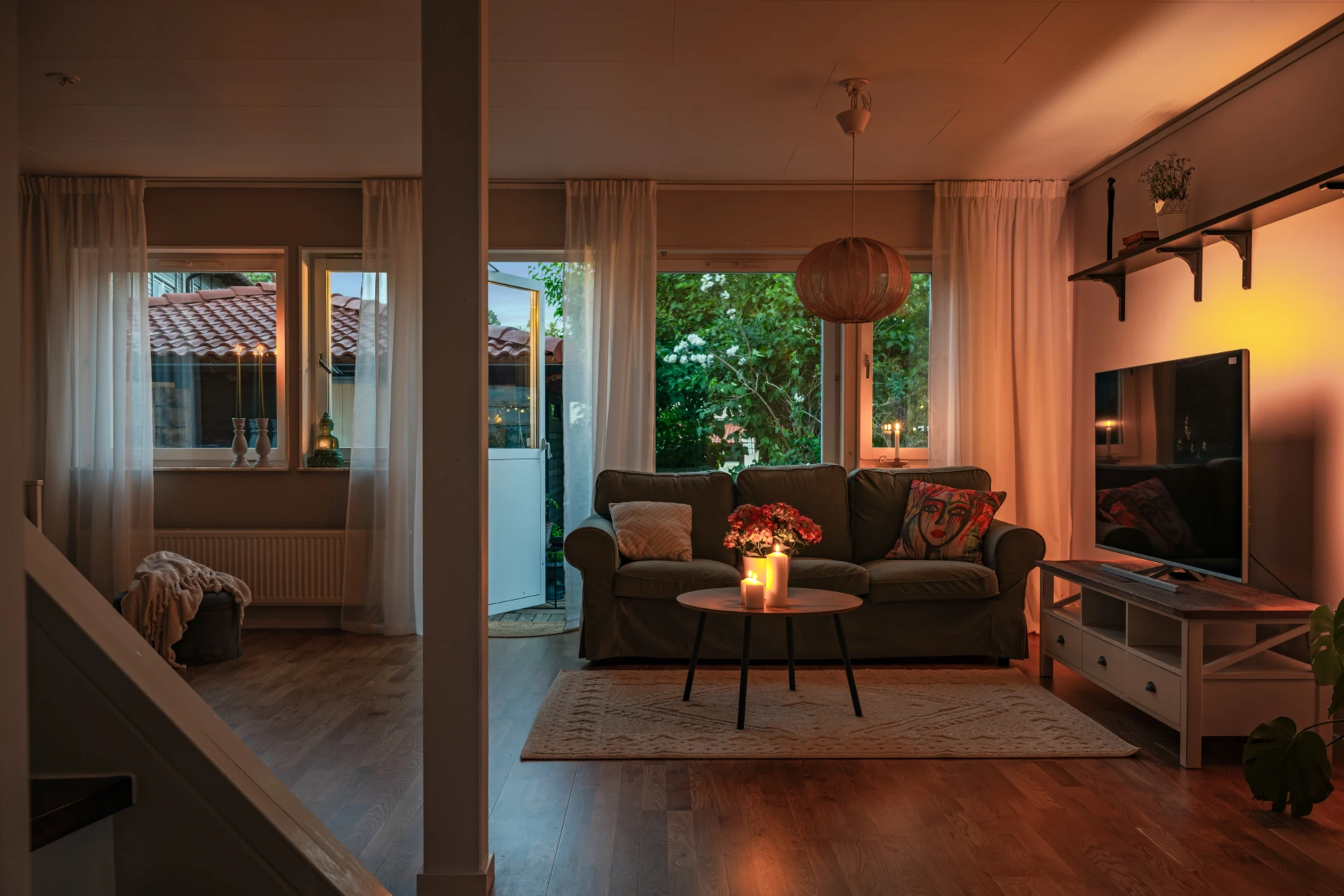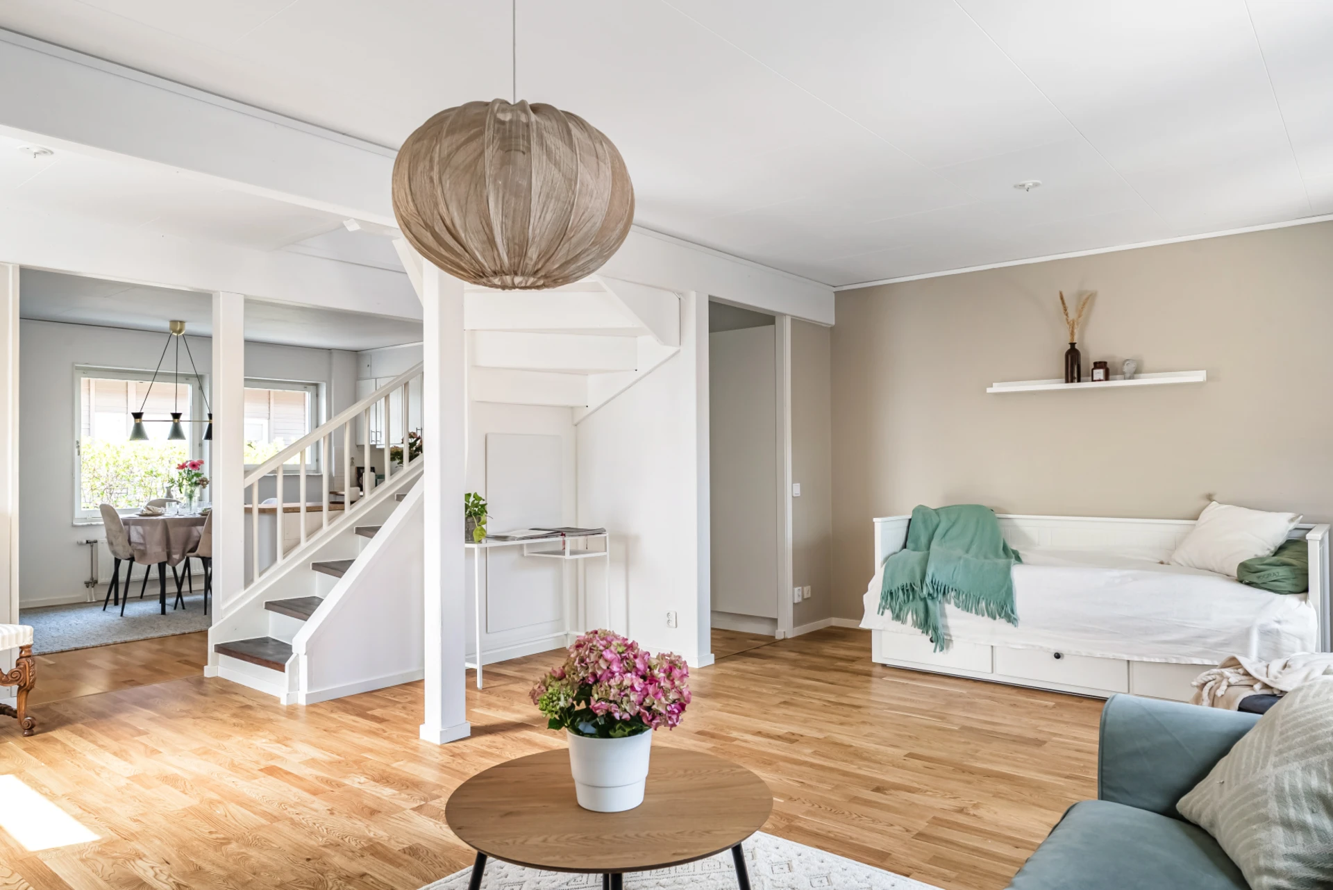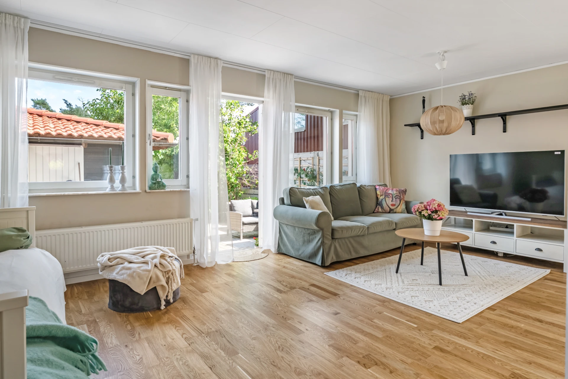 Stort och rymligt vardagsrum i öppen planklösning. Här finns gott och plats för önskat möblemang. Stora fönsterpartier med mysig utsikt och mycket ljusinsläpp. Utgång till uteplatsen på baksida där även det egna förrådet ramar in och förvaring möjlig.
