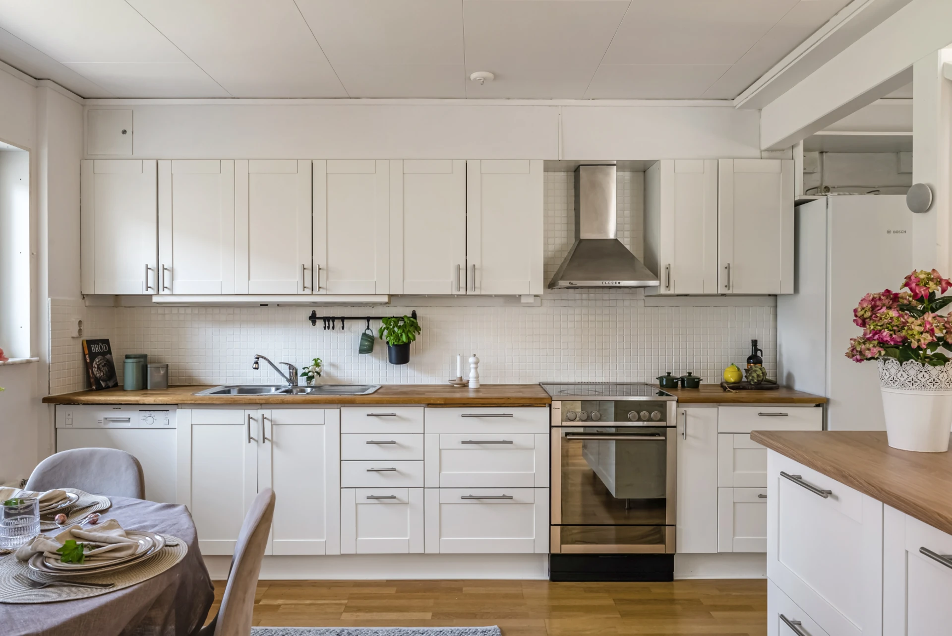 Välutrustat kök i sobra färger. Bra arbetsbänk, kakel och generöst med skåp och lådor. Utrustat med spis, ugn, fläkt, diskmaskin samt rostfri kyl och frys med vatten- och ismaskin. Välplanerad köksö (flyttbar) med förvaring och avlastningsyta. Plats för matbord intill fönsterparti.