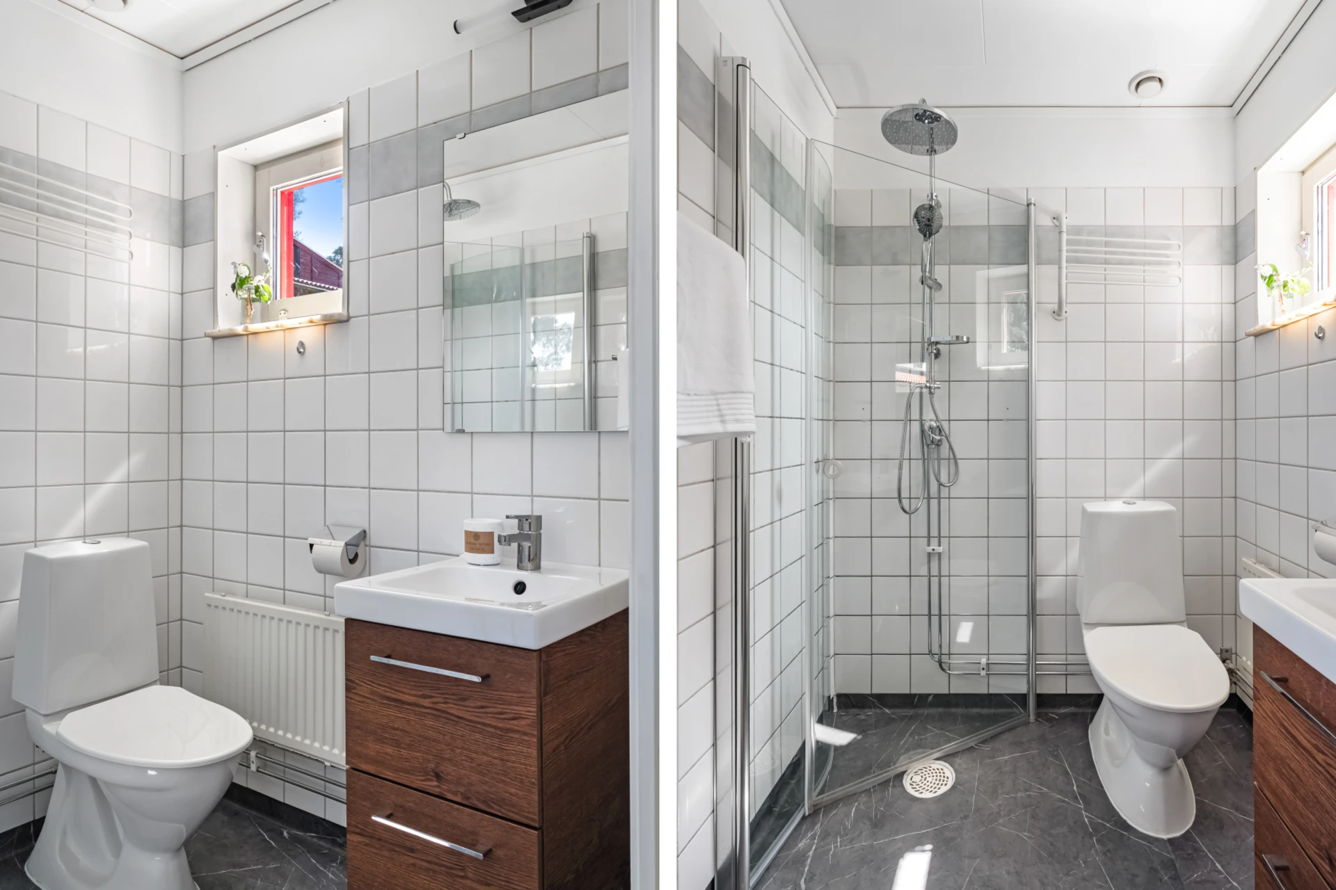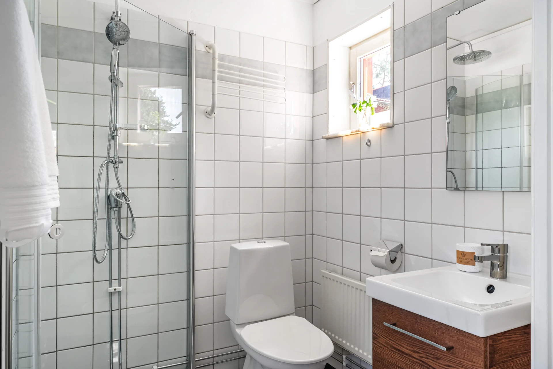 Badrum i ljusa färger. Inrett med wc, dusch och handfat. Fönster för vädring och ljusinsläpp.