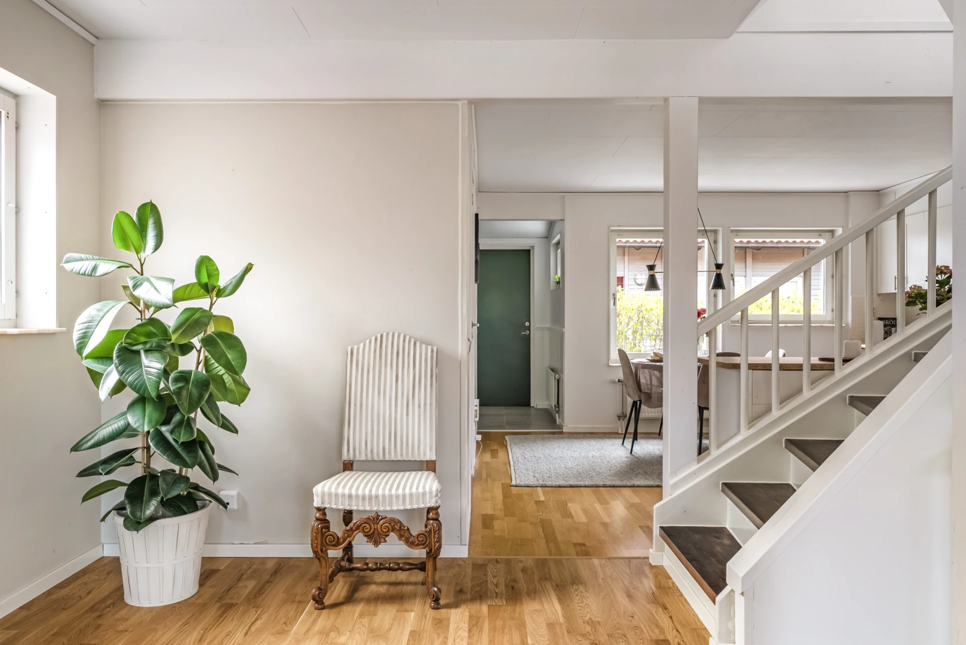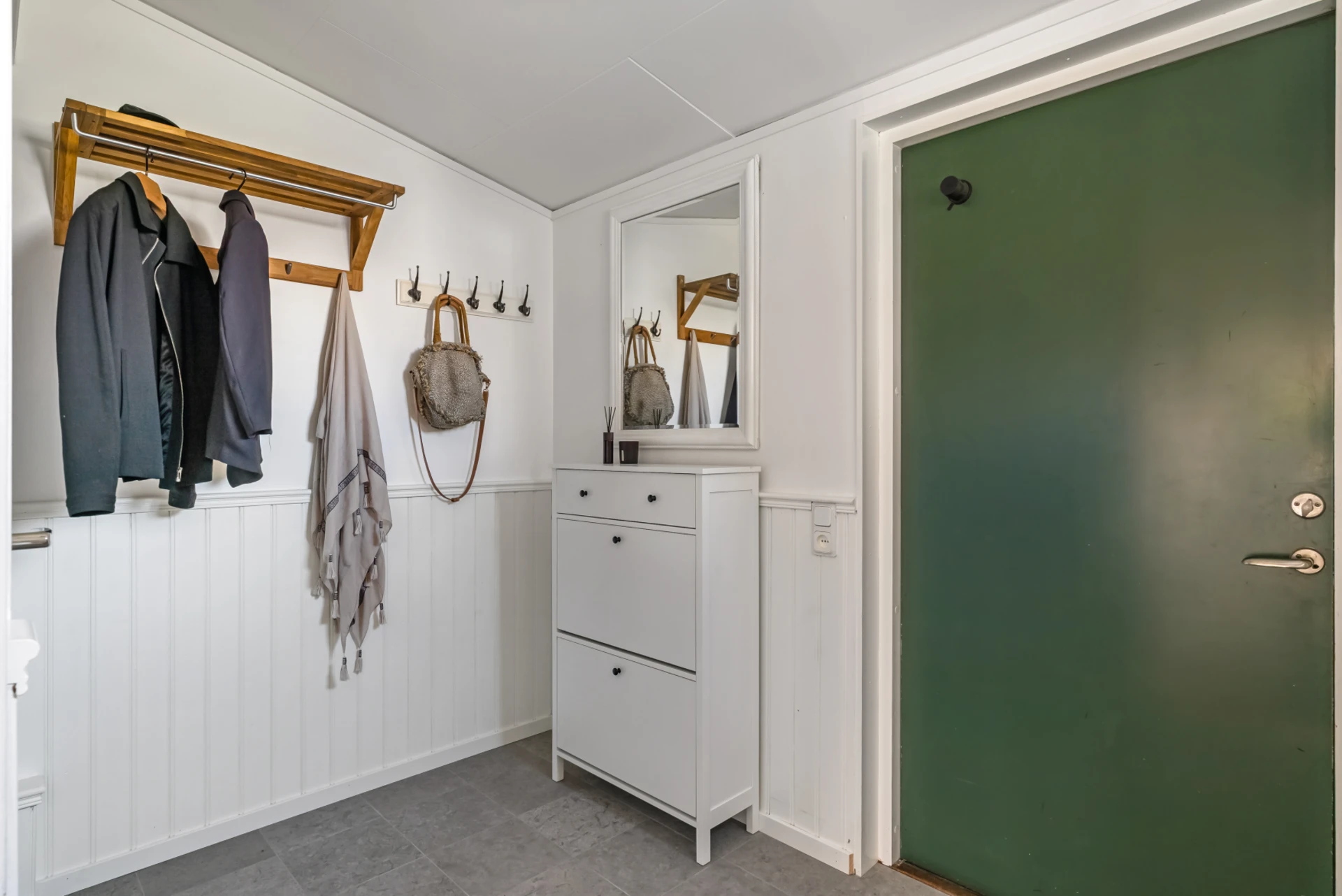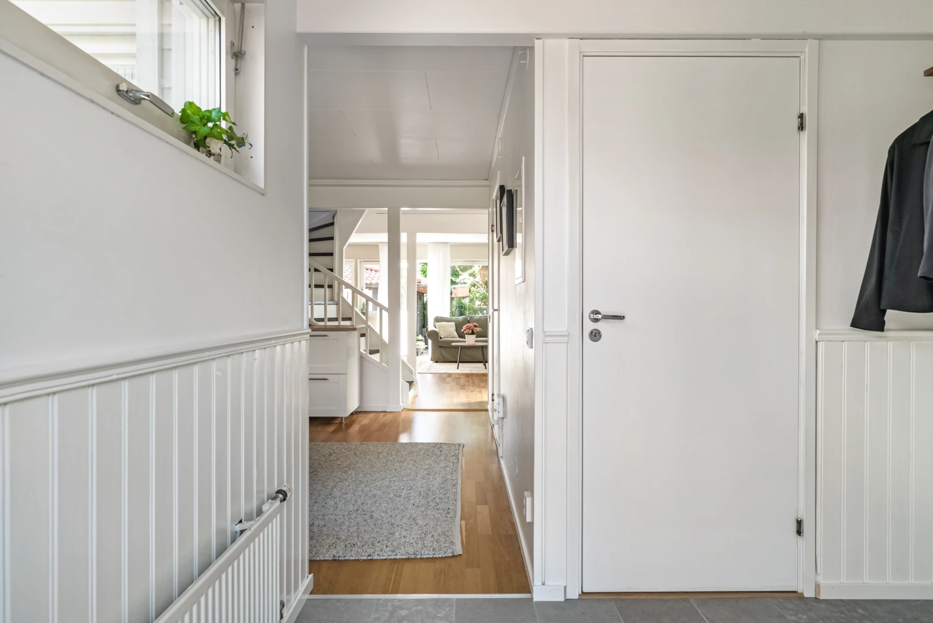 Välkomnande hall med klinkergolv, sobert målade väggar med vacker bröstpanel. Bra avhägning- samt förvaringsmöjligheter.