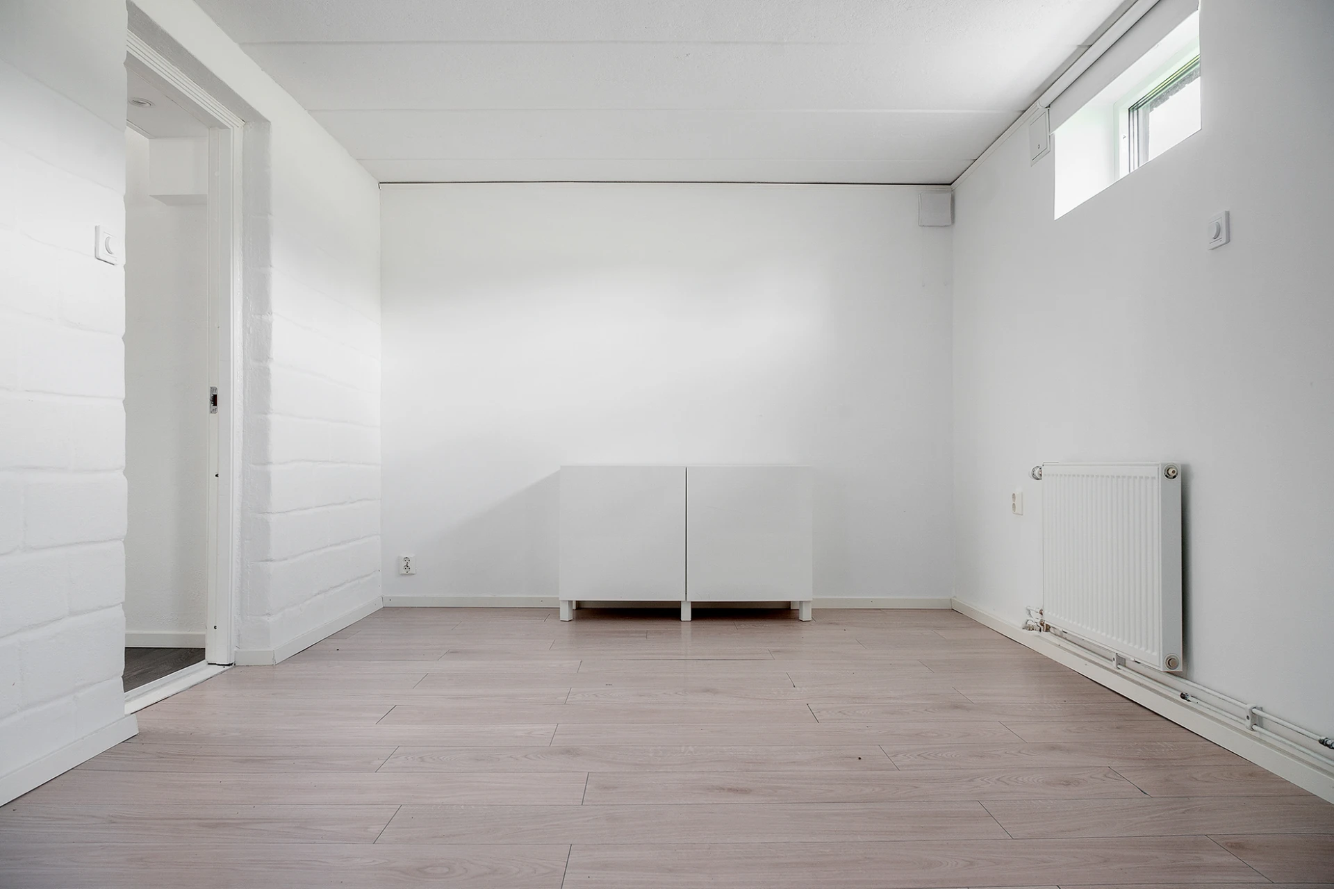 Trivsamt rum med ljusinsläpp via fönster i källarplan, lämpligt som sovrum eller gästrum.
