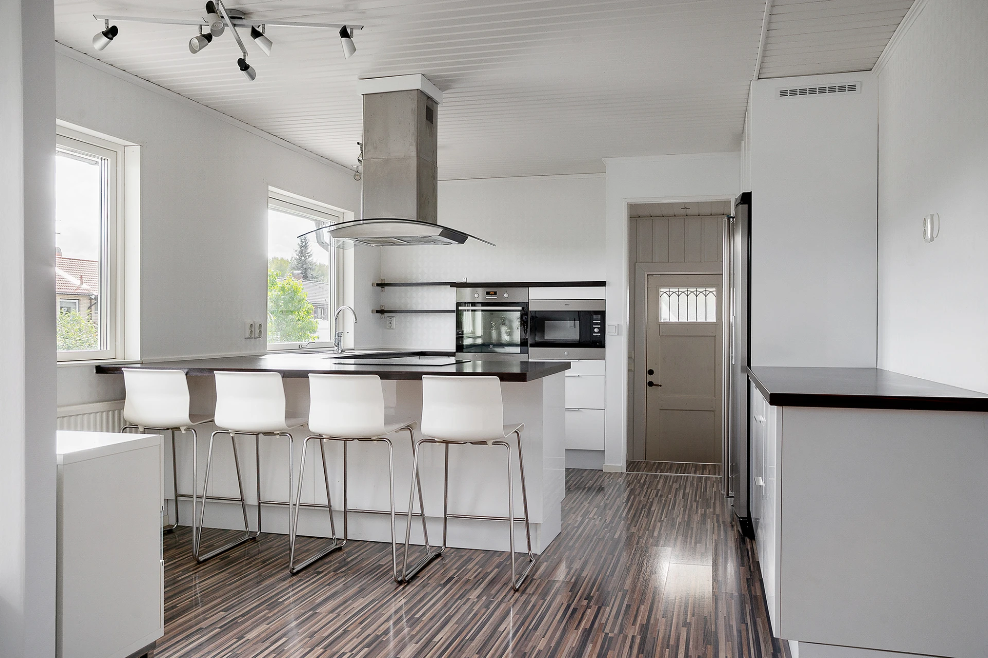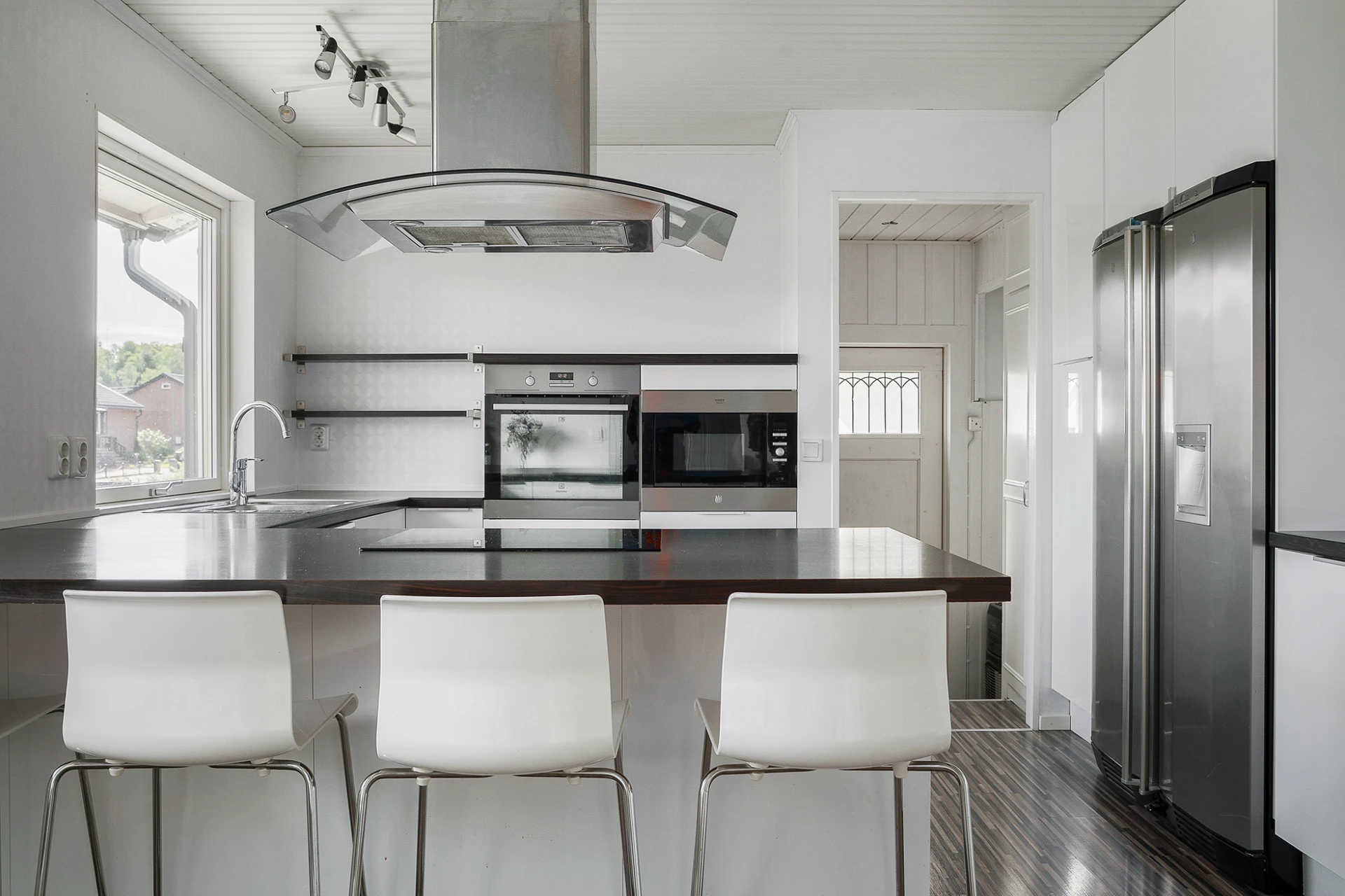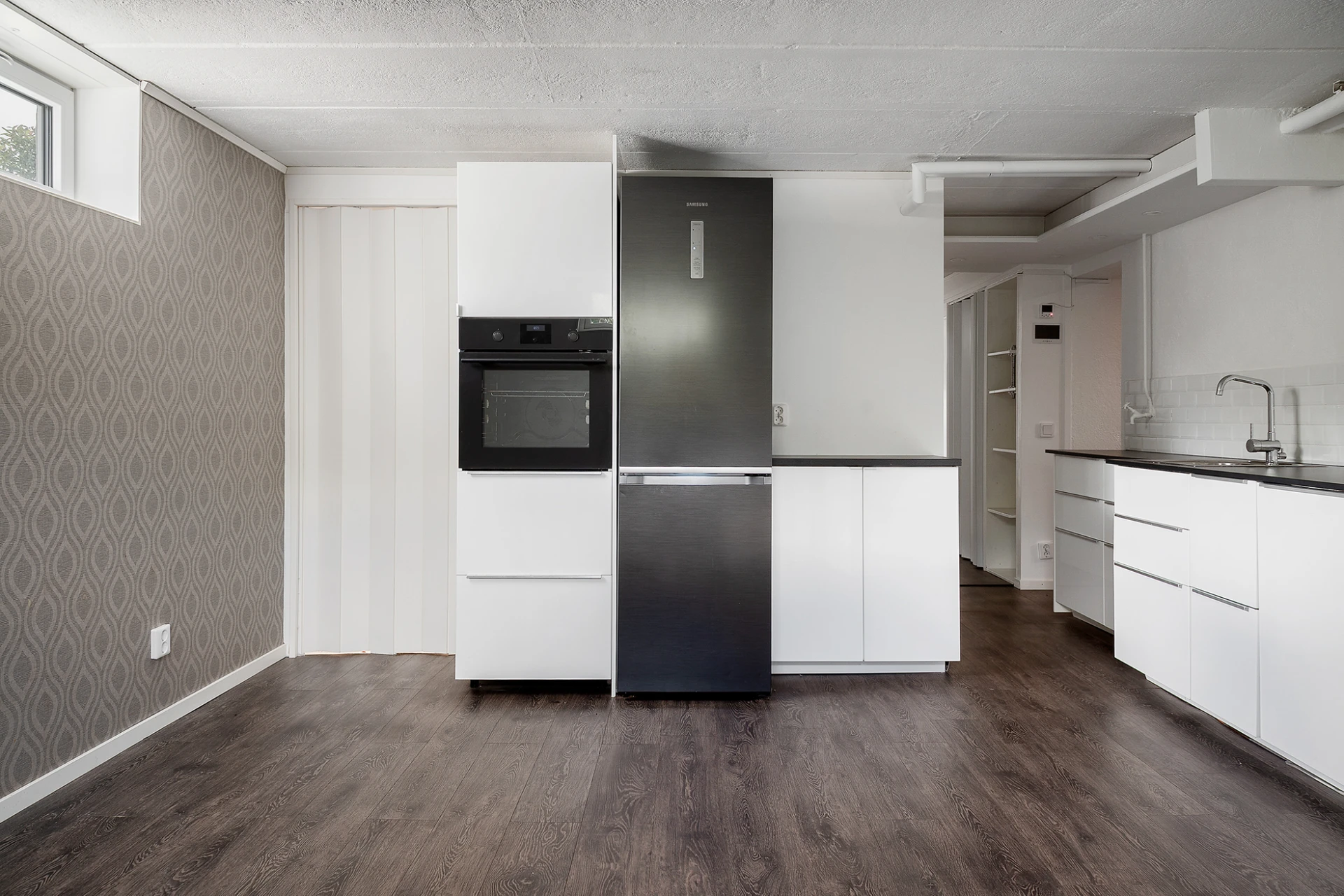 Praktiskt kök med modern inredning, spishäll, ugn, fläkt samt kyl/frys. Perfekt för tonårsbarn, gäster eller uthyrning.