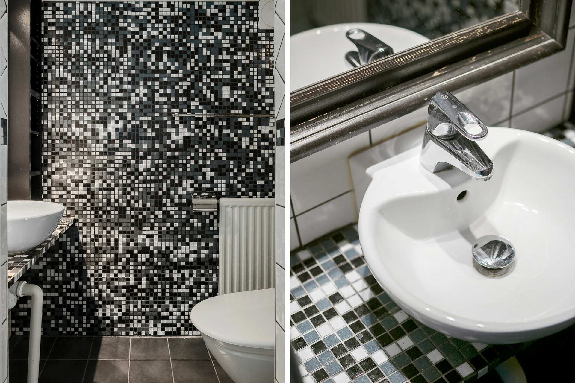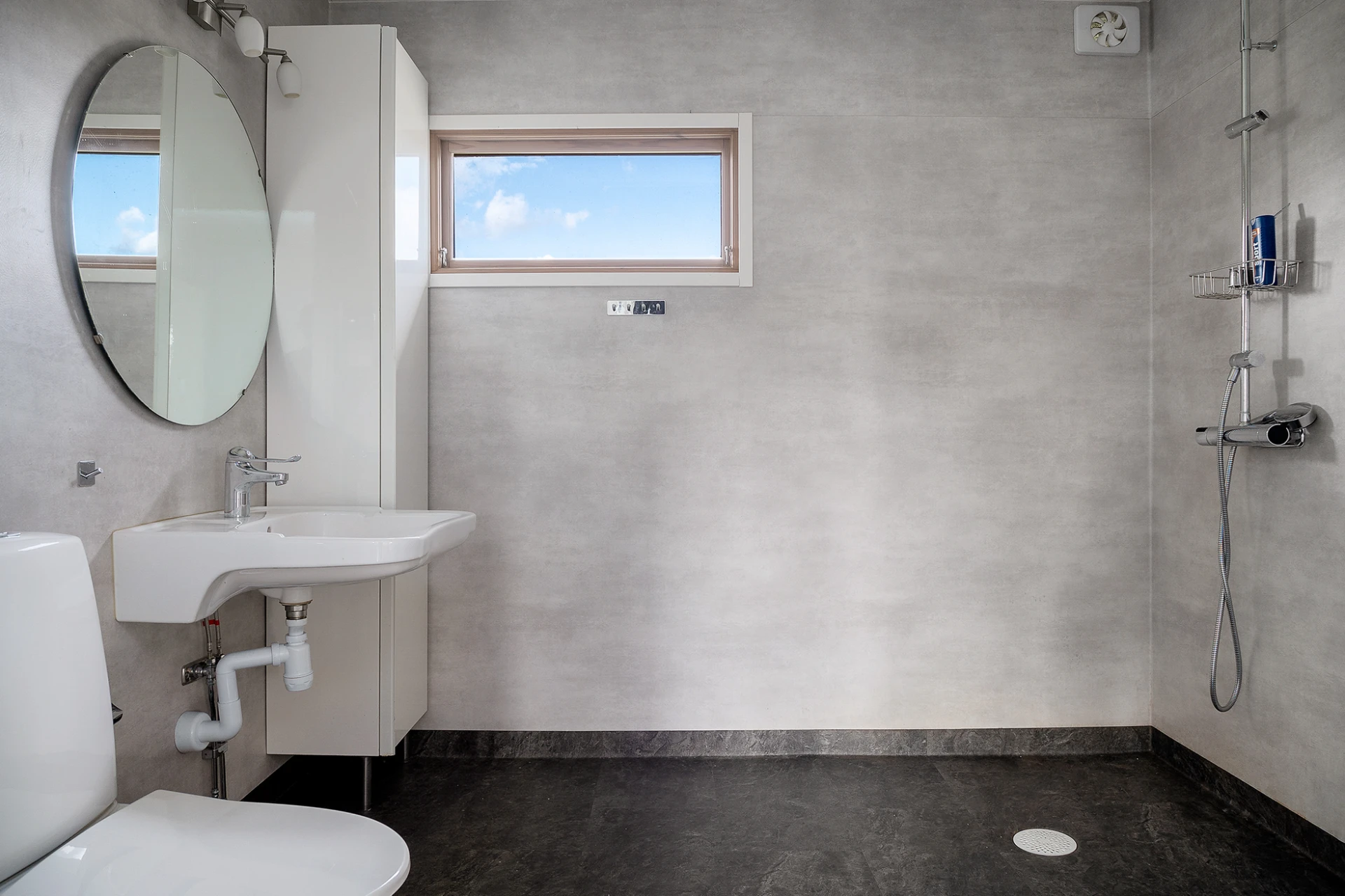 Praktiskt badrum placerat intill sovrummen. Inrett med duschhörna, handfat i kommod med spegelskåp ovan, wc samt handdukstork.