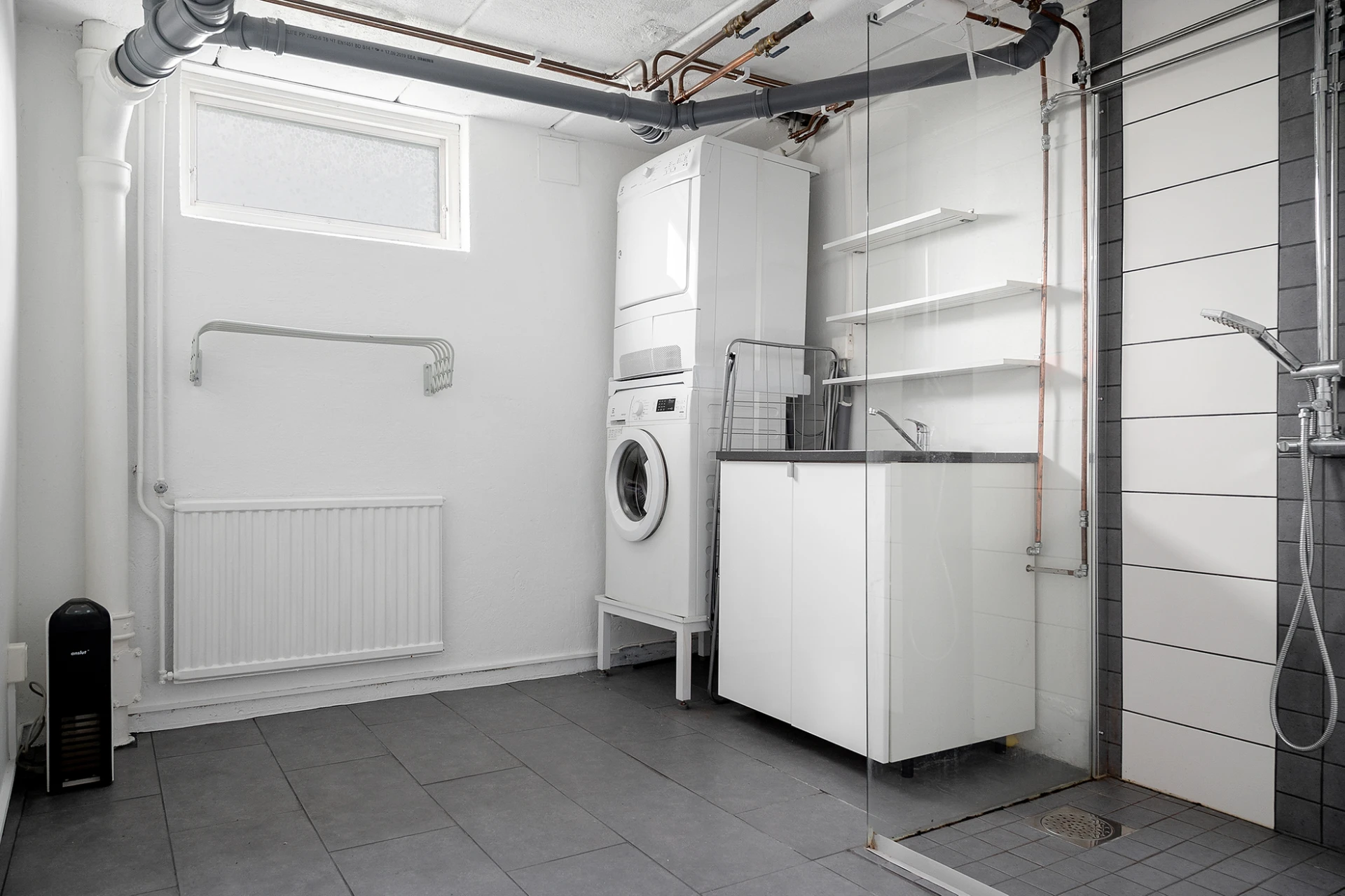 Rymlig tvättstuga utrustad med tvättmaskin, torktumlare, tvättbänk samt förvaringsmöjligheter.