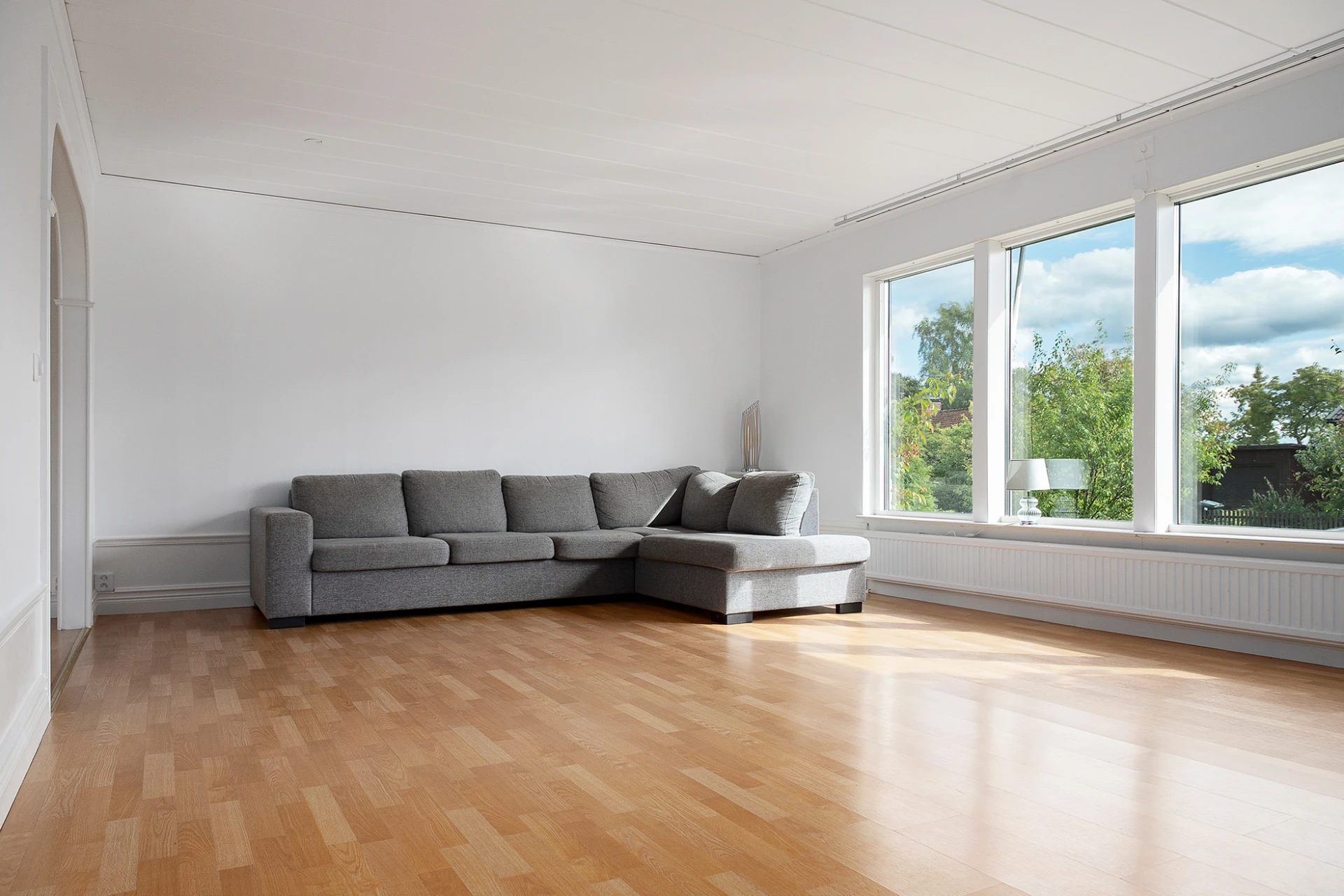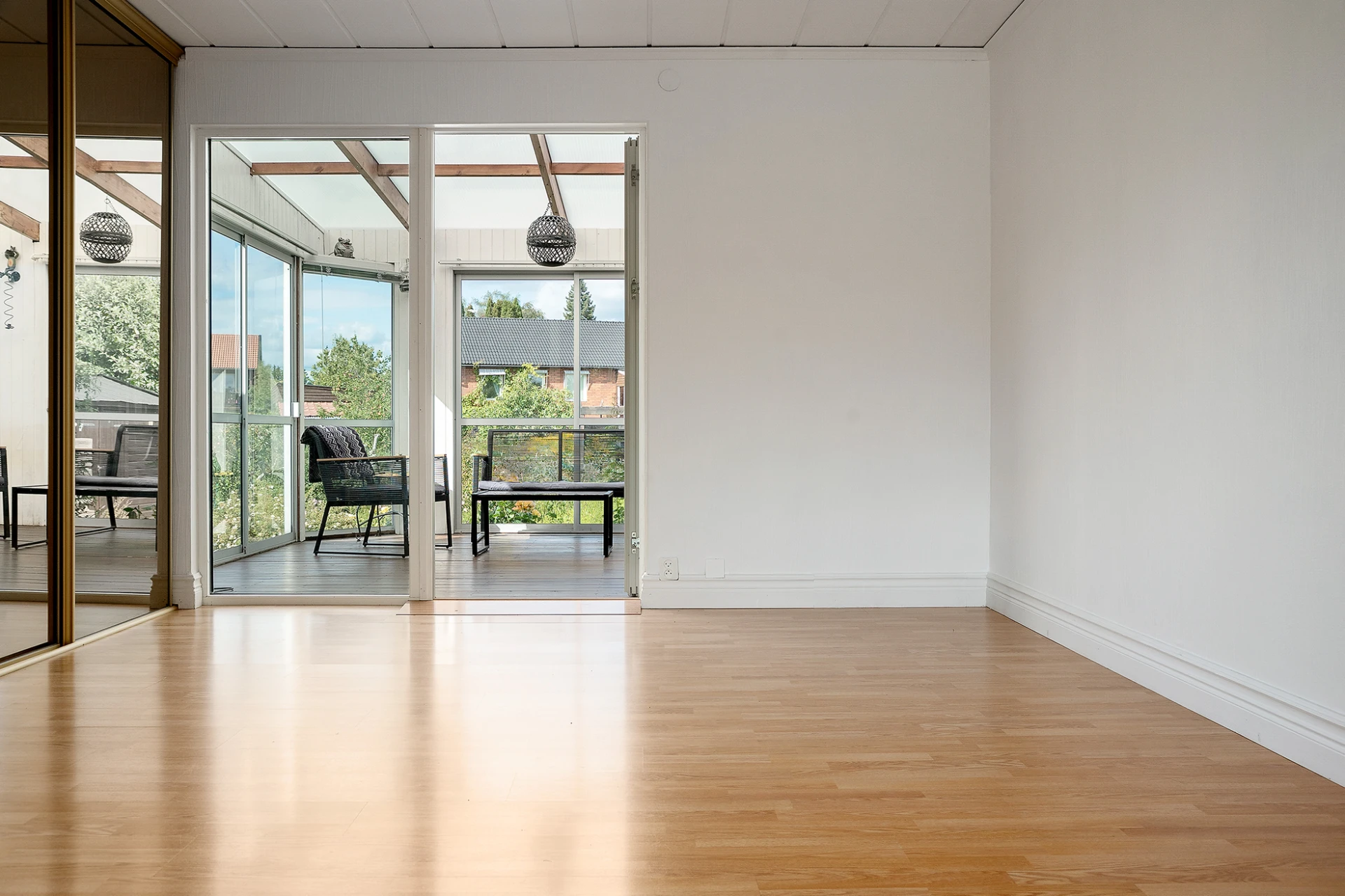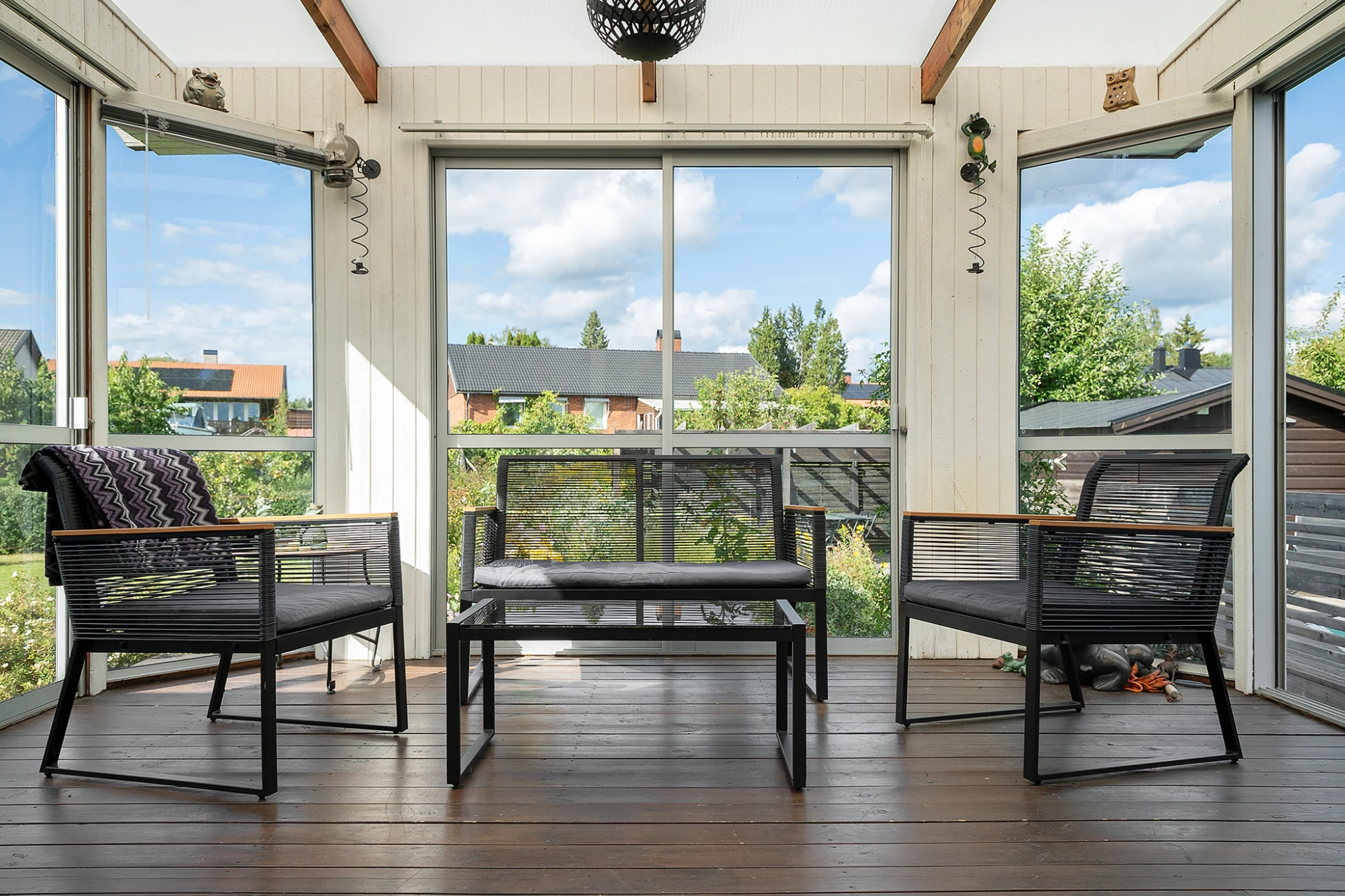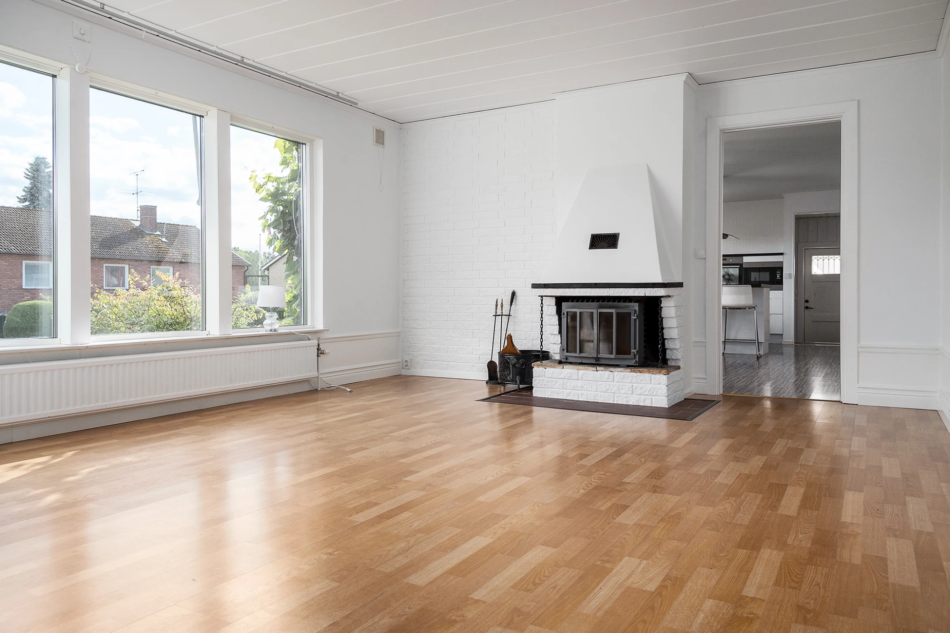Stort och lättmöblerat vardagsrum med fint ljusinsläpp från flera fönsterpartier. Här finns plats för både soffgrupp och matsalsdel. Centralt placerad öppen spis bidrar till extra värme och trivsel. Från vardagsrummet nås det inglasade uterummet som förlänger säsongen och ger extra boyta större delen av året.