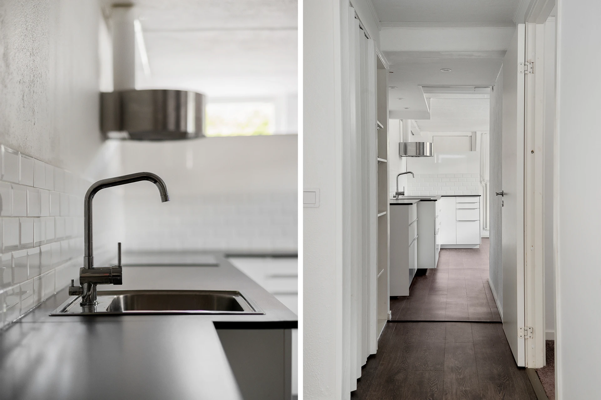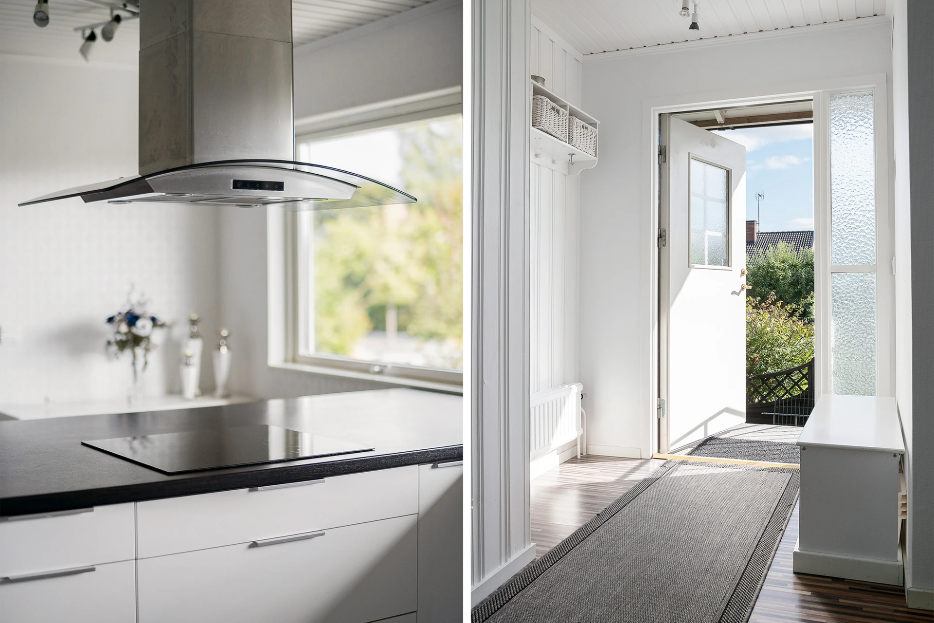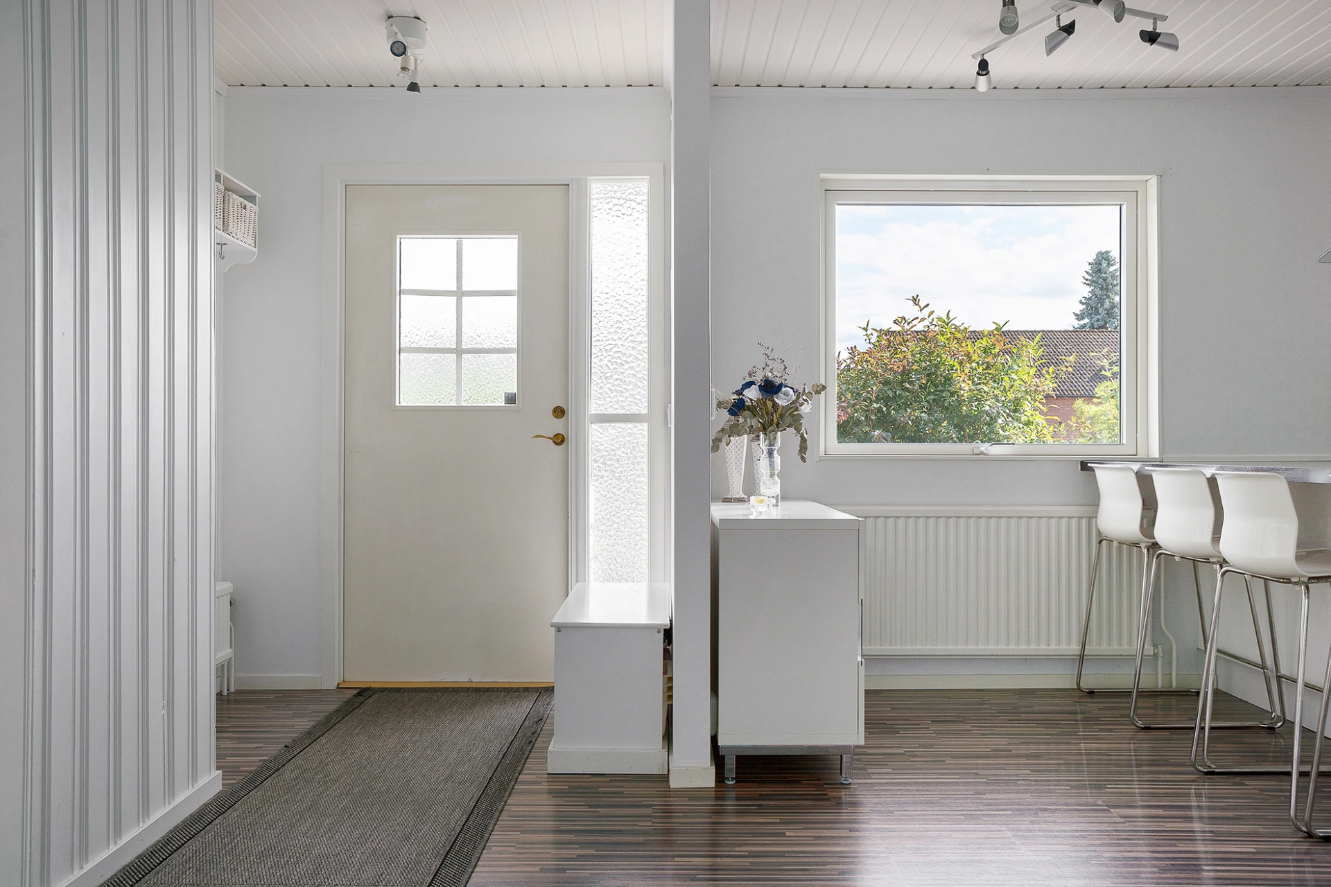 Välkomnande hall med gott om plats för avhängning av ytterkläder och skor. Ljusa ytskikt i kombination med fönsterparti vid entrén gör att rummet upplevs ljust och inbjudande. Härifrån nås både vardagsrum, kök och bostadens privata del med sovrum och badrum.