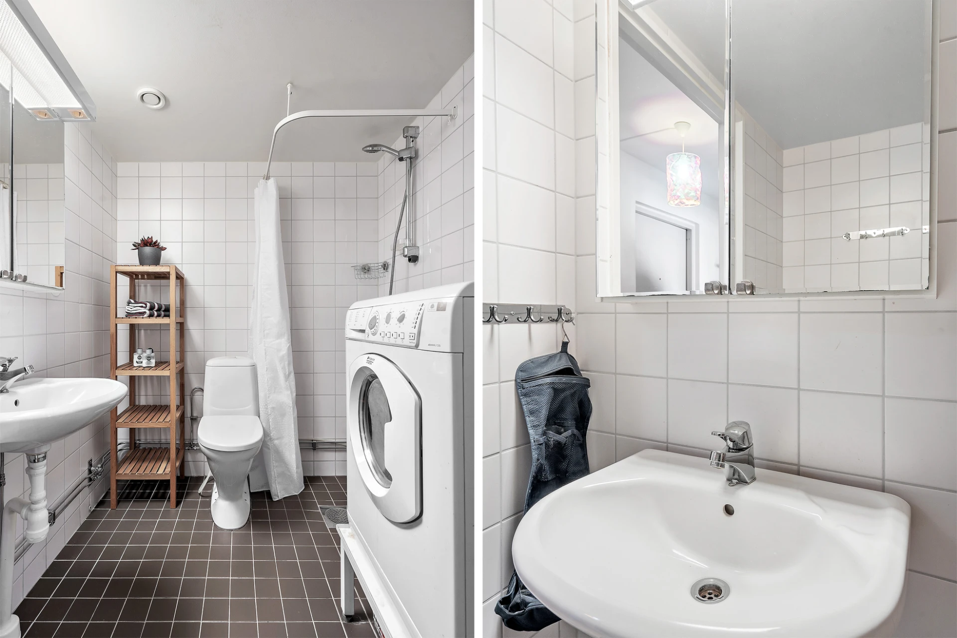 I hus 11 finns två tvättstugor med två tvättmaskiner, en torktumlare, ett torkskåp samt en mangel i vardera. Hus 13 har en liten tvättstuga med en tvättmaskin och en torktumlare. Samtliga tvättstugor kan nyttjas av alla boende. Bokning sker med cylinder/kolv som sedan flyttas till parkering eller ny bokning efter avslutad tvätt. Har man inte påbörjat tvättning inom en timme förlorar man bokningen.